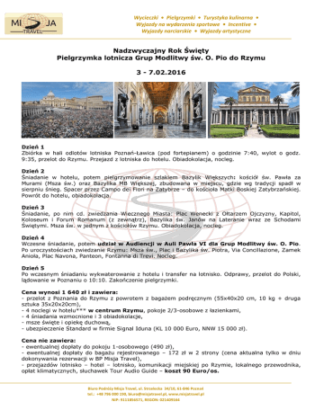 Wycieczki • Pielgrzymki • Turystyka kulinarna • Wyjazdy na wydarzenia sportowe • Incentive • Wyjazdy narciarskie • Wyjazdy artystyczne Nadzwyczajny Rok Święty Pielgrzymka lotnicza Grup Modlitwy św. O. Pio do Rzymu 3 - 7.02.2016 Dzień 1 Zbiórka w hali odlotów lotniska Poznań-Ławica (pod fortepianem) o godzinie 7:40, wylot o godz. 9:35, przelot do Rzymu. Przejazd z lotniska do hotelu. Obiadokolacja, nocleg. Dzień 2 Śniadanie w hotelu, potem pielgrzymowanie szlakiem Bazylik Większych: kościół św. Pawła za Murami (Msza św.) oraz Bazylika MB Większej, zbudowana w miejscu, gdzie wg tradycji spadł w sierpniu śnieg. Spacer przez Campo dei Fiori na Zatybrze – do kościoła Matki Boskiej Zatybrzańskiej. Powrót do hotelu, obiadokolacja. Dzień 3 Śniadanie, po nim cd. zwiedzania Wiecznego Miasta: Plac Wenecki z Ołtarzem Ojczyzny, Kapitol, Koloseum i Forum Romanum (z zewnątrz), Bazylika św. Janów na Lateranie wraz ze Schodami Świętymi. Msza św. w jednym z kościołów Rzymu. Obiadokolacja, nocleg. Dzień 4 Wczesne śniadanie, potem udział w Audiencji w Auli Pawła VI dla Grup Modlitwy św. O. Pio. Po uroczystościach zwiedzanie Rzymu: Msza św., Plac i Bazylika św. Piotra, Via Concillazione, Zamek Anioła, Plac Navona, Panteon, Fontanna di Trevi. Nocleg. Dzień 5 Po wczesnym śniadaniu wykwaterowanie z hotelu i transfer na lotnisko. Odprawy, przelot do Polski, lądowanie w Poznaniu o 10:10. Zakończenie pielgrzymki. Cena wynosi 1 640 zł i zawiera: - przelot z Poznania do Rzymu z powrotem z bagażem podręcznym (55x40x20 cm, 10 kg + druga sztuka 35x20x20cm), - 4 noclegi w hotelu*** w centrum Rzymu, pokoje 2/3-osobowe z łazienkami, - 4 śniadania wzmocnione i 3 obiadokolacje, - msze święte i opiekę duchową, - ubezpieczenie Standard w firmie Signal Iduna (KL 10 000 Euro, NNW 15 000 zł). Cena nie zawiera: - ewentualnej dopłaty do pokoju 1-osobowego (490 zł), - ewentualnej dopłaty do bagażu rejestrowanego – 172 zł w 2 strony (cena aktualna tylko w dniu dokonywania rezerwacji w BP Misja Travel), - przejazdów lotnisko – hotel – lotnisko, komunikacji miejskiej po Rzymie, lokalnego przewodnika, opłat klimatycznych, słuchawek Tour Audio Guide – koszt 90 Euro/os. Biuro Podróży Misja Travel, ul. Strzelecka 34/10, 61-846 Poznań tel.: +48 796 000 190, [email protected], www.misjatravel.pl NIP: 9111856571, REGON: 021409164