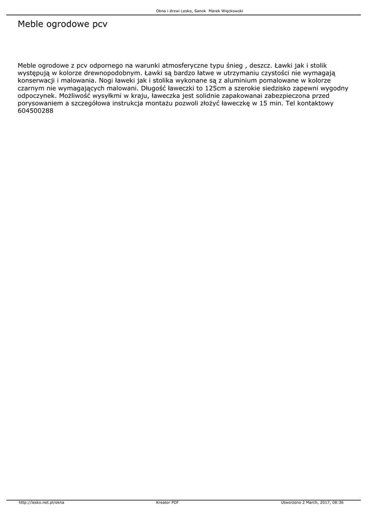 Okna i drzwi Lesko, Sanok Marek Więckowski Meble ogrodowe pcv Meble ogrodowe z pcv odpornego na warunki atmosferyczne typu śnieg , deszcz. Ławki jak i stolik występują w kolorze drewnopodobnym. Ławki są bardzo łatwe w utrzymaniu czystości nie wymagają konserwacji i malowania. Nogi ławeki jak i stolika wykonane są z aluminium pomalowane w kolorze czarnym nie wymagających malowani. Długość ławeczki to 125cm a szerokie siedzisko zapewni wygodny odpoczynek. Możliwość wysyłkmi w kraju, ławeczka jest solidnie zapakowanai zabezpieczona przed porysowaniem a szczegółowa instrukcja montażu pozwoli złożyć ławeczkę w 15 min. Tel kontaktowy 604500288 http://lesko.net.pl/okna Kreator PDF Utworzono 2 March, 2017, 08:36