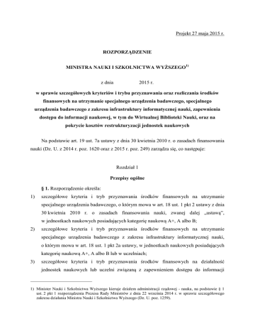 Projekt 27 maja 2015 r. ROZPORZĄDZENIE MINISTRA NAUKI I SZKOLNICTWA WYŻSZEGO1) z dnia 2015 r. w sprawie szczegółowych kryteriów i trybu przyznawania oraz rozliczania środków finansowych na utrzymanie specjalnego urządzenia badawczego, specjalnego urządzenia badawczego z zakresu infrastruktury informatycznej nauki, zapewnienia dostępu do informacji naukowej, w tym do Wirtualnej Biblioteki Nauki, oraz na pokrycie kosztów restrukturyzacji jednostek naukowych Na podstawie art. 19 ust. 7a ustawy z dnia 30 kwietnia 2010 r. o zasadach finansowania nauki (Dz. U. z 2014 r. poz. 1620 oraz z 2015 r. poz. 249) zarządza się, co następuje: Rozdział 1 Przepisy ogólne § 1. Rozporządzenie określa: 1) szczegółowe kryteria i tryb przyznawania środków finansowych na utrzymanie specjalnego urządzenia badawczego, o którym mowa w art. 18 ust. 1 pkt 2 ustawy z dnia 30 kwietnia 2010 r. o zasadach finansowania nauki, zwanej dalej „ustawą”, w jednostkach naukowych posiadających kategorię naukową A+, A albo B; 2) szczegółowe kryteria i tryb przyznawania środków finansowych na utrzymanie specjalnego urządzenia badawczego z zakresu infrastruktury informatycznej nauki, o którym mowa w art. 18 ust. 1 pkt 2a ustawy, w jednostkach naukowych posiadających kategorię naukową A+, A albo B lub w uczelniach; 3) szczegółowe kryteria i tryb przyznawania środków finansowych na działalność jednostek naukowych lub uczelni związaną z zapewnieniem dostępu do informacji 1) Minister Nauki i Szkolnictwa Wyższego kieruje działem administracji rządowej - nauka, na podstawie § 1 ust. 2 pkt 1 rozporządzenia Prezesa Rady Ministrów z dnia 22 września 2014 r. w sprawie szczegółowego zakresu działania Ministra Nauki i Szkolnictwa Wyższego (Dz. U. poz. 1259). –2– naukowej, w szczególności do systemów udostępniających informacje o wynikach badań naukowych, publikacjach i monografiach, w tym do Wirtualnej Biblioteki Nauki – systemu udostępniania w formie elektronicznej naukowych baz danych oraz publikacji naukowych; 4) szczegółowe kryteria i tryb przyznawania środków na finansowanie kosztów restrukturyzacji jednostek naukowych posiadających kategorię naukową A+, A, B albo C, oraz rodzaje tych kosztów; 5) tryb rozliczania przyznanych środków finansowych; 6) szczegółowy zakres informacji zawartych we wnioskach o przyznanie środków finansowych oraz w raporcie rocznym i raporcie końcowym z wykorzystania przyznanych środków finansowych wraz z rozliczeniem finansowym poniesionych kosztów. § 2. 1. Minister właściwy do spraw nauki, zwany dalej „Ministrem”, przyznaje środki finansowe na cele, o których mowa w art. 18 ust. 1 pkt 1a, 2, 2a i 4 ustawy, na podstawie wniosku jednostki naukowej, a w przypadku zadań, o których mowa w art. 18 ust. 1 pkt 2a i 4 ustawy – również wniosku uczelni, zawierającego informacje, których szczegółowy zakres określa odpowiednio: 1) w przypadku ubiegania się o środki finansowe na utrzymanie specjalnego urządzenia badawczego – załącznik nr 1 do rozporządzenia; 2) w przypadku ubiegania się o środki finansowe na utrzymanie specjalnego urządzenia badawczego w zakresie infrastruktury informatycznej nauki – załącznik nr 2 do rozporządzenia; 3) w przypadku ubiegania się o środki finansowe na działalność związaną z zapewnieniem dostępu do informacji naukowej, w tym do Wirtualnej Biblioteki Nauki – załącznik nr 3 do rozporządzenia; 4) w przypadku ubiegania się o środki finansowe na koszty restrukturyzacji – załącznik nr 4 do rozporządzenia. 2. Jednostka naukowa składa wniosek o przyznanie środków finansowych, o których mowa w ust. 1 pkt 1–3, w terminie do dnia 15 września roku poprzedzającego rok, na który mają być one przyznane. Wniosek o przyznanie środków finansowych, o których mowa w ust. 1 pkt 4, może być złożony przez jednostkę naukową w każdym czasie. 3. Wniosek, o którym mowa w ust. 1, jednostka naukowa składa w systemie teleinformatycznym w rozumieniu art. 3 pkt 3 ustawy z dnia 17 lutego 2005 r. –3– o informatyzacji działalności podmiotów realizujących zadania publiczne (Dz. U. z 2014 r. poz. 114), wskazanym na stronie internetowej urzędu obsługującego Ministra, zwanym dalej „systemem”. 5. W terminach, o których mowa w ust. 2, jednostka naukowa składa w formie dokumentu elektronicznego podpisanego podpisem potwierdzonym profilem zaufanym ePUAP w rozumieniu ustawy z dnia 17 lutego 2005 r. o informatyzacji działalności podmiotów realizujących zadania publiczne albo bezpiecznym podpisem elektronicznym weryfikowanym za pomocą ważnego kwalifikowanego certyfikatu w rozumieniu ustawy z dnia 18 września 2001 r. o podpisie elektronicznym (Dz. U. z 2013 r. poz. 262) albo w postaci papierowej, informację, określoną odpowiednio w części A załącznika nr 1, 2, 3 albo 4 do rozporządzenia. § 3. Do rozpatrzenia są kierowane wyłącznie wnioski kompletne, spełniające wymagania formalne określone w rozporządzeniu. W przypadku złożenia wniosku niespełniającego tych wymagań, wzywa się jednostkę naukową, za pośrednictwem systemu, do usunięcia braków formalnych w terminie 14 dni od dnia otrzymania wezwania, z pouczeniem, że ich nieusunięcie spowoduje pozostawienie wniosku bez rozpoznania. § 4. 1. Wnioski, o których mowa w § 2 ust. 1, są oceniane przez zespół, powołany przez Ministra na podstawie art. 52 ust. 1 ustawy, zwany dalej „zespołem”. 2. Zespół przekazuje Ministrowi ocenę wniosku w terminie nie dłuższym niż 60 dni od dnia przekazania wniosku do oceny. 3. Ocena zawiera propozycję wysokości dotacji albo odmowy przyznania dotacji wraz z uzasadnieniem. W przypadku gdy proponowana kwota dotacji jest niższa od wnioskowanej, zespół przedstawia szczegółowe uzasadnienie tej propozycji. Rozdział 2 Szczegółowe kryteria i tryb przyznawania środków finansowych § 5. Przy przyznawaniu środków finansowych 