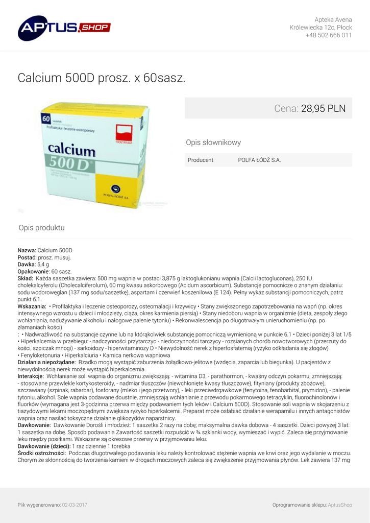Apteka Avena Królewiecka 12c, Płock +48 502 666 011 Calcium 500D prosz. x 60sasz. Cena: 28,95 PLN Opis słownikowy Producent POLFA ŁÓDŹ S.A. Opis produktu Nazwa: Calcium 500D Postać: prosz. musuj. Dawka: 5,4 g Opakowanie: 60 sasz. Skład: Każda saszetka zawiera: 500 mg wapnia w postaci 3,875 g laktoglukonianu wapnia (Calcii lactogluconas), 250 IU cholekalcyferolu (Cholecalciferolum), 60 mg kwasu askorbowego (Acidum ascorbicum). Substancje pomocnicze o znanym działaniu: sodu wodorowęglan (137 mg sodu/saszetkę), aspartam i czerwień koszenilowa (E 124). Pełny wykaz substancji pomocniczych, patrz punkt 6.1. Wskazania: • Profilaktyka i leczenie osteoporozy, osteomalacji i krzywicy • Stany zwiększonego zapotrzebowania na wapń (np. okres intensywnego wzrostu u dzieci i młodzieży, ciąża, okres karmienia piersią) • Stany niedoboru wapnia w organizmie (dieta, zespoły złego wchłaniania, nadużywanie alkoholu i nałogowe palenie tytoniu) • Rekonwalescencja po długotrwałym unieruchomieniu (np. po złamaniach kości) : • Nadwrażliwość na substancje czynne lub na którąkolwiek substancję pomocniczą wymienioną w punkcie 6.1 • Dzieci poniżej 3 lat 1/5 • Hiperkalcemia w przebiegu: - nadczynności przytarczyc - niedoczynności tarczycy - rozsianych chorób nowotworowych (przerzuty do kości, szpiczak mnogi) - sarkoidozy - hiperwitaminozy D • Niewydolność nerek z hiperfosfatemią (ryzyko odkładania się złogów) • Fenyloketonuria • Hiperkalciuria • Kamica nerkowa wapniowa Działania niepożądane: Rzadko mogą wystąpić zaburzenia żołądkowo-jelitowe (wzdęcia, zaparcia lub biegunka). U pacjentów z niewydolnością nerek może wystąpić hiperkalcemia. Interakcje: Wchłanianie soli wapnia do organizmu zwiększają: - witamina D3, - parathormon, - kwaśny odczyn pokarmu; zmniejszają: - stosowane przewlekle kortykosteroidy, - nadmiar tłuszczów (niewchłonięte kwasy tłuszczowe), fityniany (produkty zbożowe), szczawiany (szpinak, rabarbar), fosforany (mleko i jego przetwory), - leki przeciwdrgawkowe (fenytoina, fenobarbital, prymidon), - palenie tytoniu, alkohol. Sole wapnia podawane doustnie, zmniejszają wchłanianie z przewodu pokarmowego tetracyklin, fluorochinolonów i fluorków (wymagana jest 3-godzinna przerwa między podawaniem tych leków i Calcium 500D). Stosowanie soli wapnia w skojarzeniu z tiazydowymi lekami moczopędnymi zwiększa ryzyko hiperkalcemii. Preparat może osłabiać działanie werapamilu i innych antagonistów wapnia oraz nasilać toksyczne działanie glikozydów naparstnicy. Dawkowanie: Dawkowanie Dorośli i młodzież: 1 saszetka 2 razy na dobę; maksymalna dawka dobowa - 4 saszetki. Dzieci powyżej 3 lat: 1 saszetka na dobę. Sposób podawania Zawartość saszetki rozpuścić w ¾ szklanki wody, wymieszać i wypić. Zaleca się przyjmowanie leku między posiłkami. Wskazane są okresowe przerwy w przyjmowaniu leku. Dawkowanie (dzieci): 1 raz dziennie 1 torebka Środki ostrożności: Podczas długotrwałego podawania leku należy kontrolować stężenie wapnia we krwi oraz jego wydalanie w moczu. Chorym ze skłonnością do tworzenia kamieni w drogach moczowych zaleca się zwiększenie przyjmowania płynów. Lek zawiera 137 mg Plik wygenerowano: 02-03-2017 Oprogramowanie sklepu: AptusShop Apteka Avena Królewiecka 12c, Płock +48 502 666 011 sodu na dawkę (saszetkę), należy wziąć pod uwagę u pacjentów ze zmniejszoną czynnością nerek i u pacjentów kontrolujących zawartość sodu w diecie. Lek zawiera aspartam – źródło fenyloalaniny. Może być szkodliwy dla pacjentów z fenyloketonurią. Lek zawiera czerwień koszenilową (E 124) – lek może powodować reakcje alergiczne. Prowadzenie pojazdów: Dotychczas nie zaobserwowano niekorzystnego wpływu leku Calcium 500D na zdolność prowadzenia pojazdów mechanicznych i obsługiwania urządzeń mechanicznych w ruchu. Przedawkowanie: Przy długotrwałym stosowaniu leku w dużych dawkach mogą pojawić się objawy hiperkalcemii takie jak: brak łaknienia, wzmożone pragnienie, nudności, zaparcia, wielomocz, bóle brzucha i kości oraz zaburzenia neurologiczne. Leczenie Należy przerwać stosowanie produktu leczniczego Calcium 500D. W przypadku znacznego przedawkowania leku pacjent wymaga hospitalizacji. Stosować należy typowe dla tego rodzaju zatruć leki: wlewy z 0,45% roztworu chlorku sodu, 5% roztworu glukozy w ilości 2-3 litrów na dobę, preparaty potasu, wodorowęglan sodu, furosemid, glikokortykosteroidy, kalcytoninę w dawce 200-400 IU/dobę, fosforany nieorganiczne w dawce 4,0 g/dobę. Ciąża: Nie wiadomo, czy Calcium 500D może powodować zagrożenie dla płodu u zwierząt, ponieważ nie przeprowadzono odpowiednich badań. Nie przeprowadzono też odpowiednio liczebnych, kontrolowanych obserwacji u człowieka. Lek może być stosowany w okresie ciąży jedynie w przypadkach, gdy w opinii lekarza korzyść dla matki przeważa nad potencjalnym zagrożeniem dla płodu. Witaminy C i D przenikają do mleka kobiecego, dlatego należy zachować ostrożność podczas stosowania u kobiet karmiących piersią. Plik wygenerowano: 02-03-2017 Powered by TCPDF (www.tcpdf.org) Oprogramowanie sklepu: AptusShop
