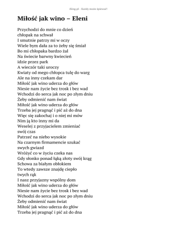 iSing.pl - Każdy może śpiewać! Miłość jak wino – Eleni Przychodzi do mnie co dzień chłopak na schwał I smutnie patrzy mi w oczy Wiele bym dała za to żeby się śmiał Bo mi chłopaka bardzo żal Na świecie barwny kwiecień idzie przez park A wieczór taki uroczy Kwiaty od mego chłopca tulę do warg Ale na inny czekam dar Miłość jak wino uderza do głów Niesie nam życie bez trosk i bez wad Wchodzi do serca jak noc po złym dniu Żeby odmienić nam świat Miłość jak wino uderza do głów Trzeba jej pragnąć i pić aż do dna Więc się zakochaj i o niej mi mów Nim ją kto inny mi da Weselej z przyjacielem zmieniać swój czas Patrzeć na niebo wysokie Na czarnym firmamencie szukać swych gwiazd Wróżyć co w życiu czeka nas Gdy słonko ponad łąką złoty swój krąg Schowa za białym obłokiem To wtedy zawsze znajdę ciepło twych rąk I nasz przyjazny wspólny dom Miłość jak wino uderza do głów Niesie nam życie bez trosk i bez wad Wchodzi do serca jak noc po złym dniu Żeby odmienić nam świat Miłość jak wino uderza do głów Trzeba jej pragnąć i pić aż do dna Więc się zakochaj i o niej mi mów Nim ją kto inny mi da Miłość jak wino uderza do głów Niesie nam życie bez trosk i bez wad Wchodzi do serca jak noc po złym dniu Żeby odmienić nam świat Miłość jak wino uderza do głów Trzeba jej pragnąć i pić aż do dna Więc się zakochaj i o niej mi mów Nim ją kto inny mi da Miłość jak wino uderza do głów Niesie nam życie bez trosk i bez wad Słowa: KONOPIŃSKI LECH KAZIMIERZ Muzyka: DZOKAS KOSTAS Rok wydania: 1987 Płyta: Miłość jak wino