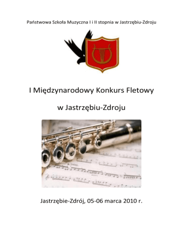 Państwowa Szkoła Muzyczna I i II stopnia w Jastrzębiu-Zdroju I Międzynarodowy Konkurs Fletowy w Jastrzębiu-Zdroju Jastrzębie-Zdrój, 05-06 marca 2010 r. I MIĘDZYNARODOWY KONKURS FLETOWY w Jastrzębiu-Zdroju 5 – 6 marca 2010 r. WYKAZ LAUREATÓW: KATEGORIA I grupa I I miejsce Magdalena Chudzikiewicz – Państwowa Szkoła Muzyczna I st. im. J. Elsnera w Brzegu II miejsce Kinga Ziarnik – Państwowa Szkoła Muzyczna I st. im. G. Gorczyckiego w Rudzie Śląskiej III miejsce ex aequo Justyna Grygierek – Państwowa Szkoła Muzyczna I i II st. w Jastrzębiu-Zdroju III miejsce ex aequo Zuzanna Noga - Państwowa Szkoła Muzyczna I st. im. G. Gorczyckiego w Rudzie Śląskiej wyróżnienie Wiktoria Kudanowska – Zespół Szkół Muzycznych im. S. Moniuszki w Łodzi wyróżnienie Marlena Misiak – Państwowa Szkoła Muzyczna I i II st. w Zduńskiej Woli KATEGORIA I grupa II I miejsce Natalia Egielman – Ogólnokształcąca Szkoła Muzyczna I i II st. im. F. Nowowiejskiego w Gdańsku II miejsce Daria Branny – Państwowa Szkoła Muzyczna I i II st. im. I. Paderewskiego w Cieszynie III miejsce Kamila Stawarz - Państwowa Szkoła Muzyczna I i II st. im. I. Paderewskiego w Cieszynie wyróżnienie Paula Musiał – Państwowa Szkoła Muzyczna I st. w Wieluniu wyróżnienie Zuzanna Ostromęcka – Państwowa Szkoła Muzyczna I st. im. J. Zarębskiego w Warszawie KATEGORIA I grupa III I miejsce Lidia Barczuk - Państwowa Szkoła Muzyczna I i II st. im. I. Paderewskiego w Cieszynie II miejsce Iwona Sarwińska - Ogólnokształcąca Szkoła Muzyczna I i II st. im. F. Nowowiejskiego w Gdańsku III miejsce ex aequo Zofia Neugebauer – Samorządowa Szkoła Muzyczna II st. w Żorach III miejsce ex aequo Dominika Pilis – Państwowa Szkoła Muzyczna I i II st. w Jastrzębiu-Zdroju wyróżnienie Hanna Hojka – Państwowa Szkoła Muzyczna I i II st. w Jastrzębiu-Zdroju wyróżnienie Tomasz Sierant - Zespół Szkół Muzycznych im. S. Moniuszki w Łodzi KATEGORIA I grupa IV I miejsce nie przyznano II miejsce ex aequo Izabela Brodová – Konserwatorium Muzyczne w Ostrawie (Czechy) II miejsce ex aequo Magdalena Spleśniały - Samorządowa Szkoła Muzyczna II st. w Żorach III miejsce Weronika Skowronek – Ogólnokształcąca Szkoła Muzyczna I i II st. w Bytomiu wyróżnienie Agnieszka Danilecka - Ogólnokształcąca Szkoła Muzyczna I i II st. im. K. Szymanowskiego we Wrocławiu wyróżnienie Martha Humbert – Konserwatorium Muzyczne w Genewie (Szwajcaria) wyróżnienie Patrycja Kubiak – Zespół Szkół Muzycznych w Poznaniu wyróżnienie Geneviève Robert-Grandpierre – Konserwatorium Muzyczne w Genewie (Szwajcaria) wyróżnienie Marek Szymański - Ogólnokształcąca Szkoła Muzyczna I i II st. im. K. Szymanowskiego we Wrocławiu KATEGORIA II grupa II I miejsce - kwartet fletowy w składzie: Iwona Sarwińska, Joanna Pestka, Patrycja Walkusz, Natalia Egielman - Ogólnokształcąca Szkoła Muzyczna I i II st. im. F. Nowowiejskiego w Gdańsku II miejsce nie przyznano III miejsce – trio fletowe w składzie: Aleksandra Henszel, Aleksandra Michałko, Magdalena Lipniewska – Zespół Szkół Muzycznych II st. im. F. Nowowiejskiego w Szczecinie Państwowa Szkoła Muzyczna I i II stopnia w Jastrzębiu-Zdroju II Międzynarodowy Konkurs Fletowy w Jastrzębiu-Zdroju Jastrzębie-Zdrój, 13-14 kwietnia 2012 r. II MIĘDZYNARODOWY KONKURS FLETOWY w Jastrzębiu-Zdroju 13 - 14 kwietnia 2012 r. WYKAZ LAUREATÓW: KATEGORIA I grupa I I miejsce Oliwia Wantulok - Państwowa Szkoła Muzyczna I i II st. w Cieszynie – Filia w Wiśle II miejsce Karolina Solich – Państwowa Ogólnokształcąca Szkoła Muzyczna I i II st. im. S. Moniuszki w Bielsku-Białej III miejsce Roksana Szrubarz – Państwowa Szkoła Muzyczna I st. w Żorach KATEGORIA I grupa II Grand Prix Marianna Żołnacz – Zespół Państwowych Szkół Muzycznych im. K. Szymanowskiego w Warszawie III miejsce ex aequo Jan Chłap – Zespół Szkół Muzycznych im. I. Paderewskiego w Krośnie III miejsce ex aequo Ruta Vaytkute – Children Music School – Kaliningrad (Rosja) wyróżnienie Hanna Woźniak – Zespół Państwowych Ogólnokształcących Szkół Muzycznych I I II st. im. G. Bacewicz w Warszawie KATEGORIA I grupa III I miejsce ex aequo Jagoda Krzemińska – Państwowa Szkoła Muzyczna I i II st. im. F. Chopina w Opolu I miejsce ex aequo Daria Branny – Państwowa Szkoła Muzyczna I i II st. im. I. Paderewskiego w Cieszynie II miejsce Andrey Krivenko – Rachmaninov Music College – Kaliningrad (Rosja) III miejsce Štěpánka Hajná – Janáček Conservatoire and Grammar School – Ostrava (Czechy) wyróżnienie Natalia Egielman – Ogólnokształcąca Szkoła Muzyczna I i II st. im. F. Nowowiejskiego w Gdańśku wyróżnienie Sylwia Kałuża - Państwowa Szkoła Muzyczna I i II st. im. F. Chopina w Opolu wyróżnienie Ada Orlikowska – Zespół Państwowych Ogólnokształcących Szkół Muzycznych im. K. Szymanowskiego w Katowicach KATEGORIA I grupa IV I miejsce Rute Fernandes – Haute École de Musique – Genève (Szwajcaria) II miejsce Zofia Neugebauer – Ogólnokształcąca Szkoła Muzyczna I i II st. im. K. Szymanowskiego we Wrocławiu III miejsce Justyna Adamczyk – Zespół Szkół Muzycznych im. S. Moniuszki w Wałbrzychu wyróżnienie Sylvie Schelingerová - Conservatoire – Praha (Czechy) wyróżnienie Barbora Haasová – Konzervatoř – Plzeň (Czechy) KATEGORIA II grupa I II miejsce kwartet fletowy: Julia Hudasz, Zuzanna Noga, Agnieszka Prandzioch, Alicja Sowulewska – Zespół Szkół Muzycznych I i II st. w Rudzie Śląskiej III miejsce kwartet fletowy Quartino: Magdalena Chudzikiewicz, Karolina Resiak, Walentyna Romanowicz, Agnieszka Stokowska – Państwowa Szkoła Muzyczna I st. im. J. Elsnera w Brzegu KATEGORIA II grupa II II miejsce kwartet fletowy: Ada Orlikowska, Natalia Uthke, Szymon Goraus, Paweł Góral – Zespół Państwowych Ogólnokształcących Szkół Muzycznych im. K. Szymanowskiego w Katowicac