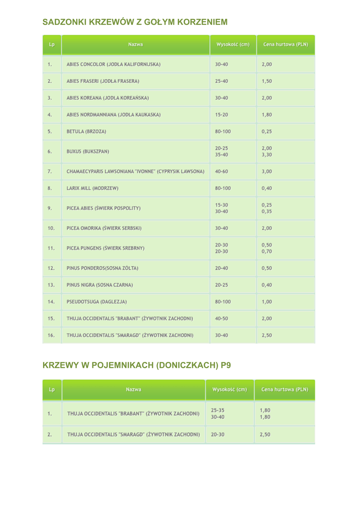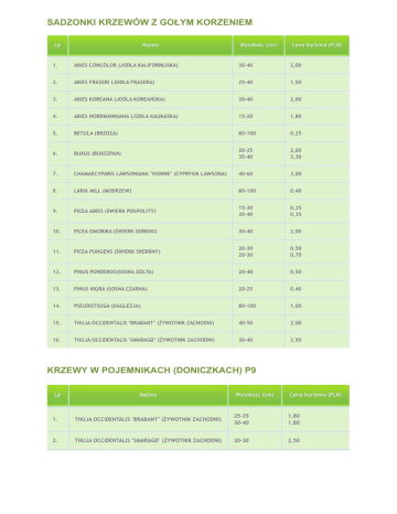 SADZONKI KRZEWÓW Z GOŁYM KORZENIEM KRZEWY W POJEMNIKACH (DONICZKACH) P9 KRZEWY Z GRUNTU grunt - rośliny kopane z gruntu w chusty jutowe grunt* - rośliny kopane z gruntu w chusty jutowe oraz metalową siatkę pa - rośliny formowane na pniu ! - średnica kuli u roślin formowanych na pniu Na życzenie klienta w donice (doliczamy cenę donicy)