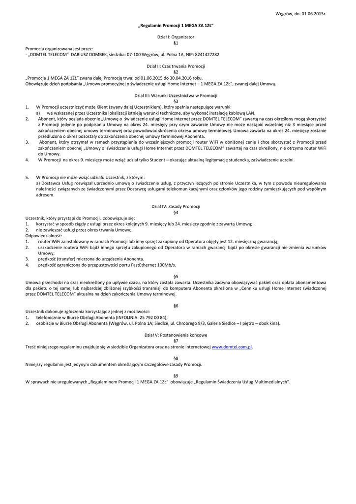 Węgrów, dn. 01.06.2015r. „Regulamin Promocji 1 MEGA ZA 1ZŁ” Dział I: Organizator §1 Promocja organizowana jest przez: - „DOMTEL TELECOM” DARIUSZ DOMBEK, siedziba: 07-100 Węgrów, ul. Polna 1A, NIP: 8241427282 Dział II: Czas trwania Promocji §2 „Promocja 1 MEGA ZA 1ZŁ” zwana dalej Promocją trwa: od 01.06.2015 do 30.04.2016 roku. Obowiązuje dzień podpisania „Umowy promocyjnej o świadczenie usługi Home Internet – 1 MEGA ZA 1ZŁ”, zwanej dalej Umową. 1. 2. 3. 4. 5. Dział III: Warunki Uczestnictwa w Promocji §3 W Promocji uczestniczyć może Klient (zwany dalej Uczestnikiem), który spełnia następujące warunki: a) we wskazanej przez Uczestnika lokalizacji istnieją warunki techniczne, aby wykonać instalację kablową LAN. Abonent, który posiada obecnie „Umowę o świadczenie usługi Home Internet przez DOMTEL TELECOM” zawartą na czas określony mogą skorzystać z Promocji jedynie po podpisaniu Umowy na okres 24. miesięcy przy czym zawarcie Umowy nie może nastąpić wcześniej niż 3 miesiące przed zakończeniem obecnej umowy terminowej oraz powodować skrócenia okresu umowy terminowej. Umowa zawarta na okres 24. miesięcy zostanie przedłużona o okres pozostały do zakończenia obecnej umowy terminowej Abonenta. Abonent, który otrzymał w ramach przystąpienia do wcześniejszych promocji router WiFi w obniżonej cenie i chce skorzystać z Promocji przed zakończeniem obecnej „Umowy o świadczenie usługi Home Internet przez DOMTEL TELECOM” zawartej na czas określony, nie otrzyma router WiFi do Umowy. W Promocji na okres 9. miesięcy może wziąć udział tylko Student – okazując aktualną legitymację studencką, zaświadczenie uczelni. W Promocji nie może wziąć udziału Uczestnik, z którym: a) Dostawca Usług rozwiązał uprzednio umowę o świadczenie usług, z przyczyn leżących po stronie Uczestnika, w tym z powodu nieuregulowania należności związanych ze świadczonymi przez Dostawcę usługami telekomunikacyjnymi oraz członków jego rodziny zamieszkujących pod wspólnym adresem. Dział IV: Zasady Promocji §4 Uczestnik, który przystąpi do Promocji, zobowiązuje się: 1. korzystać w sposób ciągły z usługi przez okres kolejnych 9. miesięcy lub 24. miesięcy zgodnie z zawartą Umową; 2. nie zawieszać usługi przez okres trwania Umowy; Odpowiedzialność: 1. router WiFi zainstalowany w ramach Promocji lub inny sprzęt zakupiony od Operatora objęty jest 12. miesięczną gwarancją; 2. uszkodzenie routera WiFi bądź innego sprzętu zakupionego od Operatora w ramach gwarancji bądź po okresie gwarancji nie zmienia warunków Umowy; 3. prędkość (transfer) mierzona do urządzenia Abonenta. 4. prędkość ograniczona do przepustowości portu FastEthernet 100Mb/s. §5 Umowa przechodzi na czas nieokreślony po upływie czasu, na który została zawarta. Uczestnika zaczyna obowiązywać pakiet oraz opłata abonamentowa dla pakietu o tej samej lub najbardziej zbliżonej szybkości transmisji do komputera Abonenta określona w „Cenniku usługi Home Internet świadczonej przez DOMTEL TELECOM” aktualna na dzień zakończenia Umowy terminowej. §6 Uczestnik dokonuje zgłoszenia korzystając z jednej z możliwości: 1. telefonicznie w Biurze Obsługi Abonenta (INFOLINIA: 25 792 00 84); 2. osobiście w Biurze Obsługi Abonenta (Węgrów, ul. Polna 1A; Siedlce, ul. Chrobrego 9/3, Galeria Siedlce – I piętro – obok kina). Dział V: Postanowienia końcowe §7 Treść niniejszego regulaminu znajduje się w siedzibie Organizatora oraz na stronie internetowej www.domtel.com.pl. §8 Niniejszy regulamin jest jedynym dokumentem określającym szczegółowe zasady Promocji. §9 W sprawach nie uregulowanych „Regulaminem Promocji 1 MEGA ZA 1ZŁ” obowiązuje „Regulamin Świadczenia Usług Multimedialnych”.