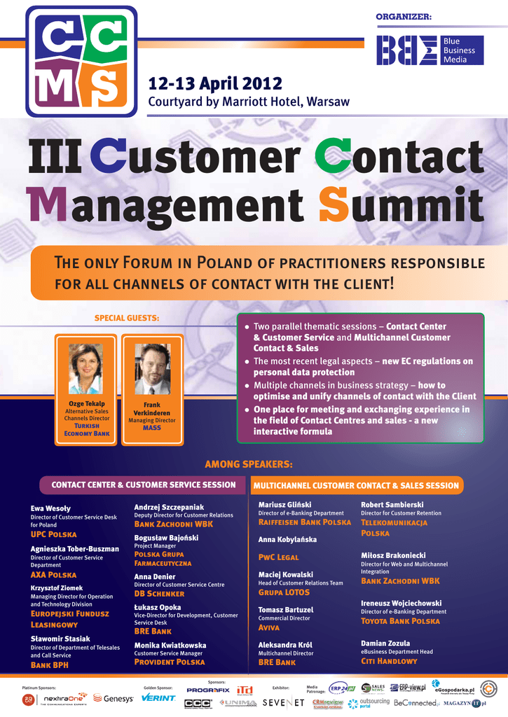ORGANIZER: 12-13 April 2012 Courtyard by Marriott Hotel, Warsaw III Customer Contact anagement Summit The only Forum in Poland of practitioners responsible for all channels of contact with the client! SPECIAL GUESTS: l l l Ozge Tekalp Alternative Sales Channels Director Turkish Economy Bank Frank Verkinderen l Managing Director MASS Two parallel thematic sessions – Contact Center & Customer Service and Multichannel Customer Contact & Sales The most recent legal aspects – new EC regulations on personal data protection Multiple channels in business strategy – how to optimise and unify channels of contact with the Client One place for meeting and exchanging experience in the field of Contact Centres and sales - a new interactive formula AMONG SPEAKERS: CONTACT CENTER & CUSTOMER SERVICE SESSION MULTICHANNEL CUSTOMER CONTACT & SALES SESSION Ewa Wesoły Andrzej Szczepaniak Mariusz Gliński Robert Sambierski Director of Customer Service Desk for Poland Deputy Director for Customer Relations Director of e-Banking Department Director for Customer Retention Bank Zachodni WBK Raiffeisen Bank Polska UPC Polska Bogusław Bajoński Telekomunikacja Polska Project Manager Anna Kobylańska Agnieszka Tober-Buszman Director of Customer Service Department Polska Grupa Farmaceutyczna PwC Legal AXA Polska Anna Denier Maciej Kowalski Krzysztof Ziomek Managing Director for Operation and Technology Division Europejski Fundusz Leasingowy Director of Department of Telesales and Call Service Bank BPH Head of Customer Relations Team DB Schenker Grupa LOTOS Łukasz Opoka Tomasz Bartuzel Director of e-Banking Department Commercial Director Toyota Bank Polska Vice-Director for Development, Customer Service Desk Ireneusz Wojciechowski Aviva Monika Kwiatkowska Aleksandra Król Damian Zozula Customer Service Manager Multichannel Director eBusiness Department Head Provident Polska BRE Bank Citi Handlowy Sponsors: Platinum Sponsors: Bank Zachodni WBK Director of Customer Service Centre BRE Bank Sławomir Stasiak Miłosz Brakoniecki Director for Web and Multichannel Integration Golden Sponsor: ¨ Exhibitor: Media Patronage: 12 April, Thursday SESSION CHAIRMAN: ANDRZEJ SZCZEPANIAK (Bank Zachodni WBK) 9:30 Registration and morning coffee 10:00 Welcoming the participants, networking Casper Haring, Managing Director, Blue Business Media 10:20 The European Customer Contact Centre Benchmark Frank Verkinderen, Managing Director, MASS The objective of the benchmark is to create value for companies and contact centres through the realization of an independent benchmark of the contact centre industry in Europe • market: size in employment/turnover, growth/year, proportion of outsourcers, segmentation B2B/B2C/In Cy, In/Outbound operations: hours, languages, SLA's, targets, performance criteria human resources: demographics, absenteeism, comp&ben, training and development, supervisory ratio, recruitment, social dialogue 10:45 Interactive Q&A session • • 11:00 Reducing operational costs whilst maintaining high KPIs - how to achieve it Małgorzata Gawrysiak, Commercial Director of Contact Center and Applications Product Group, NextiraOne Polska Marcin Spychała, Senior Sales Executive, Genesys Telecommunications Laboratories 11:30 Coffee break PARALLEL SESSIONS CONTACT CENTER & CUSTOMER SERVICE SESSION CHAIRMAN: ANDRZEJ SZCZEPANIAK (Bank Zachodni WBK) CUSTOMER IN THE SPOTLIGHT 11:50 Customer-centricity in practice – how to define and operationalize the “Customer-centred” strategy Agnieszka Tober-Buszman, Director of Customer Service Department, AXA Polska • elements ensuring a balance between Customer satisfaction and operating productivity • key factors of effective operationalization of a “Customer-centred" strategy on the example of first time resolution • managing the feedback from the optimisation of operating processes 12:15 Interactive Q&A session 12:30 Comprehensive and effective Customer service – process implementation based on universal multi-channel Contact Center platform Rafał Pychowski, Director of sales business applications and Contact Center, Unima 2000 Systemy Teleinformatyczne Piotr Bac, Product Manager, Unima 2000 Systemy Teleinformatyczne 12:40 Interactive Q&A session MULTICHANNEL CUSTOMER CONTACT & SALES SESSION CHAIRMAN: BOŻENA UCIECHOWSKA (Bank BPH) MULTICHANNEL SALES vs SALES IN MULTIPLE CHANNELS 11:50 Effective multichannel management in the organisation Aleksandra Król, Multichannel Director, BRE Bank • what is multichannel management • bank multichannel strategies and their consequences • how to match the channel to contact with the Client and ensure coordination between the channels 12:15 Interactive Q&A session 12:30 Optimisation of sales and profitability of the Client using CRM Ireneusz Wojciechowski, Director of e-Banking Department, Toyota Bank Polska • how to accurately determine the Customer needs • how to sell effectively • how to maximise revenue and establish relations 12:55 Interactive Q&A session 13:10 Lunch 12:50 Lunch CONSULTANT IN THE SPOTLIGHT 13:50 Recruitment and management of Contact Centre staff Anna Denier, Director of Customer Service Centre, DB Schenker • effective strategies or the recruitment of CC agents • proven forms of employment and effective methods for training agents • development of the agents' competences and career paths 14:15 Interactive Q&A session 14:30 Effectiveness of Contact Centre staff – the result of the standardisation of technology supported processes or interpersonal training Andrzej Szczepaniak, Deputy Director for Customer Relations, Bank Zachodni WBK • skills of CC staff – are we able to manage them effectiveness of staff in the light of international standards and provisions of the law • recruit or motivate – challenges connected with retention of staff 14:55 Interactive Q&A session 15:10 Coffee break 15:30 Consultant above all – from a satisfied employee to a satisfied Customer Monika Kwiatkowska,