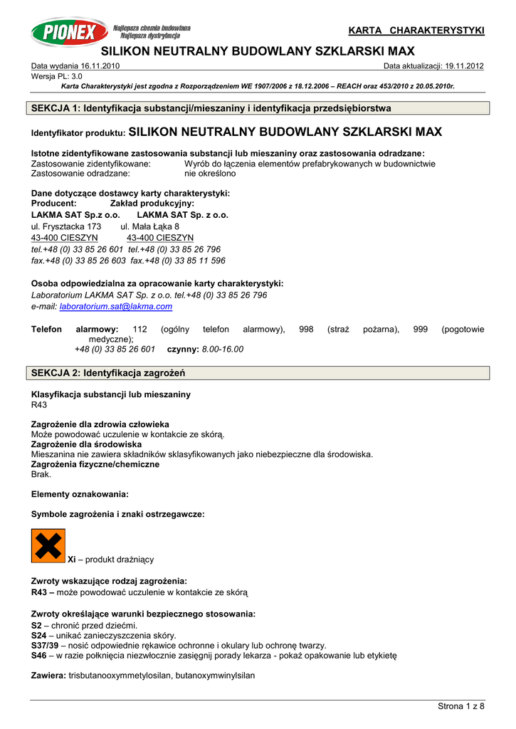 KARTA CHARAKTERYSTYKI SILIKON NEUTRALNY BUDOWLANY SZKLARSKI MAX Data wydania 16.11.2010 Wersja PL: 3.0 Data aktualizacji: 19.11.2012 Karta Charakterystyki jest zgodna z Rozporządzeniem WE 1907/2006 z 18.12.2006 – REACH oraz 453/2010 z 20.05.2010r. SEKCJA 1: Identyfikacja substancji/mieszaniny i identyfikacja przedsiębiorstwa Identyfikator produktu: SILIKON NEUTRALNY BUDOWLANY SZKLARSKI MAX Istotne zidentyfikowane zastosowania substancji lub mieszaniny oraz zastosowania odradzane: Zastosowanie zidentyfikowane: Wyrób do łączenia elementów prefabrykowanych w budownictwie Zastosowanie odradzane: nie określono Dane dotyczące dostawcy karty charakterystyki: Producent: Zakład produkcyjny: LAKMA SAT Sp.z o.o. LAKMA SAT Sp. z o.o. ul. Frysztacka 173 ul. Mała Łąka 8 43-400 CIESZYN 43-400 CIESZYN tel.+48 (0) 33 85 26 601 tel.+48 (0) 33 85 26 796 fax.+48 (0) 33 85 26 603 fax.+48 (0) 33 85 11 596 Osoba odpowiedzialna za opracowanie karty charakterystyki: Laboratorium LAKMA SAT Sp. z o.o. tel.+48 (0) 33 85 26 796 e-mail: [email protected] Telefon alarmowy: 112 (ogólny telefon alarmowy), medyczne); +48 (0) 33 85 26 601 czynny: 8.00-16.00 998 (straż pożarna), 999 (pogotowie SEKCJA 2: Identyfikacja zagrożeń Klasyfikacja substancji lub mieszaniny R43 Zagrożenie dla zdrowia człowieka Może powodować uczulenie w kontakcie ze skórą. Zagrożenie dla środowiska Mieszanina nie zawiera składników sklasyfikowanych jako niebezpieczne dla środowiska. Zagrożenia fizyczne/chemiczne Brak. Elementy oznakowania: Symbole zagrożenia i znaki ostrzegawcze: Xi – produkt drażniący Zwroty wskazujące rodzaj zagrożenia: R43 – może powodować uczulenie w kontakcie ze skórą Zwroty określające warunki bezpiecznego stosowania: S2 – chronić przed dziećmi. S24 – unikać zanieczyszczenia skóry. S37/39 – nosić odpowiednie rękawice ochronne i okulary lub ochronę twarzy. S46 – w razie połknięcia niezwłocznie zasięgnij porady lekarza - pokaż opakowanie lub etykietę Zawiera: trisbutanooxymmetylosilan, butanoxymwinylsilan Strona 1 z 8 KARTA CHARAKTERYSTYKI SILIKON NEUTRALNY BUDOWLANY SZKLARSKI MAX Data wydania 16.11.2010 Wersja PL: 3.0 Data aktualizacji: 19.11.2012 Karta Charakterystyki jest zgodna z Rozporządzeniem WE 1907/2006 z 18.12.2006 – REACH oraz 453/2010 z 20.05.2010r. Inne zagrożenia: Brak innych zagrożeń. Brak informacji na temat spełnienia kryteriów PBT lub vPvB zgodnie z załącznikiem XIII rozporządzenia REACH. Odpowiednie badania nie były przeprowadzone. SEKCJA 3: Skład/informacja o składnikach Mieszaniny: Niebezpieczne składniki: Identyfikator produktu Zawartość % Destylaty średnie obrabiane wodorem CAS: 64742-46-7 WE: 265-148-2 Nr indeksowy : 649-221-00-X Nr REACH: substancja podlega przepisom okresu przejściowego <25 Trisbutanonoksymmetylosilan CAS: 22984-54-9 WE: 245-366-4 Nr indeksowy: 650-015-00-7 Nr REACH: substancja podlega przepisom okresu przejściowego <4,5 Butanoksymwinylsilan CAS: 2224-33-1 WE: 218-747-8 Nr indeksowy: Nr REACH: substancja podlega przepisom okresu przejściowego <1,5 Klasyfikacja wg 67/548/EWG Klasyfikacja CLP Kody zwrotów Klasa zagrożenia i wskazujących kody kategorii rodzaj zagrożenia Nota H i N Uwagi H i N Asp. Tox.1 H304 R43 Skin Sens.1 H317 R43 Skin Sens.1 H317 Xn; R65 R66 Pełna treść zwrotów R i H w sekcji 16 SEKCJA 4: Środki pierwszej pomocy W przypadku kontaktu ze skórą: Umyć zabrudzoną skórę wodą z mydłem, spłukać dokładnie wodą, w przypadku pojawienia się podrażnienia, rumieni skontaktować się z lekarzem. W przypadku kontaktu z oczami: Przepłukać oczy przez kilkanaście minut (ok. 15) dużą ilością wody, trzymając powieki szeroko rozwarte. Unikać silnego strumienia, ze względu na niebezpieczeństwo uszkodzenia rogówki, natychmiast skontaktować się z lekarzem. Narażenie inhalacyjne: W razie zawrotów głowy lub nudności wyprowadzić poszkodowanego na świeże powietrze, w razie braku szybkiej poprawy zasięgnąć porady lekarza. W przypadku połknięcia: Nie wywoływać wymiotów, podać do wypicia dużą ilość wody, natychmiast skontaktować się z lekarzem. Nie podawać niczego doustnie osobie nieprzytomnej Najważniejsze ostre i opóźnione objawy oraz skutki narażenia: Strona 2 z 8 KARTA CHARAKTERYSTYKI SILIKON NEUTRALNY BUDOWLANY SZKLARSKI MAX Data wydania 16.11.2010 Wersja PL: 3.0 Data aktualizacji: 19.11.2012 Karta Charakterystyki jest zgodna z Rozporządzeniem WE 1907/2006 z 18.12.2006 – REACH oraz 453/2010 z 20.05.2010r. Układ oddechowy. Przy wdychaniu dużych bezpośrednich stężeń mogą pojawić się podrażnienia błon śluzowych układu oddechowego, kaszel, bóle głowy. Przewód pokarmowy. Spożycie może wywoływać podrażnienia chemiczne jamy ustnej, gardła i dalszych odcinków przewodu pokarmowego. Po wchłonięciu mogą wystąpić objawy zatrucia pokarmowego, ból brzucha, zawroty głowy, nudności i wymioty. Kontakt z oczami. Może powodować podrażnienia w przypadku bezpośredniego narażenia. Kontakt ze skórą. Może powodować uczulenie w kontakcie ze skórą. Wskazania dotyczące wszelkiej natychmiastowej pomocy lekarskiej i szczególnego z poszkodowanym: Decyzję o sposobie postępowania podejmuje lekarz po ocenie stanu poszkodowanego. postępowania SEKCJA 5: Postępowanie w przypadku pożaru Środki gaśnicze: Odpowiednie środki gaśnicze: piana alkoholoodporna lub suche proszki gaśnicze (A,B,C), dwutlenek węgla (gaśnica śniegowa), piasek lub ziemia, mgła wodna. Stosować metody gaśnicze odpowiednie do warunków otoczenia. Niewłaściwe środki gaśnicze: silny strumień wody. Szczególne zagrożenia związane z substancją lub mieszaniną: w trakcie pożaru, pod wpływem działania wysokich temperatur uwalniają się toksyczne produkty rozkładu zawierające min. tlenki węgla. Informacje dla straży pożarnej: pojemniki znajdujące się w strefie pożaru chłodzić rozproszonym strumieniem wody, o ile jest to możliwe usunąć z