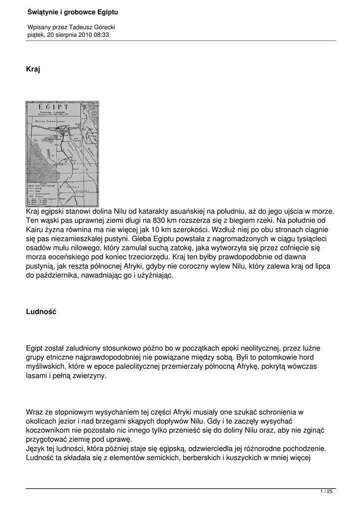 Świątynie i grobowce Egiptu Wpisany przez Tadeusz Górecki piątek, 20 sierpnia 2010 08:33 Kraj Kraj egipski stanowi dolina Nilu od katarakty asuańskiej na południu, aż do jego ujścia w morze. Ten wąski pas uprawnej ziemi długi na 830 km rozszerza się z biegiem rzeki. Na południe od Kairu żyzna równina ma nie więcej jak 10 km szerokości. Wzdłuż niej po obu stronach ciągnie się pas niezamieszkałej pustyni. Gleba Egiptu powstała z nagromadzonych w ciągu tysiącleci osadów mułu nilowego, który zamulał suchą zatokę, jaka wytworzyła się przez cofnięcie się morza eoceńskiego pod koniec trzeciorzędu. Kraj ten byłby prawdopodobnie od dawna pustynią, jak reszta północnej Afryki, gdyby nie coroczny wylew Nilu, który zalewa kraj od lipca do października, nawadniając go i użyźniając. Ludność Egipt został zaludniony stosunkowo późno bo w początkach epoki neolitycznej, przez luźne grupy etniczne najprawdopodobniej nie powiązane między sobą. Byli to potomkowie hord myśliwskich, które w epoce paleolitycznej przemierzały północną Afrykę, pokrytą wówczas lasami i pełną zwierzyny. Wraz ze stopniowym wysychaniem tej części Afryki musiały one szukać schronienia w okolicach jezior i nad brzegami skąpych dopływów Nilu. Gdy i te zaczęły wysychać koczownikom nie pozostało nic innego tylko przenieść się do doliny Nilu oraz, aby nie zginąć przygotować ziemię pod uprawę. Język tej ludności, która później staje się egipską, odzwierciedla jej różnorodne pochodzenie. Ludność ta składała się z elementów semickich, berberskich i kuszyckich w mniej więcej 1 / 25 Świątynie i grobowce Egiptu Wpisany przez Tadeusz Górecki piątek, 20 sierpnia 2010 08:33 jednakowych proporcjach. Flora i fauna Była bardzo uboga. Obejmowała tylko rośliny wodne - biały i niebieski lotos, papirus oraz takie, które mogą przetrwać na skrajach pustyni - palma daktylowa, palma dum, sykomora, wierzba, tamaryszek i oliwka. Pozostałe rośliny zostały do Egiptu sprowadzone głównie z Azji. Podobnie było z fauną. Do rodzimej należały - hipopotamy do XII w. A.D., krokodyle do XIX w. n.e., lwy, hieny, szakale, gepardy, małe zwierzęta z rodziny psów i kotów, gazele, gady i skorpiony. Religia i bóstwa Ponieważ praca ma dotyczyć obiektów sakralnych jakimi są grobowce i świątynie nie sposób nie powiedzieć tu o wierzeniach dawnych Egipcjan. Jest rzeczą niemożliwą sporządzić kompletną listę pierwotnych bóstw więc poniżej przedstawiamy listę głównych bóstw egipskich męskich i żeńskich. 2 / 25 Świątynie i grobowce Egiptu Wpisany przez Tadeusz Górecki piątek, 20 sierpnia 2010 08:33 Bóstwa męskie IMIĘ WŁADCA MIASTA CHARAKTER IKONOGRAFIA ŚWIĘTE ZWIERZĘ Anubis Kynopolis Bóg mumifikacji i zmarłych 3 / 25 Świątynie i grobowce Egiptu Wpisany przez Tadeusz Górecki piątek, 20 sierpnia 2010 08:33 Mężczyzna z głową szakala Szakal Atum Heliopolis Zachodzące słońce Król noszący podwójną koronę Byk, Lew, Wąż, Ichneumon Szu Leontopolis Bóg utożsamiany z powietrzem Strusie pióro na głowie 4 / 25 Świątynie i grobowce Egiptu Wpisany przez Tadeusz Górecki piątek, 20 sierpnia 2010 08:33 Lew Harachtes Heliopolis Utożsamiany ze słońcem Bóg z głową sokoła przyozdobioną tarczą słoneczną Baran Wielki Horus lub Haroeris Sam- Bahdet Bóg nieba, protoplasta monarchii faraonów Sokół lub mężczyzna z tarczą na głowie Sokół 5 / 25 Świątynie i grobowce Egiptu Wpisany przez Tadeusz Górecki piątek, 20 sierpnia 2010 08:33 Geb Utożsamiany z ziemią Leżący mężczyzna z ciałem usłanym zielenią Chenty- Amentiu Abydos Bóg zmarłych utożsamiany z Ozyrysem od Średniego państwa Szakal Chnum 6 / 25 Świątynie i grobowce Egiptu Wpisany przez Tadeusz Górecki piątek, 20 sierpnia 2010 08:33 Elfantyna Modelujący bogów i ludzi na kole garncarskim Bóg z głową barana o poziomych rogach Baran Chopri Heliopolis Bóg słońca utożsamiany z Atumem i RE Mężczyzna ze skarabeuszem zamiast głowy Skarabeusz Min Koptos Panapolis 7 / 25 Świątynie i grobowce Egiptu Wpisany przez Tadeusz Górecki piątek, 20 sierpnia 2010 08:33 Bóg karawan na pustyni Mężczyzna intyfalliczny wymachujący biczem nad głową Montu Hermontis Bóg wojownik Głowa sokoła lub byka zbrojny w łuk i siekierę Byk-Bukis Nefertum 8 / 25 Świątynie i grobowce Egiptu Wpisany przez Tadeusz Górecki piątek, 20 sierpnia 2010 08:33 Bóg z kwiatem lotosu na głowie Onuris This Utożsamiany z Szu Bóg w pstrokatej sukni z dwoma piórami na głowie związanymi sznurem z nieba Wep-Wawet Asiut Bóg wojownik Wilk stojący na godle 9 / 25 Świątynie i grobowce Egiptu Wpisany przez Tadeusz Górecki piątek, 20 sierpnia 2010 08:33 Wilk Ozyrys Busiris Ahydos Król zmarłych Mumia w stożkowatym czepcu z dwoma piórami na głowie. W rękach trzyma bicz i zgięty kij Ptah Memfis Patron rzeźbiarzy i kowali Mumia z ogoloną głową trzymająca berło w obu rękach 10 / 25 Świątynie i grobowce Egiptu Wpisany przez Tadeusz Górecki piątek, 20 sierpnia 2010 08:33 Re Heliopolis Bóg kosmiczny którego imię znaczy ,,Słońce'' Utożsamiany z Chepri w jego roli słońca porannego do Atuma jako słońca wieczornego Sobek Fajum Kom Ombo Krokodyl lub mężczyzna z głową krokodyla Krokodyl Set 11 / 25 Świątynie i grobowce Egiptu Wpisany przez Tadeusz Górecki piątek, 20 sierpnia 2010 08:33 Ombos Awaris Bóg wojownik w służbie Re, przeciwnik Ozyrysa Wojownik uzbrojony z głową fantastycznego zwierzęcia o wydatnym pysku i długich ich uszach Sokaris Sakkara Bóg umarłych Mumia z głową sokoła Sopdu Saft-el 12 / 25 Świątynie i grobowce Egiptu Wpisany przez Tadeusz Górecki piątek, 20 sierpnia 2010 08:33 Henne Bóg wojownik Azjatycki wojownik lub mumia sokoła Bóstwa żeńskie IMIĘ WŁADCA MIASTA 13 / 25 Świątynie i grobowce Egiptu Wpisany przez Tadeusz Górecki piątek, 20 sierpnia 2010 08:33 CHARAKTER IKONOGRAFIA ŚWIĘTE ZWIER