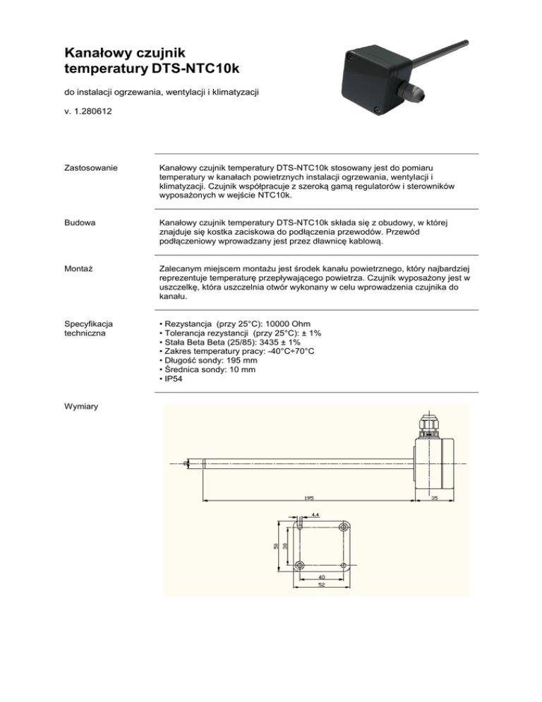 Kanałowy czujnik temperatury DTS-NTC10k do instalacji ogrzewania, wentylacji i klimatyzacji v. 1.280612 Zastosowanie Kanałowy czujnik temperatury DTS-NTC10k stosowany jest do pomiaru temperatury w kanałach powietrznych instalacji ogrzewania, wentylacji i klimatyzacji. Czujnik współpracuje z szeroką gamą regulatorów i sterowników wyposażonych w wejście NTC10k. Budowa Kanałowy czujnik temperatury DTS-NTC10k składa się z obudowy, w której znajduje się kostka zaciskowa do podłączenia przewodów. Przewód podłączeniowy wprowadzany jest przez dławnicę kablową. Montaż Zalecanym miejscem montażu jest środek kanału powietrznego, który najbardziej reprezentuje temperaturę przepływającego powietrza. Czujnik wyposażony jest w uszczelkę, która uszczelnia otwór wykonany w celu wprowadzenia czujnika do kanału. Specyfikacja techniczna • Rezystancja (przy 25°C): 10000 Ohm • Tolerancja rezystancji (przy 25°C): ± 1% • Stała Beta Beta (25/85): 3435 ± 1% • Zakres temperatury pracy: -40°C÷70°C • Długość sondy: 195 mm • Średnica sondy: 10 mm • IP54 Wymiary