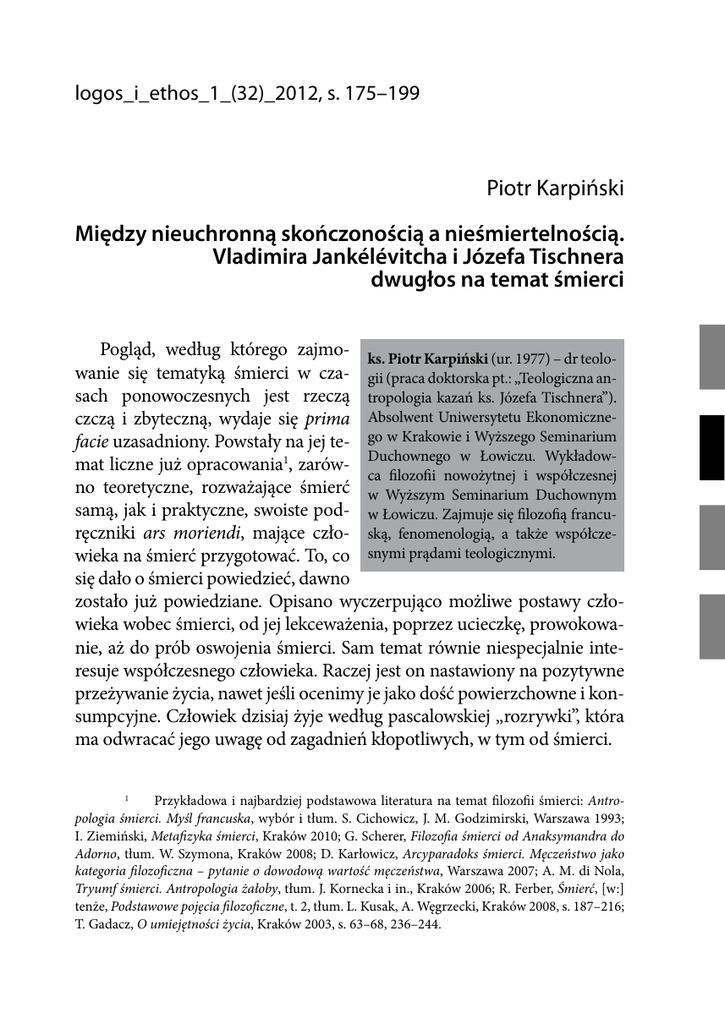 logos_i_ethos_1_(32)_2012, s. 175–199 Piotr Karpiński Między nieuchronną skończonością a nieśmiertelnością. Vladimira Jankélévitcha i Józefa Tischnera dwugłos na temat śmierci Pogląd, według którego zajmo- ks. Piotr Karpiński (ur. 1977) – dr teolowanie się tematyką śmierci w cza- gii (praca doktorska pt.: „Teologiczna ansach ponowoczesnych jest rzeczą tropologia kazań ks. Józefa Tischnera”). czczą i zbyteczną, wydaje się prima Absolwent Uniwersytetu Ekonomicznefacie uzasadniony. Powstały na jej te- go w Krakowie i Wyższego Seminarium mat liczne już opracowania1, zarów- Duchownego w Łowiczu. Wykładowca filozofii nowożytnej i współczesnej no teoretyczne, rozważające śmierć w Wyższym Seminarium Duchownym samą, jak i praktyczne, swoiste pod- w Łowiczu. Zajmuje się filozofią francuręczniki ars moriendi, mające czło- ską, fenomenologią, a także współczewieka na śmierć przygotować. To, co snymi prądami teologicznymi. się dało o śmierci powiedzieć, dawno zostało już powiedziane. Opisano wyczerpująco możliwe postawy człowieka wobec śmierci, od jej lekceważenia, poprzez ucieczkę, prowokowanie, aż do prób oswojenia śmierci. Sam temat równie niespecjalnie interesuje współczesnego człowieka. Raczej jest on nastawiony na pozytywne przeżywanie życia, nawet jeśli ocenimy je jako dość powierzchowne i konsumpcyjne. Człowiek dzisiaj żyje według pascalowskiej „rozrywki”, która ma odwracać jego uwagę od zagadnień kłopotliwych, w tym od śmierci. 1 Przykładowa i najbardziej podstawowa literatura na temat filozofii śmierci: Antropologia śmierci. Myśl francuska, wybór i tłum. S. Cichowicz, J. M. Godzimirski, Warszawa 1993; I. Ziemiński, Metafizyka śmierci, Kraków 2010; G. Scherer, Filozofia śmierci od Anaksymandra do Adorno, tłum. W. Szymona, Kraków 2008; D. Karłowicz, Arcyparadoks śmierci. Męczeństwo jako kategoria filozoficzna – pytanie o dowodową wartość męczeństwa, Warszawa 2007; A. M. di Nola, Tryumf śmierci. Antropologia żałoby, tłum. J. Kornecka i in., Kraków 2006; R. Ferber, Śmierć, [w:] tenże, Podstawowe pojęcia filozoficzne, t. 2, tłum. L. Kusak, A. Węgrzecki, Kraków 2008, s. 187–216; T. Gadacz, O umiejętności życia, Kraków 2003, s. 63–68, 236–244. 176 Piotr Karpiński A jednak problematyka śmierci w naszych czasach powraca. Daje się zauważyć co najmniej dwa obszary, które nie mogą się od niej odseparować. Pierwszym z nich jest obszar refleksji etycznej, a zwłaszcza bioetyki. Takie zagadnienia, jak eutanazja, prawna definicja śmierci, uporczywa terapia, biologistyczna interpretacja życia i wiele innych, siłą rzeczy ewokują problem śmierci2. Drugim obszarem jest antropologia, czyli refleksja o człowieku. Czy jest możliwe poznanie i wyjaśnienie ludzkiej egzystencji bez uwzględnienia faktu śmierci? Czy śmierć jest punktem krańcowym, bez większego znaczenia dla życia ludzkiego, czy też świadomość śmierci jakoś naznacza i przekształca samo życie? Nie da się uprawiać odpowiedzialnie antropologii, bez uwzględnienia faktu śmierci3. W niniejszym artykule podejmujemy się refleksji nad śmiercią w tym drugim obszarze, czyli refleksji antropologicznej. Jego przedmiotem jest zrekonstruowanie i skonfrontowanie dwóch antropotanatologii: francuskiego filozofa z kręgu filozofii ducha, Vladimira Jankélévitcha (1903–1985) i Józefa Tischnera (1931–2000), polskiego fenomenologa i twórcy filozofii dramatu. Pomiędzy obydwoma myślicielami istnieją pewne podobieństwa, ale i znaczące różnice. W omawianym tutaj zagadnieniu śmierci jedna rzecz wydaje się doniosła: o ile Tischner szuka chrześcijańskiej filozofii śmierci, o tyle postawa Jankélévitcha jest, najdelikatniej mówiąc, religijnie neutralna. Cóż zatem mogliby powiedzieć sobie nawzajem? Gdzie tkwi bardziej poważne i na serio potraktowanie tematu? A może obydwa punkty widzenia nie są tak całkiem odległe i gdzieś się tajemniczo spotykają? W refleksji antropologicznej ważne są trzy pytania dotyczące śmierci: po pierwsze, czym jest śmierć sama w sobie, czyli jej opis fenomenologiczny; po drugie, jak świadomość śmierci wpływa na życie samo, Por. J. Kopania, Etyczny wymiar cielesności, Kraków 2003. Ch. Delsol czyni śmierć punktem wyjściowym swojej filozofii człowieka. Jej zdaniem, to świadomość śmierci wyznacza moment pojawienia się istoty ludzkiej jako takiej: „Pierwszym istotnym pytaniem jest pytanie o śmierć. Twierdzenie, że jest to pytanie podstawowe, nie jest w żadnym razie dowolne. […] [P]ytanie o śmierć jest charakterystyczną cechą człowieka, oznaczając narodziny odróżnionych od siebie jednostek” (Ch. Delsol, Czym jest człowiek? Kurs antropologii dla niewtajemniczonych, tłum. M. Kowalska, Kraków 2011, s. 17). 2 3 Między nieuchronną skończonością a nieśmiertelnością... 177 czyli analiza antropologiczna; po trzecie, jakie jest postulowane rozwiązanie problemu śmierci, tak by podjęcie życia w jej horyzoncie stało się w ogóle możliwe. Te trzy pytania wyznaczą przedmiotowy zakres podjętych tu rozważań. 1. Poszukując sensu i znaczenia śmierci Józef Tischner bardzo wcześnie dostrzegł doniosłość problematyki śmierci dla filozofii człowieka i poświęcił jej jeden z pierwszych swoich tekstów, Prolegomena chrześcijańskiej filozofii śmierci4, który wszedł do antologii Świat ludzkiej nadziei. Mówiąc o śmierci ludzkiej, należy mieć na uwadze różne jej postaci5. O wielorakości śmierci mówił Tischner między innymi w homilii na Mszy św. prymicyjnej, w miejscowości Łapsze Wyżne: Wiemy o tym dobrze, że są rozmaite śmierci, które nachodzą człowieka. Jedne śmierci przychodzą od zewnątrz, od ciała, ale jest też taka śmierć, która przychodzi od środka, jakby od serca. Tymi śmierciami, które przez ciało przychodzą, zajmują się lekarze. Kapłani zajmują się 