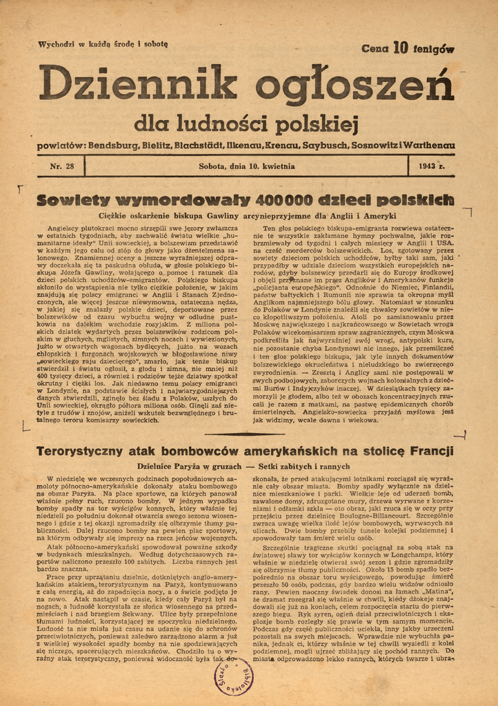 Wychodzi w każdą środę i sobotę Cena 10 fenigów Dziennik ogłoszeń dla ludności polskiej powiatów: Rendsburg, Bielitz, Blachstädt, Ilkenau.Krenau, Saybusch, Sosnowitzi Warthenau Nr. 28 Sobota, dnia 10. kwietnia 1943 r. Sowiety wymordowały 400000 dzieci polskich Ciężkie oskarżenie biskupa Gawliny arcynieprzyjemne dla Anglii i Ameryki Angielscy plutokraci mocno strzępili swe jęzory zwłaszcza w ostatnich tygodniach, aby zachwalić światu wielkie „hu manitarne ideały“ Unii sowieckiej, a boiszewizm przedstawić w każdym jego calu od stóp do głowy jako dżentelmena sa lonowego. Znamiennej oceny a jeszcze wyraźniejszej odpra wy doczekała się ta paskudna obłuda, w głosie polskiego bi skupa Józefa Gawliny, wołającego o pomoc i ratunek dla dzieci polskich uchodźców-emigrantów. Polskiego biskupa skłoniło do wystąpienia nie tylko ciężkie położenie, w jakim znajdują się polscy emigranci w Anglii i Stanach Zjedno czonych, ale więcej jeszcze niewymowna, ostateczna nędza, w jakiej się znalazły polskie dzieci, deportowane przez bolszewików od czasu wybuchu wojny w odludne pust kowia na dalekim wschodzie rosyjskim. Z miliona pol skich dziatek wydartych przez bolszewików rodzicom pol skim w głuchych, mglistych, zimnych nocach i wywiezionych, jużto w otwartych wagonach bydlęcych, jużto na wozach chłopskich i furgonach wojskowych w błogosławione niwy „sowieckiego raju dziecięcego“, zmarło, jak tenże biskup stwierdził i światu ogłosił, z głodu i zimna, nie mniej niż 400 tysięcy dzieci, a również i rodziców tejże dziatwy spotkał okrutny i ciężki los. Jak niedawno temu polscy emigranci w Londynie, na podstawie ścisłych i najwiarygodniejszych danych stwierdzili, zginęło bez śladu z Polaków, uszłych do Unii sowieckiej, okrągło półtora miliona osób. Ginęli zaś me tyle z trudów i znojów, aniżeli wskutek bezwzględnego i bru talnego teroru komisarzy sowieckich. Ten głos polskiego biskupa-emigrania rozwiewa ostatecz nie te wszystkie zakłamane hymny pochwalne, jakie roz brzmiewały od tygodni i całych miesięcy w Anglii 1 USA. na cześć morderców bolszewickich. Los, zgotowany przez sowiety dzieciom polskich uchodźców, byłby taki sam, jaki przypadłby w udziale dzieciom wszystkich europejskich na rodów, gdyby bolszewicy przedarli się do Europy środkowej i objęli prz^nane im przez Anglików i Amerykanów funkcje „policjanta europejskiego". Odnośnie do Niemiec, Finlandii, państw bałtyckich i Rumunii nie sprawia ta okropna myśl Anglikom najmniejszego bólu głowy. Natomiast w stosunku do Polaków w Londynie znaleźli się chwalcy sowietów w nie co kłopotliwszym położeniu. Atoli po zamianowaniu przez Moskwę największego i najkrańcowszego w Sowietach wroga Polaków wicekomisarzem spraw zagranicznych, czym Moskwa podkreśliła jak najwyraźniej swój wrogi, antypolski kurs, nie pozostanie chyba Londynowi nic innego, jak przemilczeć i ten głos polskiego biskupa, jak tyle innych dokumentów bolszewickiego okrucieństwa i nieludzkiego bo zwierzęcego zwyrodnienia. — Zresztą i Anglicy sami nie postępowali w swych podbojowych, zaborczych wojnach kolonialnych z dzieć mi Burów i Indyjeżyków inaczej. W dziesiątkach tysięcy za moczyli je głodem, albo też w obozach koncentracyjnych rzu cali je razem z matkami, na pastwę epidemicznych chorób śmiertelnych. Angielsko-sowiecka przyjaźń myślowa jest jak widzimy, wcale dawna i wiekowa. -4 Terorystyczny atak bombowców amerykańskich na stolicę Francji Dzielnice Paryża w gruzach W niedzielę we wczesnych godzinach popołudniowych sa moloty północno-amerykańskie dokonały ataku bombowego na obszar Paryża. Na place sportowe, na których panował właśnie pełny ruch, rzucono bomby. W jednym wypadku bomby spadły na tor wyścigów konnych, który właśnie tej niedzieli po południu dokonał otwarcia swego sezonu wiosen nego i gdzie z tej okazji zgromadziły się olbrzymie tłumy pu bliczności. Dalej rzucono bomby na pewien plac sportowy, na którym odbywały się imprezy na rzecz jeńców wojennych. Atak północno-amerykański spowodował poważne szkody w budynkach mieszkalnych. Według dotychczasowych ra portów naliczono przeszło 100 zabitych. Liczba rannych jest bardzo znaczna. Prace przy uprzątaniu dzielnic, dotkniętych anglo-amerykańskim atakiem , terorystycznym na Paryż, kontynuowano z całą energią, aż do zapadnięcia nocy, a o świcie podjęto je na nowo. Atak nastąpił w czasie, kiedy cały Paryż był na nogach, a ludność korzystała ze słońca wiosennego na przed mieściach i nad brzegiem Sekwany. Ulice były przepełnione tłumami ludności, korzystającej ze spoczynku niedzielnego. Ludność ta nie miała już czasu na udanie się do schronów przeciwlotniczych, ponieważ zaledwo zarządzono alarm a już z wielkiej wysokości spadły bomby na nie spodziewających się niczego, spacerujących mieszkańców. Chodziło tu o wy raźny atak terorystyczny, ponieważ widoczność była tak - Setki zabitych i rannych skonała, że przed atakującymi lotnikami rozciągał się wyraź nie cały obszar miasta. Bomby spadły wyłącznie na dziel nice mieszkaniowe i parki. Wielkie- leje od uderzeń bomb, zawalone domy, zdruzgotane mury, drzewa wyrwane z korze niami i odłamki szkła — oto obraz, jaki rzuca się w oczy przy przejściu przez dzielnicę Boulogne-Billancourt. Szczególnie zwraca uwagę wielka ilość lejów bombowych, wyrwanych na ulicach. Dwie bomby przebiły tunele kolejki podziemnej i spowodowały tam śmierć wielu osób. Szczególnie tragiczne skutki pociągnął za sobą atak na światowej sławy tor wyścigów konnych w Longchamps, który właśnie w niedzielę otwierał swój sezon i gdzie zgromadziły się olbrzymie tłumy publiczności. Około 15 bomb spadło bez pośrednio na obszar toru wyścigowego, powodując śmierć przeszło 50 osób, podczas, gdy bardzo wielu widzów odniosło rany. Pewien naoczny ś