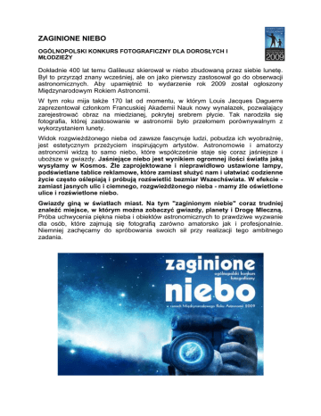ZAGINIONE NIEBO OGÓLNOPOLSKI KONKURS FOTOGRAFICZNY DLA DOROSŁYCH I MŁODZIEŻY Dokładnie 400 lat temu Galileusz skierował w niebo zbudowaną przez siebie lunetę. Był to przyrząd znany wcześniej, ale on jako pierwszy zastosował go do obserwacji astronomicznych. Aby upamiętnić to wydarzenie rok 2009 został ogłoszony Międzynarodowym Rokiem Astronomii. W tym roku mija także 170 lat od momentu, w którym Louis Jacques Daguerre zaprezentował członkom Francuskiej Akademii Nauk nowy wynalazek, pozwalający zarejestrować obraz na miedzianej, pokrytej srebrem płycie. Tak narodziła się fotografia, której zastosowanie w astronomii było przełomem porównywalnym z wykorzystaniem lunety. Widok rozgwieżdżonego nieba od zawsze fascynuje ludzi, pobudza ich wyobraźnię, jest estetycznym przeżyciem inspirującym artystów. Astronomowie i amatorzy astronomii widzą to samo niebo, które współcześnie staje się coraz jaśniejsze i uboższe w gwiazdy. Jaśniejące niebo jest wynikiem ogromnej ilości światła jaką wysyłamy w Kosmos. Źle zaprojektowane i nieprawidłowo ustawione lampy, podświetlane tablice reklamowe, które zamiast służyć nam i ułatwiać codzienne życie często oślepiają i próbują rozświetlić bezmiar Wszechświata. W efekcie zamiast jasnych ulic i ciemnego, rozgwieżdżonego nieba - mamy źle oświetlone ulice i rozświetlone niebo. Gwiazdy giną w światłach miast. Na tym "zaginionym niebie" coraz trudniej znaleźć miejsce, w którym można zobaczyć gwiazdy, planety i Drogę Mleczną. Próba uchwycenia piękna nieba i obiektów astronomicznych to prawdziwe wyzwanie dla osób, które zajmują się fotografią zarówno amatorsko jak i profesjonalnie. Niemniej zachęcamy do spróbowania swoich sił przy realizacji tego ambitnego zadania. Regulamin konkursu POBIERZ Karta zgłoszenia POBIERZ Konkurs ma formułę otwartą, przeznaczony jest dla dorosłych i młodzieży – amatorów i profesjonalistów. Tematem prac jest nocne niebo z perspektywy obserwatora znajdującego się w różnych otoczeniach (miasto, wieś, teren odludny) oraz obiekty astronomiczne dziennego i nocnego nieba. ORGANIZATORZY: Centrum Kultury AGORA plac J.Piłsudskiego 2, 51-152 Wrocław (od maja br. - ul. Serbska 5 A, 51-111 Wrocław) tel.+48 (71) 325 14 83, fax: 48 (71) 325 24 73 Instytut Astronomiczny Uniwersytetu Wrocławskiego ul. Kopernika 11, 51-622 Wrocław, tel. +48 (71)372 93 73, 3729374, fax: + 48 (71)372 93 78 e-mail: [email protected], www.astro.uni.wroc.pl PARTNERZY: AGFA Image Center www.e-agfa.pl teleskopy.net www.teleskopy.net Wademecum Miłośników Astronomii www.vademecum.astronomia.pl NetRider www.netrider.com.pl Termin nadsyłania prac: do 1 września br., na adres Centrum Kultury AGORA, plac J.Piłsudskiego 2, 51-152 Wrocław (uwaga – zmiana siedziby od maja br. - ul. Serbska 5 A, 51-111 Wrocław) Ogłoszenie wyników konkursu, nagrodzenie laureatów, wernisaż wystawy pokonkursowej oraz wykład o tematyce astronomicznej, odbędą się 22 września o godz. 18.00, w Gmachu Głównym Uniwersytetu Wrocławskiego (I piętro) – w ramach XII DOLNOŚLĄSKIEGO FESTIWALU NAUKI. Szczegółowych informacji udziela - Kasia Mrozek, CK AGORA - tel. 0 71 325 14 83 w. 28, [email protected]