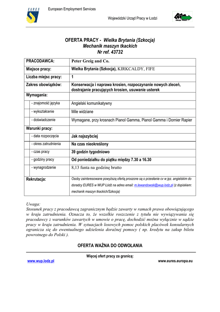 European Employment Services Wojewódzki Urząd Pracy w Łodzi OFERTA PRACY - Wielka Brytania (Szkocja) Mechanik maszyn tkackich Nr ref. 43732 PRACODAWCA: Peter Greig and Co. Miejsce pracy: Wielka Brytania (Szkocja), KIRKCALDY, FIFE Liczba miejsc pracy: 1 Zakres obowiązków: Konserwacja i naprawa krosien, rozpoczynanie nowych zleceń, dostrajanie pracujących krosien, usuwanie usterek Wymagania: - znajomość języka Angielski komunikatywny - wykształcenie Mile widziane - doświadczenie Wymagane, przy krosnach Pianol Gamma, Pianol Gamma i Dornier Rapier Warunki pracy: - data rozpoczęcia Jak najszybciej - okres zatrudnienia Na czas nieokreślony - czas pracy 39 godzin tygodniowo - godziny pracy Od poniedziałku do piątku między 7.30 a 16.30 - wynagrodzenie 8,13 funta na godzinę brutto Rekrutacja: Osoby zainteresowane powyższą ofertą proszone są o przesłanie cv w jęz. angielskim do doradcy EURES w WUP Łódź na adres email: [email protected] (z dopiskiem: mechanik maszyn tkackich/Szkocja) Uwaga: Stosunek pracy z pracodawcą zagranicznym będzie zawarty w ramach prawa obowiązującego w kraju zatrudnienia. Oznacza to, że wszelkie roszczenie z tytułu nie wywiązywania się pracodawcy z warunków zawartych w umowie o pracę, dochodzić można wyłącznie w sądzie pracy w kraju zatrudnienia. W sytuacjach losowych pomoc polskich placówek konsularnych ogranicza się do ewentualnego udzielenia doraźnej pomocy ( np. kredytu na zakup biletu powrotnego do Polski ). OFERTA WAŻNA DO ODWOŁANIA Więcej ofert pracy za granicą: www.wup.lodz.pl www.eures.europa.eu