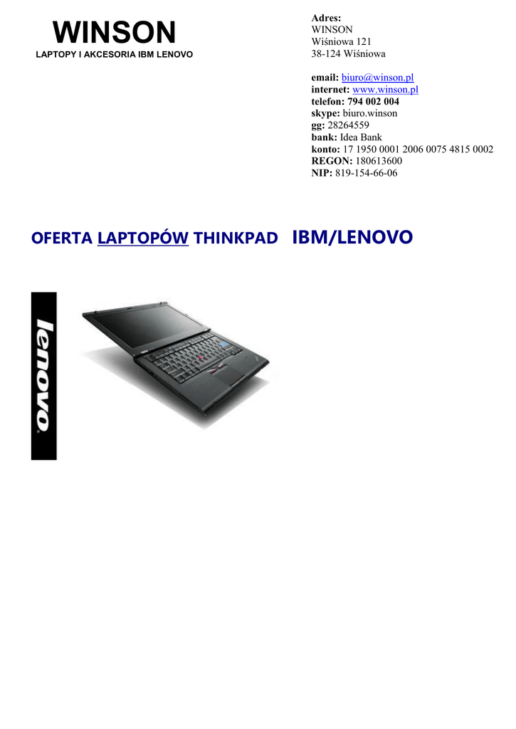 Ft5 WINSON LAPTOPY I AKCESORIA IBM LENOVO Adres: WINSON Wiśniowa 121 38-124 Wiśniowa email: [email protected] internet: www.winson.pl telefon: 794 002 004 skype: biuro.winson gg: 28264559 bank: Idea Bank konto: 17 1950 0001 2006 0075 4815 0002 REGON: 180613600 NIP: 819-154-66-06 OFERTA LAPTOPÓW THINKPAD IBM/LENOVO SERIA W, oraz P czyli mobilne stacje robocze GWARANCJA NAJNIŻSZEJ CENY W POLSCE POZYCJA 1 Producent: IBM Lenovo Model ThinkPad: P50 z Podświetlanymi Klawiszami Klawiatury (LED BACKLIGHT KEYBOARD) Kod producenta: Type 20EQ-S0T600, S/N PC0C7NL3 Gwarancja: gwarancja producenta do 2019-06-10 Stan: LAPTOP NOWY procesor: Xeon processor E3-1535M v5 with quad-core 2,90GHz (3,80GHz Intel Turbo Boost; 8MB L3 cache, 4 RDZENIOWY, 8 WĄTKOWY, HT technology, vPro) – jest to Intel® najmocniejszy dostępny procesor jaki występuję w tym modelu, najnowsza technologia procesorów. matryca: 15,6" FHD (1920x1080) LED, In-plane Switching IPS (FlexView), matryca o podwyższonej rozdzielczości, podświetlana diodami LED Matryca jest PANORAMICZNA, ANTYODBLASKOWA, MATOWA (nie odbija światła, przedmiotów np. siedząc naprzeciw okna!) karta graficzna: 4GB Własnej pamięci, DEDYKOWANA (niezintegrowana) – super mocna karta graficzna, oraz druga karta Intel HD Graphics P530 (zintegrowana). DWIE KART GRAFICZNE przełączane przeźroczyście (automatycznie) w zależności od zapotrzebowania aplikacji – dwie karty graficzne to najmocniejsza konfiguracja jaka występowała w tych modelach. nVIDIA Quadro M2000M, dysk twardy: 512GB, SSD (Solid State Drive) – najszybsze, aktualnie najnowsza technologia dysków twardych, brak części mechanicznych, bardzo wysokie bezpieczeństwo danych. (możliwość zmiany dysku twardego na inny) pamięć RAM: 16GB DDR4 (2133MHz); LAPTOP POSIADA AŻ 4 SLOTY PAMIĘCI, MAX. 64GB (możliwość zmiany wielkości pamięci) Dzwięk: HD Audio, Realtek ALC3268 codec, stereo speakers, 1.5W x 2/dual array microphone, combo audio/microphone jack Komunikacja Przewodowa: 10/100/1000 (1GB Ethernet LAN) - Intel Ethernet Connection I219-LM (Jacksonville) Komunikacja Bezprzewodowa: Intel Dual Band Wireless-AC 8260 WIFI 802.11 ac (up to 867 Mbps!) - jest to najszybsza karta sieciowa jaka występuje w tych modelach, BLUETOOTH 4.1 (integrated in Wi-Fi + Bluetooth combo adapter), slot WWAN (na karty sim) oraz antena WWAN Bezpieczeństwo: Fingerprint reader (Czytnik linii papilarnych), Secure Chip Bateria: 6cell (ogniw) 90Wh, Li-Ion - jest to najmocniejsza bateria jaka występowała w tych modelach a nie słabsze tradycyjne baterie 4 ogniwowe. Manipulatory: 3-button TrackPoint oraz 3-button UltraNav™ TOUCHPAD Porty i Gniazda HDMI, Mini DISPLAY PORT - POPRZEZ ZWYKŁY ADAPTER/PRZEJŚCIÓWKĘ MOŻEMY RÓWNIEŻ UZYSKAĆ wyjście D-SUB/VGA DB15 (tradycyjne wyjście monitorowe) lub HDMI lub DVI (w celu podłączenia np. laptopa z telewizorem lub monitorem posiadającym złącze VGA, HDMI lub DVI; przesyłany jest zarówno obraz jaki dźwięk), CZYTNIK KART 4 in 1 (MMC, SD, SHCD, SDXC) supports UHS-II SD card, 4xUSB 3.0 (include one POWERED), USB Type-C/Thunderbolt 3, 1x Express Card/34, Ethernet (RJ-45), Docking Connector (podłączenie ze stacją dokującą), WYJSCIA AUDIO: Stereo Headphones (słuchawki)/Speakers (głośniki), Dodatkowy Mikrofon Klawiatura: Standardowa i oryginalna klawiatura QWERTY z wydzieloną klawiaturą numeryczną, czyli taka jak w każdym polskim salonie (BEZ obcojęzycznych "dziwnych" znaków np. niemieckich, brytyjskich, skandynawskich itp., na które często trzeba stosować naklejki, itp.) Klawiatura jest ODPORNA NA ZALANIA (Spill-Resistant) - posiada specjalny system rynienek, który odprowadza wodę/płyny na zewnątrz laptopa System: Windows 10 Professional PL 64bit (wersja POLSKA) lub Windows 7 Professional PL 64bit (wersja POLSKA). Dodatkowo system Windows 7 (w wersji Professional lub Ultimate, czyli dwóch najdroższych wersjach tego systemu) został również wyposażony w specjalny tryb Windows XP z myślą o starszych aplikacjach/programach, które poprawnie działają np. tylko i wyłącznie pod systemem Windows XP lub DOS. Laptop posiada na dysku PARTYCJĘ RECOVERY (zwaną partycją serwisową) w wersji POLSKIEJ. PARTYCJA RECOVERY - na niej umieszczony jest obraz systemu operacyjnego, wszystkie sterowniki oraz całe oprogramowanie dostarczane przez producenta (m.in. oprogramowanie antywirusowe, ThinkVantage, oprogramowanie do nagrywania, etc.). W razie awarii systemu przy uruchamianiu komputera można (przez wciśnięcie jednego klawisza) przywrócić system do STANU FABRYCZNEGO. Wspaniała opcja np. jeżeli system po pewnym czasie działa wolno, jest zawirusowany itp. Oryginalne oprogramowanie pozwala również na wykonanie kopii zestawu płyt RECOVERY (3-4 płyty DVD), na wypadek np. uszkodzenia lub wymiany dysku na inny, dzięki tak utworzonym płytom można przywrócić system do STANU FABRYCZNEGO. Waga i Wymiary: Wysokość: 24.5 - 29.4mm, Szerokość: 377.4mm, Długość: 252.3mm, Waga: ~ 2,67kg Dodatkowe Funkcje: KAMERA, Podświetlane Klawisze Klawiatury (LED BACKLIGHT), STALOWE ZAWIASY, WBUDOWANY MIKROFON Nasza cena brutto (z VAT) to: 9949zł Typowa cena sklepowa tego modelu z takimi parametrami wynosi ponad 15,000zl. GWARANCJA NAJNIŻSZEJ CENY W POLSCE POZYCJA 2 Producent: IBM Lenovo Model ThinkPad: P50 z Podświetlanymi Klawiszami Klawiatury (LED BACKLIGHT KEYBOARD) Kod producenta: Type 20EQ-S0T700, S/N PC0CD1TV Gwarancja: gwarancja producenta do 2019-06-15 Stan: LAPTOP NOWY procesor: Intel® Core™ i7 processor i7-6820HQ with quad-core 2,70GHz (3,60GHz Intel Turbo Boost; 8MB L3 cache, 4 RDZENIOWY, 8 WĄTKOWY, HT technology, vPro) – jest to jeden z mocniejszych procesorów jaki występuje w tych modelach, najnowsza technologia procesorów. matryca: 15,6" FHD (1920x1080) LED, In-plane Switching IPS (FlexView), matryca o podwyższonej rozdzielczości, podświetlana diodami LED Matryca jest PANORAMICZNA, ANTYODBLASKOWA, MATOWA (nie odbi