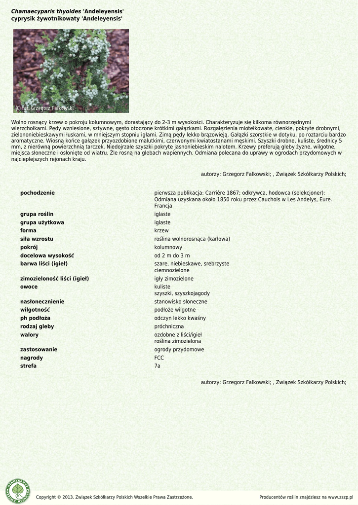 Chamaecyparis thyoides 'Andeleyensis' cyprysik żywotnikowaty 'Andeleyensis' Wolno rosnący krzew o pokroju kolumnowym, dorastający do 2-3 m wysokości. Charakteryzuje się kilkoma równorzędnymi wierzchołkami. Pędy wzniesione, sztywne, gęsto otoczone krótkimi gałązkami. Rozgałęzienia miotełkowate, cienkie, pokryte drobnymi, zielononiebieskawymi łuskami, w mniejszym stopniu igłami. Zimą pędy lekko brązowieją. Gałązki szorstkie w dotyku, po roztarciu bardzo aromatyczne. Wiosną końce gałązek przyozdobione malutkimi, czerwonymi kwiatostanami męskimi. Szyszki drobne, kuliste, średnicy 5 mm, z nierówną powierzchnią tarczek. Niedojrzałe szyszki pokryte jasnoniebieskim nalotem. Krzewy preferują gleby żyzne, wilgotne, miejsca słoneczne i osłonięte od wiatru. Źle rosną na glebach wapiennych. Odmiana polecana do uprawy w ogrodach przydomowych w najcieplejszych rejonach kraju. autorzy: Grzegorz Falkowski; , Związek Szkółkarzy Polskich; pochodzenie pierwsza publikacja: Carrière 1867; odkrywca, hodowca (selekcjoner): Odmiana uzyskana około 1850 roku przez Cauchois w Les Andelys, Eure. Francja grupa roślin iglaste grupa użytkowa iglaste forma krzew siła wzrostu roślina wolnorosnąca (karłowa) pokrój kolumnowy docelowa wysokość od 2 m do 3 m barwa liści (igieł) szare, niebieskawe, srebrzyste ciemnozielone zimozieloność liści (igieł) igły zimozielone owoce kuliste szyszki, szyszkojagody nasłonecznienie stanowisko słoneczne wilgotność podłoże wilgotne ph podłoża odczyn lekko kwaśny rodzaj gleby próchniczna walory ozdobne z liści/igieł roślina zimozielona zastosowanie ogrody przydomowe nagrody FCC strefa 7a autorzy: Grzegorz Falkowski; , Związek Szkółkarzy Polskich; Copyright © 2013. Związek Szkółkarzy Polskich Wszelkie Prawa Zastrzeżone. Producentów roślin znajdziesz na www.zszp.pl