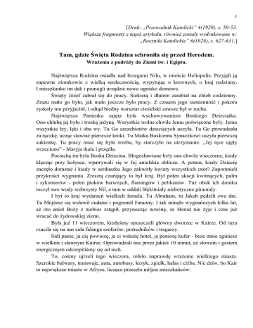 1 [Druk: „Przewodnik Katolicki” 4(1928), s. 50-53. Większe fragmenty z tegoż artykułu, również zostały wydrukowane w: „Roczniki Katolickie” 6(1928), s. 627-631.] Tam, gdzie Święta Rodzina schroniła się przed Herodem. Wrażenia z podróży do Ziemi św. i Egiptu. Najświętsza Rodzina osiadła nad brzegami Nilu, w mieście Heliopolis. Przyjęli ją zapewne ziomkowie z wielką serdecznością, wypytując o krewnych, o kraj rodzinny. I mieszkanko im dali i pomogli urządzić nowe ognisko domowe. Święty Józef zabrał się do pracy. Siekierą i dłutem zarabiał na chleb codzienny. Zrazu mało go było, jak mało jeszcze było pracy. Z czasem jego sumienność i pokora zyskały mu przyjaciół, i odtąd biedny warsztat ciesielski zawsze był w ruchu. Najświętsza Panienka zajęta była wychowywaniem Boskiego Dzieciątka. Ono chlubą jej było i troską jedyną. Wszystkie wolne chwile Jemu poświęcone były. Jemu wszystkie łzy, lęki i oba wy. Tu Go szczebiotów dziecięcych uczyła. Tu Go prowadzała za rączkę, ucząc stawiać pierwsze kroki. Tu Matka Boskiemu Synaczkowi uszyła pierwszą sukienkę. Tu pracy imać się było trzeba, by starczyło na utrzymanie. „Jej ręce ujęły wrzeciono” - Maryja tkała i przędła. Pociechą im była Boska Dziecina. Błogosławione były one chwile wieczorne, kiedy klęcząc przy kołysce, wpatrywali się w Jej anielskie oblicze. A potem, kiedy Dziecię zaczęło dorastać i kiedy w serduszku Jego zakwitły kwiaty wszystkich cnót? Zapomnieli przykrości wygnania. Zresztą czarujący to był kraj. Był pełen akacji kwitnących, palm i sykomorów - pełen ptaków barwnych, flamingów i pelikanów. Tuż obok ich domku toczył swe wody srebrzysty Nil, a tam w oddali błękitniały niebotyczne piramidy. I byt to kraj wydarzeń wielkich Izraela. Tu Abraham, tu Jakub pędzili swe dni. Tu Mojżesz się wsławił cudami i pogromił Faraony. I tak minęło wygnańczych kilka lat, aż oto anioł Boży z niebios zstąpił, przynosząc nowinę, że Herod nie żyje i czas już wracać do żydowskiej ziemi. Była już 11 wieczorem, kiedyśmy opuszczali główny dworzec w Kairze. Od razu rzuciła się na nas cała falanga szoferów, pośredników i tragarzy. Sidi panie, ja cię powiozę, ja ci wskażę hotel, ja poniosę kufer - beze mnie zginiesz w wielkim i sławnym Kairze. Oprowadzali nas przez jakieś 10 minut, aż słowem i gestem energicznym odczepiliśmy się od nich. To, cośmy ujrzeli tego wieczora, robiło naprawdę wrażenie wielkiego miasta. Szerokie bulwary, tramwaje, auta, autobusy, krzyk, zgiełk, hałas i ciżba. Nie dziw, bo Kair to największe miasto w Afryce, liczące przeszło miljon mieszkańców. 2 Wylądowaliśmy w jakimś hotelu francuskim i zasnęliśmy snem sprawiedliwych. Obudziło mię nad ranem głośne wołanie. Patrzę przez okno. W dolnej części minaretu stał muezzin i wołał donośnym głosem: - La Ilaha Ilalah en Mahomet Rasul Alah Alahu Akbar - Niemasz Boga ponad Boga Alaha, a Mahomet prorokiem tegoż Boga wszechmocnego; dalej do modlitwy! Pięć razy dziennie wchodzą muezzini na galerję minaretów i nawołują wiernych mahometan do modlitwy. I na odgłos muezzina wierny mahometanin klęka, a zwrócony w stronę miasta Mekki, odmawia swe modły. Rano poszliśmy do pobliskiego kościoła francuskich Jezuitów, by tam odprawić Mszę św. Dowie-[s. 50]dziawszy się, żeśmy Polakami, zaprosili nas Ojcowie na śniadanie. Ubawiliśmy się sposobem podawania kawy. Mianowicie kawę nalewa się tutaj do miseczki, a dużą łyżką stołową je się kawę jak u nas zupę. Pokazano nam też gimnazjum i internat, którymi Ojcowie kierują. Są to trzy olbrzymie gmachy, mogące pomieścić przeszło 1400 uczniów. Uczniowie przeważnie Arabowie. Zakład posiada też dwa autobusy, którymi się przywozi i odwozi uczniów, mieszkających w pewnym oddaleniu. Dla was, księża Polacy, jesteśmy gotowi uczynić wszystko, rzekł, uśmiechając się sympatyczny O. Prokurator. Zajechał samochód, wsiedliśmy razem z Ojcem i dalej w drogę. Po drodze załatwiliśmy w urzędzie policyjnym wszystkie formalności, zwiedziliśmy większe gmachy i place. Zajechaliśmy wreszcie na Bab El Louk, by tam zamieszkać u SS. Boromeuszek. Byłem mile zdziwiony, dowiedziawszy się, że jedna z sióstr jest Polką. Siostra Zyta - tak jej na imię - od 15 lat mieszka tutaj. Mówi płynnie po arabsku, choć nie zapomniała jeżyka ojczystego. Gdy zacząłem jej opowiadać o Polsce, rozpłakała się z radości. W kilku dniach zwiedziliśmy wszystkie ważniejsze pamiątki, słynne meczety, wielkie muzea, groby Mameluków, groby kalifów. Przy zwiedzaniu grobów kalifów miałem małą przygodę z brudaskami arabskimi. Chciałem ich bowiem sfotografować na tle grobów, które na zdjęciu obok zamieszczonym są widoczne - czterograniaste kaplice z okrągłymi kopułami. Po skończonej fotografii otoczyli mnie malcy, jakby żelaznym pierścieniem z wszystkich stron. - Nie puścimy cię sidi, dopóki nam za to nie zapłacisz. - Najwięcej dokuczały mi te maleństwa z boku, z rozwichrzonymi czuprynami. Co robić? Sięgnąłem do kieszeni, rzuciłem między nich trochę monety zdawkowej. Cała czereda od razu rzuciła się na ziemię, by pozbierać pieniądze. W czasie zamieszania, kiedy tam wrzało i kipiało, rozpocząłem strategiczny odwrót i byłem uratowany... 3 Ciekawe jest życie tego miasta. We dnie wśród skwaru słońca ulice nie są zbyt ożywione. Za to wieczorem panuje tutaj, taki ruch, że przejść niepodobna. To też najlepiej usiąść przed kawiarnią i przypatrywać się jego tętnu zbliska. Od razu dochodzą handlarze uliczni z wszelkim i możliwym towarem i zachęcają do kupna. Czego tam nie widać! Papierosy, jedwabie wschodnie, porcelanę, nawet części umeblowania dźwigają na plecach. Przy tym bezustannie naprzykrzają się, by coś od nich kupić. Są to natręty pierwszej gildy. Zaceniają wschodnim sposobem