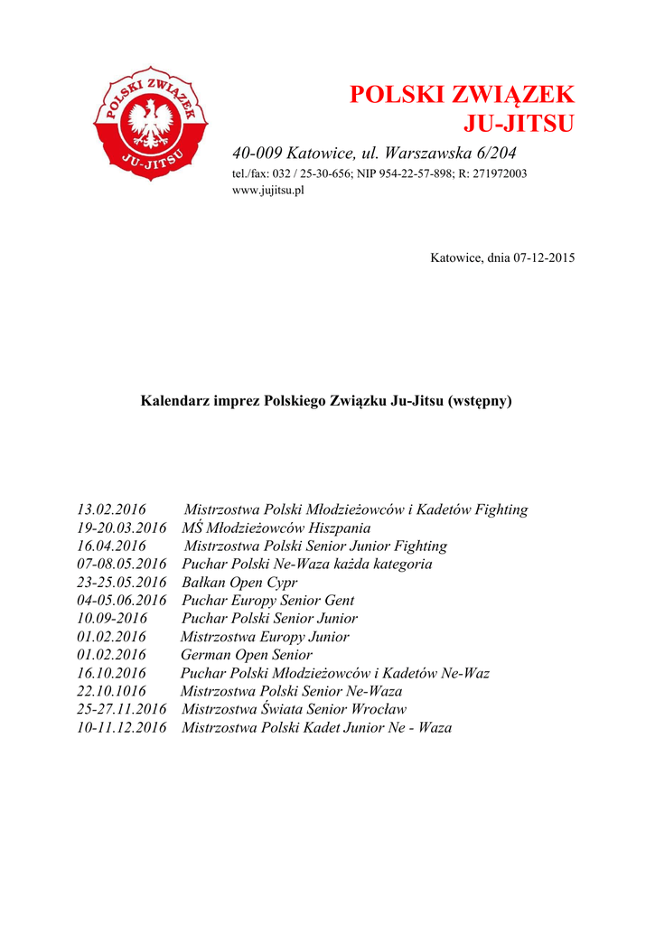 POLSKI ZWIĄZEK JUJITSU 40009 Katowice, ul. Warszawska 6/204 tel./fax: 032 / 2530656; NIP 9542257898; R: 271972003 www.jujitsu.pl Katowice, dnia 07122015 Kalendarz imprez Polskiego Związku JuJitsu (wstępny) 13.02.2016 1920.03.2016 16.04.2016 0708.05.2016 2325.05.2016 0405.06.2016 10.092016 01.02.2016 01.02.2016 16.10.2016 22.10.1016 2527.11.2016 1011.12.2016 Mistrzostwa Polski Młodzieżowców i Kadetów Fighting MŚ Młodzieżowców Hiszpania Mistrzostwa Polski Senior Junior Fighting Puchar Polski NeWaza każda kategoria Bałkan Open Cypr Puchar Europy Senior Gent Puchar Polski Senior Junior Mistrzostwa Europy Junior German Open Senior Puchar Polski Młodzieżowców i Kadetów NeWaz Mistrzostwa Polski Senior NeWaza Mistrzostwa Świata Senior Wrocław Mistrzostwa Polski Kadet Junior Ne Waza