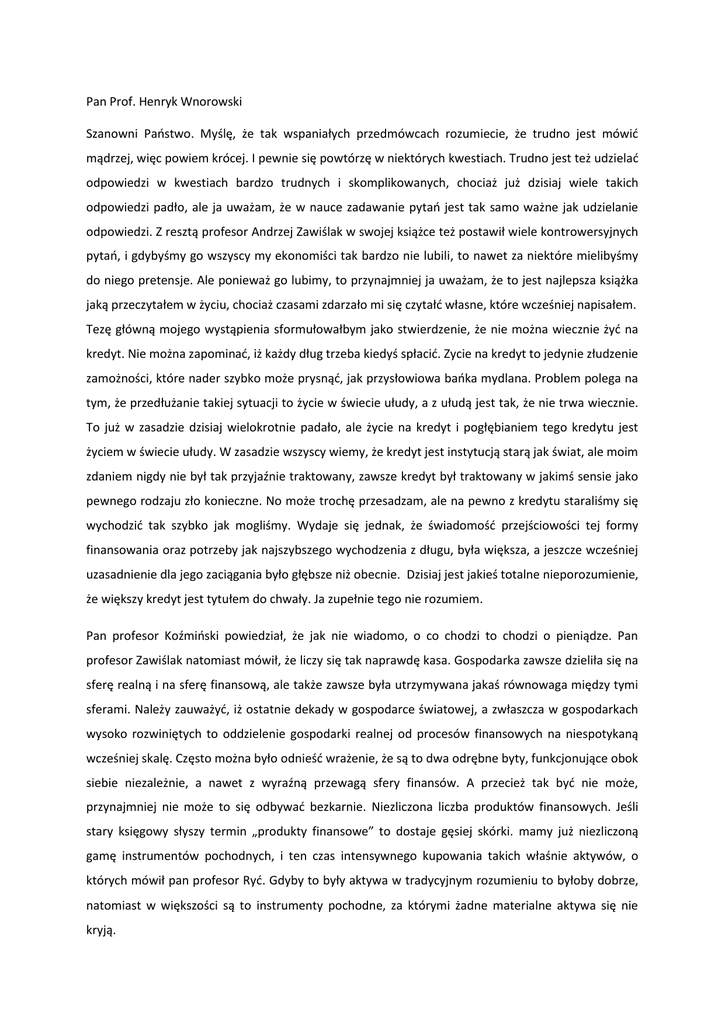 Pan Prof. Henryk Wnorowski Szanowni Państwo. Myślę, że tak wspaniałych przedmówcach rozumiecie, że trudno jest mówić mądrzej, więc powiem krócej. I pewnie się powtórzę w niektórych kwestiach. Trudno jest też udzielać odpowiedzi w kwestiach bardzo trudnych i skomplikowanych, chociaż już dzisiaj wiele takich odpowiedzi padło, ale ja uważam, że w nauce zadawanie pytań jest tak samo ważne jak udzielanie odpowiedzi. Z resztą profesor Andrzej Zawiślak w swojej książce też postawił wiele kontrowersyjnych pytań, i gdybyśmy go wszyscy my ekonomiści tak bardzo nie lubili, to nawet za niektóre mielibyśmy do niego pretensje. Ale ponieważ go lubimy, to przynajmniej ja uważam, że to jest najlepsza książka jaką przeczytałem w życiu, chociaż czasami zdarzało mi się czytałć własne, które wcześniej napisałem. Tezę główną mojego wystąpienia sformułowałbym jako stwierdzenie, że nie można wiecznie żyć na kredyt. Nie można zapominać, iż każdy dług trzeba kiedyś spłacić. Zycie na kredyt to jedynie złudzenie zamożności, które nader szybko może prysnąć, jak przysłowiowa bańka mydlana. Problem polega na tym, że przedłużanie takiej sytuacji to życie w świecie ułudy, a z ułudą jest tak, że nie trwa wiecznie. To już w zasadzie dzisiaj wielokrotnie padało, ale życie na kredyt i pogłębianiem tego kredytu jest życiem w świecie ułudy. W zasadzie wszyscy wiemy, że kredyt jest instytucją starą jak świat, ale moim zdaniem nigdy nie był tak przyjaźnie traktowany, zawsze kredyt był traktowany w jakimś sensie jako pewnego rodzaju zło konieczne. No może trochę przesadzam, ale na pewno z kredytu staraliśmy się wychodzić tak szybko jak mogliśmy. Wydaje się jednak, że świadomość przejściowości tej formy finansowania oraz potrzeby jak najszybszego wychodzenia z długu, była większa, a jeszcze wcześniej uzasadnienie dla jego zaciągania było głębsze niż obecnie. Dzisiaj jest jakieś totalne nieporozumienie, że większy kredyt jest tytułem do chwały. Ja zupełnie tego nie rozumiem. Pan profesor Koźmiński powiedział, że jak nie wiadomo, o co chodzi to chodzi o pieniądze. Pan profesor Zawiślak natomiast mówił, że liczy się tak naprawdę kasa. Gospodarka zawsze dzieliła się na sferę realną i na sferę finansową, ale także zawsze była utrzymywana jakaś równowaga między tymi sferami. Należy zauważyć, iż ostatnie dekady w gospodarce światowej, a zwłaszcza w gospodarkach wysoko rozwiniętych to oddzielenie gospodarki realnej od procesów finansowych na niespotykaną wcześniej skalę. Często można było odnieść wrażenie, że są to dwa odrębne byty, funkcjonujące obok siebie niezależnie, a nawet z wyraźną przewagą sfery finansów. A przecież tak być nie może, przynajmniej nie może to się odbywać bezkarnie. Niezliczona liczba produktów finansowych. Jeśli stary księgowy słyszy termin „produkty finansowe” to dostaje gęsiej skórki. mamy już niezliczoną gamę instrumentów pochodnych, i ten czas intensywnego kupowania takich właśnie aktywów, o których mówił pan profesor Ryć. Gdyby to były aktywa w tradycyjnym rozumieniu to byłoby dobrze, natomiast w większości są to instrumenty pochodne, za którymi żadne materialne aktywa się nie kryją. I gdyby wreszciespróbować teraz odpowiedzieć na pytanie zawarte w tytule naszego sympozjum „co robić?”. Pan profesor Koźmiński odwoływał się do klasyka, ja odwołam się także, tylko do trochę innego klasyka, a mianowicie słynnego hodowcy papryki – Stanisława Kowalczyka – który zadał pytanie „jak żyć?”. To mniej więcej o to samo chodzi i spróbowałbym może odpowiedzieć w ten sposób, że tak żyj, tak kieruj swoją rodziną, swoim przedsiębiorstwem, swoim powiatem, swoim województwem, swoim krajem, żeby w długim okresie czasu twoje wydatki nie były wyższe od twoich przychodów. W innym wypadku nic z tego nie będzie. W związku z tym, jak widzę przyszłość? Moim zdaniem niestety musimy zaakceptować fakt, przekonanie, że wcale nie jesteśmy na tym poziomie rozwoju, na którym jesteśmy tylko jesteśmy sporo niżej. 15 września 2008 roku, kiedy wybuchł kryzys finansowy, następnie bardzo szybko przeniósł się do sfery realnej, generalnie wiemy dlaczego tak się stało, rozumiemy ten mechanizm, ale wówczas nikt nie chciał tego powiedzieć oficjalnie. Wszyscy natomiast serwowali taką prawdę oto, że wpompujemy trochę pieniędzy, nic się nie dzieje i będziemy dalej na tym samym poziomie rozwoju i znowu pójdziemy do góry. Nieprawda, okazuje się, że minęły już trzy lata, zaklikanie rzeczywistości nie działa. Nie działa, ponieważ ciągle kryzys trwa, a na dobrą sprawę dopiero się zaczyna. Musimy się więc pogodzić, to znaczy my wszyscy w krajach wysoko rozwiniętych, że wcale nie jesteśmy na tym poziomie, na którym jesteśmy, tylko jesteśmy niżej i zaakceptować ten niższy poziom. Dlatego na zakończenie powiedziałbym coś takiego, że ja mam nadzieję, i wypada abyśmy wszyscy mieli nadzieję, że dobrze by było żeby rozwiązaniem nie było to, o czym któryś z moich przedmówców wspominał, że w którymś tam czasie, już dwukrotnie, z pomocą przychodziła wojna, oby nigdy tak nie było. Natomiast gospodarki wysoko rozwinięte, gospodarki unijne przede wszystkim muszą zacząć oszczędzać, muszą dostosowywać swoje wydatki do przychodów. Zresztą już widzimy, że rządy, to sobie uświadamiają, chociaż na razie nakreślają perspektywy konstruowania zrównoważonych budżetów na dosyć odległą przyszłość, na przyszłe kadencje. Ale z dwudziestu siedmiu rządów już trzynaście zadeklarowało datę skonstruowania zrównoważonego budżetu. To niestety nie wystarczy i musi przyjść ten czas, kiedy te zrównoważone budżety trzeba będzie realnie konstruować. Dziękuję bardzo.