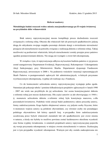 1 Dr hab. Mirosław Kłusek Kraków, dnia 13 grudnia 2015 Referat