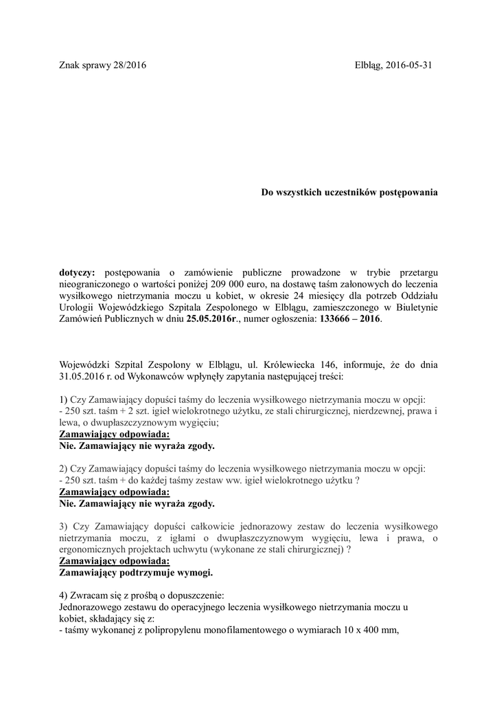 Znak sprawy 28/2016 Elbląg, 2016-05-31 Do wszystkich uczestników postępowania dotyczy: postępowania o zamówienie publiczne prowadzone w trybie przetargu nieograniczonego o wartości poniżej 209 000 euro, na dostawę taśm załonowych do leczenia wysiłkowego nietrzymania moczu u kobiet, w okresie 24 miesięcy dla potrzeb Oddziału Urologii Wojewódzkiego Szpitala Zespolonego w Elblągu, zamieszczonego w Biuletynie Zamówień Publicznych w dniu 25.05.2016r., numer ogłoszenia: 133666 – 2016. Wojewódzki Szpital Zespolony w Elblągu, ul. Królewiecka 146, informuje, że do dnia 31.05.2016 r. od Wykonawców wpłynęły zapytania następującej treści: 1) Czy Zamawiający dopuści taśmy do leczenia wysiłkowego nietrzymania moczu w opcji: - 250 szt. taśm + 2 szt. igieł wielokrotnego użytku, ze stali chirurgicznej, nierdzewnej, prawa i lewa, o dwupłaszczyznowym wygięciu; Zamawiający odpowiada: Nie. Zamawiający nie wyraża zgody. 2) Czy Zamawiający dopuści taśmy do leczenia wysiłkowego nietrzymania moczu w opcji: - 250 szt. taśm + do każdej taśmy zestaw ww. igieł wielokrotnego użytku ? Zamawiający odpowiada: Nie. Zamawiający nie wyraża zgody. 3) Czy Zamawiający dopuści całkowicie jednorazowy zestaw do leczenia wysiłkowego nietrzymania moczu, z igłami o dwupłaszczyznowym wygięciu, lewa i prawa, o ergonomicznych projektach uchwytu (wykonane ze stali chirurgicznej) ? Zamawiający odpowiada: Zamawiający podtrzymuje wymogi. 4) Zwracam się z prośbą o dopuszczenie: Jednorazowego zestawu do operacyjnego leczenia wysiłkowego nietrzymania moczu u kobiet, składający się z: - taśmy wykonanej z polipropylenu monofilamentowego o wymiarach 10 x 400 mm, wielkości oczek 0,7 x 0,7 mm, grubości taśmy 0,3 mm i gramaturze 28 g/m2, taśma bez osłonki. - dwóch jednorazowych narzędzi o kształcie helikalnym do zakładania taśmy metodą przezzasłonową (TVT Obturator) techniką od środka na zewnątrz (in-out) jednej prowadnicy skrzydełkowej, anatomicznej do bezpiecznego przeprowadzenia narzędzi metodą in-out? Zamawiający odpowiada: Nie. Zamawiający nie wyraża zgody. 5) Prosimy o podzielenie przedmiotu zamówienia na dwa Pakiety/Zadania: 1) Pakiet/Zadanie nr 1: 125 szt. System jednorazowy, sterylny do implantacji drogą załonową ‚„od dołu" w kierunku od cewki ku górze spojenia łonowego, składający się z: - dwóch igieł jednorazowych prawej i lewej ze stali chirurgicznej z trójkątnym szlifem z uchwytami z tworzywa sztucznego, grubość igieł do 4 mm. - taśmy polipropylenowej monofilamentowej o jednolitej strukturze, równych niepostrzępionych brzegach, bez elementów napinających. Taśma umieszczona w koszulce foliowej podzielonej w środkowej części taśmy - sterylne opakowanie dla jednego zestawu. 2) Pakiet/Zadanie nr 2: 125 szt, taśm do leczenia wysiłkowego nietrzymania moczu u kobiet, monofilamentowych, polipropylenowych, z plastikową osłonką na taśmie podzieloną w środkowej części, jednorodnych, niewchłanialnych, o długości 45 cm, szerokości 1,1 cm, porowatości max 1870 µm, grubości taśmy 0,33 mm, gramaturze 48 g/m2 , wytrzymałości 70 N/cm, wykonane w technologii quadriaxiual (geometria romboidalna, obecność włókien skośnych, podwójna nić wzmacniająca), brzegi zakończone bezpiecznymi pętelkami, oraz 1 szt. igły wielorazowego użytku, ze stali chirurgicznej, do implantacji w/w taśm? Zamawiający odpowiada: Nie. Zamawiający nie wyraża zgody na podzielenie przedmiotu zamówienia na dwa Pakiety / Zadania. 6) Czy Zamawiający dopuści w opisie przedmiotu zamówienia: 250 szt. taśm do leczenia wysiłkowego nietrzymania moczu u kobiet, monofilamentowych, polipropylenowych, z plastikową osłonką na taśmie podzieloną w środkowej części, jednorodnych, niewchłanialnych, o długości. 45 cm, szerokości 1,1 cm, porowatości max 1870 µm, grubości taśmy 0,33 mm, gramaturze 48 g/m2, wytrzymałości 70 N/cm, wykonane w technologii quadriaxiual (geometria romboidalna, obecność włókien skośnych, podwójna nić wzmacniająca), brzegi zakończone bezpiecznymi pętelkami, oraz 1 szt. igły wielorazowego użytku, ze stali chirurgicznej, do implantacji w/w taśm? Zamawiający odpowiada: Nie. Zamawiający nie wyraża zgody.