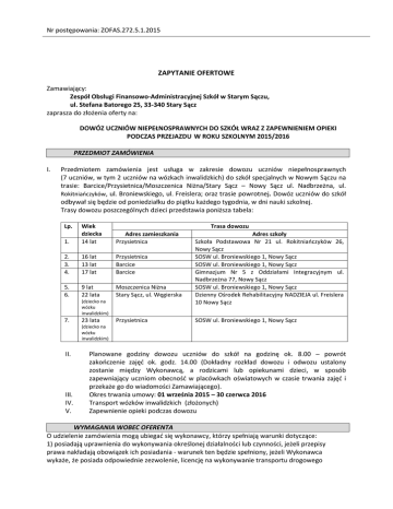 Nr postępowania: ZOFAS.272.5.1.2015 ZAPYTANIE OFERTOWE Zamawiający: Zespół Obsługi Finansowo-Administracyjnej Szkół w Starym Sączu, ul. Stefana Batorego 25, 33-340 Stary Sącz zaprasza do złożenia oferty na: DOWÓZ UCZNIÓW NIEPEŁNOSPRAWNYCH DO SZKÓŁ WRAZ Z ZAPEWNIENIEM OPIEKI PODCZAS PRZEJAZDU W ROKU SZKOLNYM 2015/2016 PRZEDMIOT ZAMÓWIENIA I. Przedmiotem zamówienia jest usługa w zakresie dowozu uczniów niepełnosprawnych (7 uczniów, w tym 2 uczniów na wózkach inwalidzkich) do szkół specjalnych w Nowym Sączu na trasie: Barcice/Przysietnica/Moszczenica Niżna/Stary Sącz – Nowy Sącz ul. Nadbrzeżna, ul. Rokitniańczyków, ul. Broniewskiego, ul. Freislera; oraz trasie powrotnej. Dowóz uczniów do szkół odbywał się będzie od poniedziałku do piątku każdego tygodnia, w dni nauki szkolnej. Trasy dowozu poszczególnych dzieci przedstawia poniższa tabela: Lp. 1. Wiek dziecka 14 lat Adres zamieszkania Przysietnica Trasa dowozu 2. 3. 4. 16 lat 13 lat 17 lat Przysietnica Barcice Barcice 5. 6. 9 lat 22 lata Moszczenica Niżna Stary Sącz, ul. Węgierska (dziecko na wózku inwalidzkim) 7. 23 lata Przysietnica Adres szkoły Szkoła Podstawowa Nr 21 ul. Rokitniańczyków 26, Nowy Sącz SOSW ul. Broniewskiego 1, Nowy Sącz SOSW ul. Broniewskiego 1, Nowy Sącz Gimnazjum Nr 5 z Oddziałami Integracyjnym ul. Nadbrzeżna 77, Nowy Sącz SOSW ul. Broniewskiego 1, Nowy Sącz Dzienny Ośrodek Rehabilitacyjny NADZIEJA ul. Freislera 10 Nowy Sącz SOSW ul. Broniewskiego 1, Nowy Sącz (dziecko na wózku inwalidzkim) II. III. IV. V. Planowane godziny dowozu uczniów do szkół na godzinę ok. 8.00 – powrót zakończenie zajęć ok. godz. 14.00 (Dokładny rozkład dowozu i odwozu ustalony zostanie między Wykonawcą, a rodzicami lub opiekunami dzieci, w sposób zapewniający uczniom obecność w placówkach oświatowych w czasie trwania zajęć i przekaże go do wiadomości Zamawiającego). Okres trwania umowy: 01 września 2015 – 30 czerwca 2016 Transport wózków inwalidzkich (złożonych) Zapewnienie opieki podczas dowozu WYMAGANIA WOBEC OFERENTA O udzielenie zamówienia mogą ubiegać się wykonawcy, którzy spełniają warunki dotyczące: 1) posiadają uprawnienia do wykonywania określonej działalności lub czynności, jeżeli przepisy prawa nakładają obowiązek ich posiadania - warunek ten będzie spełniony, jeżeli Wykonawca wykaże, że posiada odpowiednie zezwolenie, licencję na wykonywanie transportu drogowego Nr postępowania: ZOFAS.272.5.1.2015 osób. Zamawiający warunek ten będzie sprawdzał na podstawie przedłożonego dokumentu licencji na wykonywanie krajowego transportu drogowego osób: - koncesji, zezwolenia lub licencji; - aktualny odpis z właściwego rejestru, jeśli odrębne przepisy wymagają wpisu do rejestru, wystawiony nie wcześniej niż 6 miesięcy przed upływem terminu składania ofert. SPOSÓB OBLICZANIA CENY- warunki zamówienia 1. Cena oferty winna być wyliczona przez Wykonawcę w oparciu o zakres usługi, na podstawie kalkulacji własnej, za 1 dzień dowozu i przywozu (przy założeniu jednego kursu dziennie) 7 uczniów niepełnosprawnych wraz z opieką na trasie: Barcice/Przysietnica/Moszczenica Niżna/Stary Sącz – Nowy Sącz ul. Nadbrzeżna, ul. Rokitniańczyków, ul. Broniewskiego, ul. Freislera, w cenach ważnych do daty zakończenia realizacji umowy. 2. Cena określona w ofercie powinna obejmować wszystkie koszty związane z realizacją zadania. 3. W całkowitej cenie ofertowej będą zawarte wszelkie należności ponoszone przez wykonawcę, według stanu prawnego na dzień składania ofert. 4. Jedynym kryterium oceny ofert będzie cena brutto. 5. Rozliczenie transakcji następować będzie przelewem na konto wskazane na fakturze w ciągu 14 dni od dnia otrzymania faktury przez Wykonawcę TERMIN ORAZ SPOSÓB ZŁOŻENIA OFERTY Oferta powinna zostać sporządzona według załącznika nr 1 do niniejszego Zapytania ofertowego. Oferty należy złożyć w terminie do dnia 15 lipca 2015r. w siedzibie Zespołu Obsługi FinansowoAdministracyjnej Szkół w Starym Sączu, ul. Krakowska 26, 33-340 Stary Sącz, lub przesłać e-mailam na adres: [email protected] ZAŁĄCZNIKI Formularz ofertowy