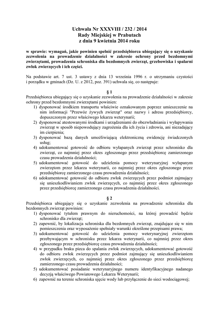 Uchwała Nr XXXVIII / 232 / 2014 Rady Miejskiej w Prabutach z dnia 9 kwietnia 2014 roku w sprawie: wymagań, jakie powinien spełnić przedsiębiorca ubiegający się o uzyskanie zezwolenia na prowadzenie działalności w zakresie ochrony przed bezdomnymi zwierzętami, prowadzenia schroniska dla bezdomnych zwierząt, grzebowiska i spalarni zwłok zwierzęcych i ich części. Na podstawie art. 7 ust. 3 ustawy z dnia 13 września 1996 r. o utrzymaniu czystości i porządku w gminach (Dz. U. z 2012, poz. 391) uchwala się, co następuje: §1 Przedsiębiorca ubiegający się o uzyskanie zezwolenia na prowadzenie działalności w zakresie ochrony przed bezdomnymi zwierzętami powinien: 1) dysponować środkiem transportu właściwie oznakowanym poprzez umieszczenie na nim informacji "Przewóz żywych zwierząt" oraz nazwy i adresu przedsiębiorcy, dopuszczonym przez właściwego lekarza weterynarii; 2) dysponować atestowanymi środkami i urządzeniami do obezwładniania i wyłapywania zwierząt w sposób niepowodujący zagrożenia dla ich życia i zdrowia, ani niezadający im cierpienia; 3) dysponować bazą danych umożliwiającą elektroniczną ewidencję świadczonych usług; 4) udokumentować gotowość do odbioru wyłapanych zwierząt przez schronisko dla zwierząt, co najmniej przez okres zgłoszonego przez przedsiębiorcę zamierzonego czasu prowadzenia działalności; 5) udokumentować gotowość do udzielenia pomocy weterynaryjnej wyłapanym zwierzętom przez lekarza weterynarii, co najmniej przez okres zgłoszonego przez przedsiębiorcę zamierzonego czasu prowadzenia działalności; 6) udokumentować gotowość do odbioru zwłok zwierzęcych przez podmiot zajmujący się unieszkodliwianiem zwłok zwierzęcych, co najmniej przez okres zgłoszonego przez przedsiębiorcę zamierzonego czasu prowadzenia działalności. §2 Przedsiębiorca ubiegający się o uzyskanie zezwolenia na prowadzenie schroniska dla bezdomnych zwierząt powinien: 1) dysponować tytułem prawnym do nieruchomości, na której prowadzić będzie schronisko dla zwierząt; 2) zapewnić, by lokalizacja schroniska dla bezdomnych zwierząt, znajdujące się w nim pomieszczenia oraz wyposażenie spełniały warunki określone przepisami prawa; 3) udokumentować gotowość do udzielenia pomocy weterynaryjnej zwierzętom przebywającym w schronisku przez lekarza weterynarii, co najmniej przez okres zgłoszonego przez przedsiębiorcę czasu prowadzenia działalności; 4) w przypadku braku pieca do spalania zwłok zwierzęcych, udokumentować gotowość do odbioru zwłok zwierzęcych przez podmiot zajmujący się unieszkodliwianiem zwłok zwierzęcych, co najmniej przez okres zgłoszonego przez przedsiębiorcę zamierzonego czasu prowadzenia działalności; 5) udokumentować posiadanie weterynaryjnego numeru identyfikacyjnego nadanego decyzją właściwego Powiatowego Lekarza Weterynarii; 6) zapewnić na terenie schroniska ujęcie wody lub przyłączenie do sieci wodociągowej; 7) zapewnić na terenie schroniska zbiornik bezodpływowy lub przyłączenie do sieci kanalizacyjnej; 8) dysponować urządzeniami do gromadzenia odchodów zwierząt; 9) dysponować atestowanymi środkami do obezwładniania i wyłapywania zwierząt w sposób niepowodujący zagrożenia dla ich życia i zdrowia, ani nie zadający im cierpienia; 10) dysponować środkiem transportu oznakowanym poprzez umieszczenie na nim informacji "Przewóz żywych zwierząt" oraz nazwy i adresu przedsiębiorcy, dopuszczonym przez właściwego lekarza weterynarii; 11) dysponować bazą danych umożliwiającą elektroniczną ewidencję świadczonych usług, z uwzględnieniem wymogów określonych w przepisach odrębnych; §3 1. Przedsiębiorca ubiegający się o zezwolenie na prowadzenie grzebowiska zwłok zwierzęcych i ich części powinien: 1) dysponować tytułem prawnym do nieruchomości, na której prowadzić będzie grzebowisko zwłok zwierzęcych; 2) posiadać decyzję Powiatowego Lekarza Weterynarii w Kwidzynie zatwierdzającą zakład do prowadzenia działalności w zakresie grzebowiska zwłok zwierzęcych i ich części; 3) posiadać obiekty i środki techniczne niezbędne do właściwego prowadzenia działalności, a w szczególności: a) chłodnię do czasowego przetrzymywania zwłok zwierzęcych i ich części; b) miejsce do magazynowania środków do dezynfekcji zwłok zwierzęcych i ich części przed ich zagrzebaniem; c) narzędzia do grzebania zwłok zwierzęcych i ich części; d) środek transportu do przewożenia zwłok zwierzęcych i ich części, dopuszczony do użytku przez Powiatowego Lekarza Weterynarii; 4) dysponować bazą danych umożliwiającą elektroniczną ewidencję świadczonych usług. 2. Teren przeznaczony na grzebowisko zwłok zwierzęcych i ich części powinien być zlokalizowany w sposób wykluczający możliwość szkodliwego wpływu na otoczenie, poprzez spełnienie następujących wymagań: 1) odległość grzebowiska od zabudowań mieszkalnych powinna wynosić co najmniej 150 m lub 50 m pod warunkiem, że teren w granicach od 50 do 150 m od grzebowiska posiada sieć wodociągową i wszystkie budynki korzystające z wody są do tej sieci podłączone; 2) odległość granicy grzebowiska od ujęć wody służących jako źródło zaopatrzenia sieci wodociągowej w wodę do picia i potrzeby gospodarcze nie może być mniejsza niż 500 m; 3) na terenie grzebowiska najwyższy poziom wody gruntowej powinien znajdować się co najmniej 1,5 m od najniższego poziomu miejsca grzebania zwierząt, a spływ wód powierzchniowych nie może następować w kierunku ujęć wód podziemnych oraz wód powierzchniowych; 4) teren grzebowiska powinien mieć ukształtowanie umożliwiające łatwy spływ wód opadowych i nie podlegać zalewom; 5) w przypadku planowanego zapotrzebowania na wodę należy określić źródło czerpania wody; 6) teren przeznaczony na grzebowisko powinien być ogrodzony i zabezpieczony przed dostępem osób postronnych