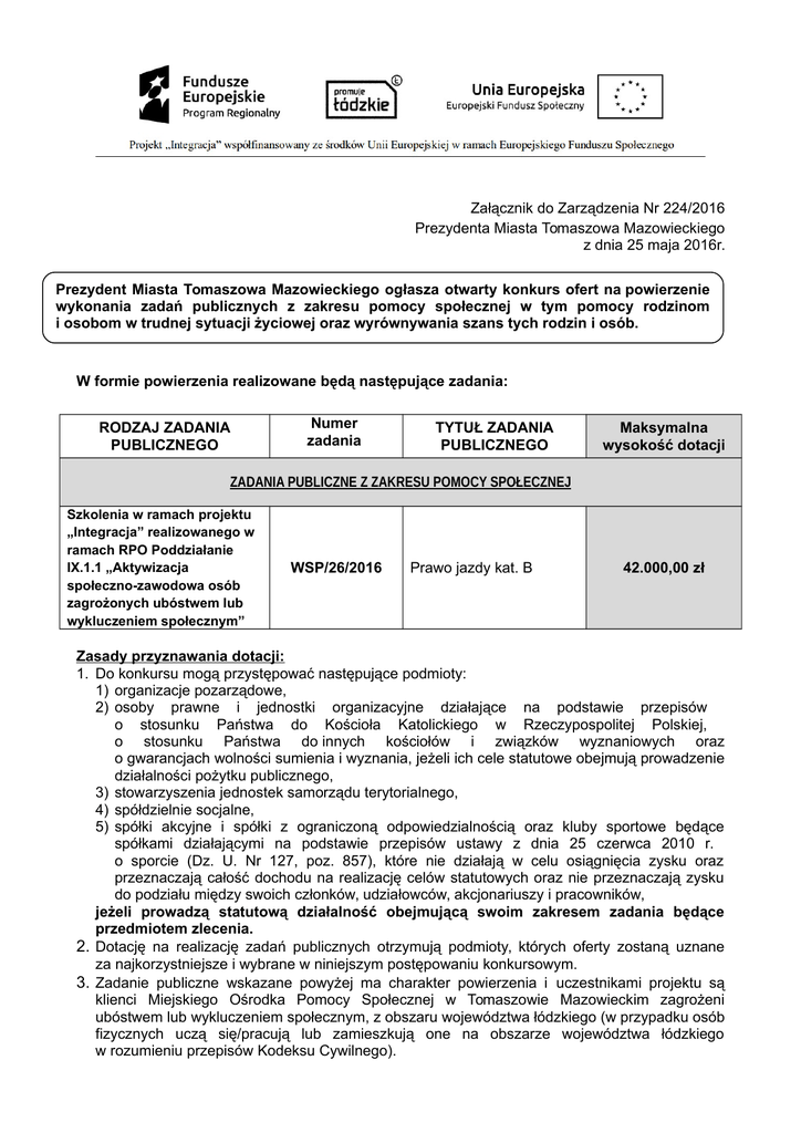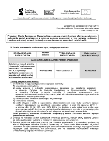 Załącznik do Zarządzenia Nr 224/2016 Prezydenta Miasta Tomaszowa Mazowieckiego z dnia 25 maja 2016r. Prezydent Miasta Tomaszowa Mazowieckiego ogłasza otwarty konkurs ofert na powierzenie wykonania zadań publicznych z zakresu pomocy społecznej w tym pomocy rodzinom i osobom w trudnej sytuacji życiowej oraz wyrównywania szans tych rodzin i osób. W formie powierzenia realizowane będą następujące zadania: RODZAJ ZADANIA PUBLICZNEGO Numer zadania TYTUŁ ZADANIA PUBLICZNEGO Maksymalna wysokość dotacji ZADANIA PUBLICZNE Z ZAKRESU POMOCY SPOŁECZNEJ Szkolenia w ramach projektu „Integracja” realizowanego w ramach RPO Poddziałanie IX.1.1 „Aktywizacja społeczno-zawodowa osób zagrożonych ubóstwem lub wykluczeniem społecznym” WSP/26/2016 Prawo jazdy kat. B 42.000,00 zł Zasady przyznawania dotacji: 1. Do konkursu mogą przystępować następujące podmioty: 1) organizacje pozarządowe, 2) osoby prawne i jednostki organizacyjne działające na podstawie przepisów o stosunku Państwa do Kościoła Katolickiego w Rzeczypospolitej Polskiej, o stosunku Państwa do innych kościołów i związków wyznaniowych oraz o gwarancjach wolności sumienia i wyznania, jeżeli ich cele statutowe obejmują prowadzenie działalności pożytku publicznego, 3) stowarzyszenia jednostek samorządu terytorialnego, 4) spółdzielnie socjalne, 5) spółki akcyjne i spółki z ograniczoną odpowiedzialnością oraz kluby sportowe będące spółkami działającymi na podstawie przepisów ustawy z dnia 25 czerwca 2010 r. o sporcie (Dz. U. Nr 127, poz. 857), które nie działają w celu osiągnięcia zysku oraz przeznaczają całość dochodu na realizację celów statutowych oraz nie przeznaczają zysku do podziału między swoich członków, udziałowców, akcjonariuszy i pracowników, jeżeli prowadzą statutową działalność obejmującą swoim zakresem zadania będące przedmiotem zlecenia. 2. Dotację na realizację zadań publicznych otrzymują podmioty, których oferty zostaną uznane za najkorzystniejsze i wybrane w niniejszym postępowaniu konkursowym. 3. Zadanie publiczne wskazane powyżej ma charakter powierzenia i uczestnikami projektu są klienci Miejskiego Ośrodka Pomocy Społecznej w Tomaszowie Mazowieckim zagrożeni ubóstwem lub wykluczeniem społecznym, z obszaru województwa łódzkiego (w przypadku osób fizycznych uczą się/pracują lub zamieszkują one na obszarze województwa łódzkiego w rozumieniu przepisów Kodeksu Cywilnego). 4. Złożenie oferty nie jest równoznaczne z przyznaniem dotacji. 5. Złożenie oferty nie gwarantuje przyznania środków w wysokości, o którą występuje oferent. W przypadku przyznania mniejszej kwoty dotacji oferentowi przysługuje prawo proporcjonalnego zmniejszenia zakresu rzeczowego zadania lub rezygnacji z realizacji zadania. 6. W przypadku otrzymania dotacji w niższej kwocie niż wnioskowana, oferent zobowiązany jest dostarczyć zaktualizowany kosztorys i harmonogram oferty, w przypadku wprowadzania zmian do tego harmonogramu. 7. Środki finansowe w ramach dotacji przeznaczone mogą być jedynie na wydatki bezpośrednio związane z realizacją zadania, m. in. na wynagrodzenia osób prowadzących szkolenie, koszty wynagrodzenia księgowej, badania lekarskie, zakup produktów w ramach serwisu kawowego, zakup materiałów warsztatowych, materiałów biurowych, koszt wynajmu sali. 8. Dotacji nie można przeznaczyć na zakup środków trwałych, inwestycyjnych i remontowych. 9. Szczegółowe warunki realizacji, dofinansowania zadania reguluje umowa zawarta pomiędzy Gminą Miasto Tomaszów Mazowiecki a oferentem. 10. Zadanie finansowane ze środków Unii Europejskiej w ramach Europejskiego Funduszu Społecznego. Termin i warunki realizacji zadania: Termin realizacji zadania nr WSP/26/2016: czerwiec - wrzesień 2016 r. 1. „Prawo jazdy kat. B” Zadanie obejmuje szkolenie grupowe dla maksymalnie 24 osób (17K, 7M) dla uczestników projektu „Integracja”: - czas trwania szkolenia (termin wykonania zamówienia): szkolenie powinno być przeprowadzone w okresie od czerwca 2016r. do września 2016r. maksymalnie, łącznie z egzaminem państwowym. - Zamawiający wymaga aby wykonawca przeprowadził badania lekarskie (profilaktyczne, specjalistyczne) dla uczestników szkolenia projektu „Integracja”, potwierdzających zdolność uczestników do prowadzenia pojazdów. Badania lekarskie powinny być przeprowadzone przed rozpoczęciem szkolenia. Koszt badań w całości pokryje wykonawca. - Przez wykonanie szkolenia zamawiający rozumie przeprowadzenie zajęć teoretycznych i zajęć praktycznych zgodnie z programem szkolenia oraz przeprowadzeniem egzaminów wewnętrznych i państwowych z części teoretycznej i praktycznej. - Liczba godzin szkolenia: kurs na prawo jazdy kategorii B 60 godzin na jednego uczestnika, w tym: 30 godzin z wiedzy teoretycznej, maksymalnie 7 godzin dziennie i 30 godzin z wiedzy praktycznej, nie mniej niż 2 godziny dziennie na jednego uczestnika szkolenia. Zamawiający wymaga aby po każdej godzinie zajęć teoretycznych odbywała się przerwa minimum 5 minut. Zamawiający wymaga aby przerwy nie były wliczane w liczbę godzin szkolenia, natomiast wykazywane były i uwzględnione w programie szkolenia – załącznik nr 1; - Szkolenie z zajęć teoretycznych powinno odbywać się w dni robocze od poniedziałku do piątku od godziny 8.00 do godziny 16.00 maksymalnie. Zajęcia praktyczne powinny być przeprowadzone sześć razy w tygodniu od poniedziałku do soboty od godziny 8.00 do godziny 20.00 maksymalnie. - Przedmiotem zamówienia jest zorganizowanie systemu szkoleń, w którym beneficjenci ostateczni odbędą szkolenia z zakresu uzyskania prawa jazdy kategorii B. Zamówienie winno być realizowane w blokach programowych zgodnie z aktualnymi regulacjami prawnymi w sprawie szkolenia na kierowców; - przedmiot zamówienia obejmuje również dowóz beneficjentów ostatecznych na zajęcia praktyczne oraz egzaminy, z