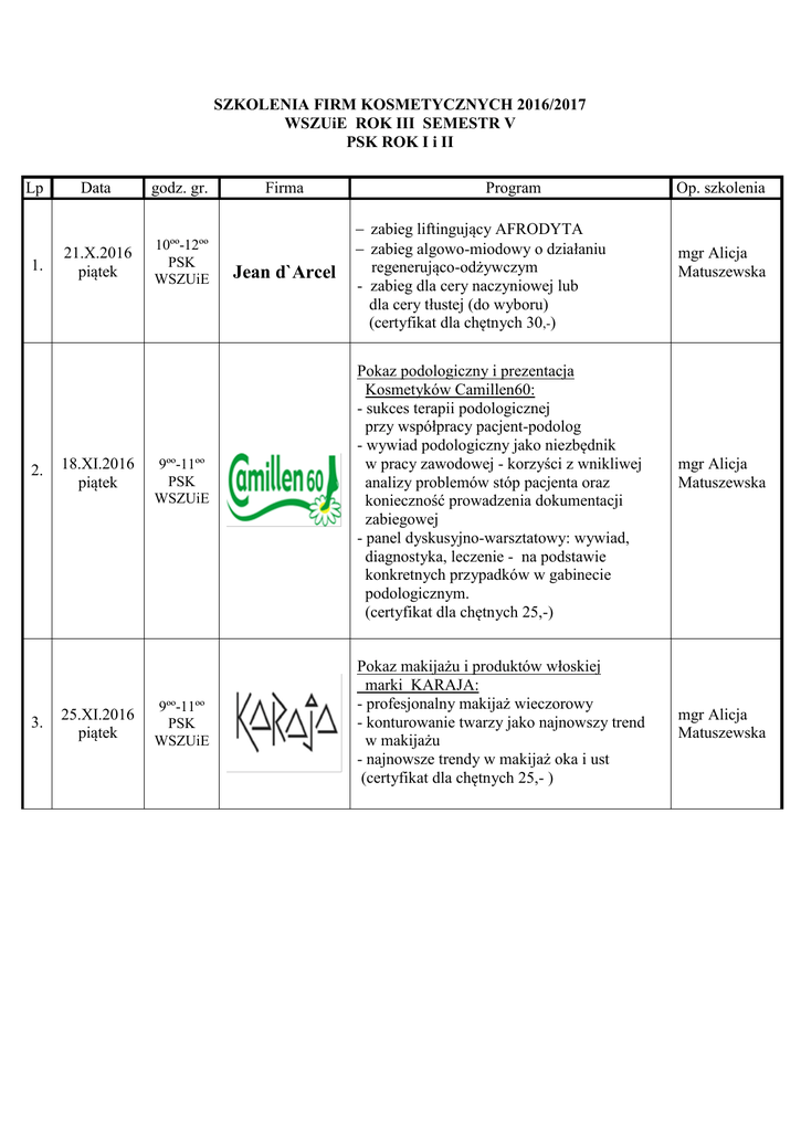 Szkolenia firm kosmetycznych 2016/17 semestr zimowy