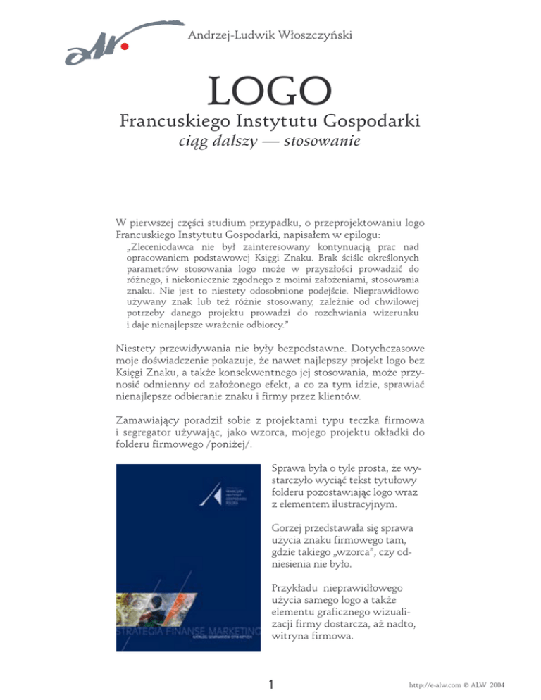 Andrzej-Ludwik Włoszczyński LOGO Francuskiego Instytutu Gospodarki ciąg dalszy — stosowanie W pierwszej części studium przypadku, o przeprojektowaniu logo Francuskiego Instytutu Gospodarki, napisałem w epilogu: „Zleceniodawca nie był zainteresowany kontynuacją prac nad opracowaniem podstawowej Księgi Znaku. Brak ściśle określonych parametrów stosowania logo moe w przyszłości prowadzić do rónego, i niekoniecznie zgodnego z moimi załoeniami, stosowania znaku. Nie jest to niestety odosobnione podejście. Nieprawidłowo uywany znak lub te rónie stosowany, zalenie od chwilowej potrzeby danego projektu prowadzi do rozchwiania wizerunku i daje nienajlepsze wraenie odbiorcy.” Niestety przewidywania nie były bezpodstawne. Dotychczasowe moje doświadczenie pokazuje, e nawet najlepszy projekt logo bez Księgi Znaku, a take konsekwentnego jej stosowania, moe przynosić odmienny od załoonego efekt, a co za tym idzie, sprawiać nienajlepsze odbieranie znaku i firmy przez klientów. Zamawiający poradził sobie z projektami typu teczka firmowa i segregator uywając, jako wzorca, mojego projektu okładki do folderu firmowego /poniej/. Sprawa była o tyle prosta, e wystarczyło wyciąć tekst tytułowy folderu pozostawiając logo wraz z elementem ilustracyjnym. Gorzej przedstawała się sprawa uycia znaku firmowego tam, gdzie takiego „wzorca”, czy odniesienia nie było. Przykładu nieprawidłowego uycia samego logo a take elementu graficznego wizualizacji firmy dostarcza, a nadto, witryna firmowa. 1 http://e-alw.com © ALW 2004 Zanim omówię błędy popełnione podczas projektowania witryny, z uyciem nowego znaku i elementu graficznego wizualizacji, krótka prezentacja starego i nowego projektu strony głównej serwisu: 1. stary aran witryny firmowej, przed zmianą logo, oparty na wyeksponowaniu znaku firmowego. Dla dodatkowego podkreślenia znak zawierał elementy animacji flash. Opracowanie serwisu www zrobiła profesjonalna firma. 2. nowy aran witryny firmowej z nowym logo Jak widać, porówując oba zaprezentowane przykłady, zmiany objęły nie tylko sam aran witryny, ale take modyfikację poruszania się po serwisie. Zrezygnowano ze strony wejściowej, na rzecz układu portalowego, niestety niekonsekwentnie – zabrakło pomysłu jak tak powstałą stronę główną wypełnić treścią. Nie jest moim celem omawianie projektowania stron www, pozostawmy więc ten temat, choć nie do końca, przechodząc do znacznie waniejszej kwestii – jak zastosowano znak firmowy oraz graficzny element wizualizacji w tak zaprojektowanej stronie www. Nawet najlepiej zaprojektowane logo nie działa nigdy w próni. W wiekszości zastosowań znak współwystępuje wraz z innymi elementami: tekstowymi, graficznymi czy fotograficznymi. Jednym z miejsc szczególnie wanych dla wizerunku firmy jest firmowa witryna www, na ogół prezentująca wiele elementów wanych,tak dla firmy, jak i jej klientów, prezentowanych wizualnie poprzez materiał ilustracyjny oraz tekstowo. Prawidłowe wyeksponowanie logo, 2 http://e-alw.com © ALW 2004 nazwy firmy, winno być w tym wypadku rzeczą szalenie waną. Zbudowanie prawidlowych relacji logo i nazwy firmy w stosunku do reszty zawartości strony determinuje moliwość dobrego zapamiętania znaku firmowego, przez odwiedzającego, stworzenia pozytywnego postrzegania firmy, ale take obrazuje wagę, jaką sama firma przykłada do własnego wizerunku. Wszystko to wpływa na pozytywne, lub negatywne emocje jakie zapamieta klient. Prawidłowe wywaenie proporcji poszczególnych części witryny, przemyślany układ i prosta nawigacja, relacje świateł (szczególnie wokół logo) i współgranie z innymi elementami — wszystko to powinny dąyć w efekcie do zbudowania najbardziej poądanego pozytywnego wizerunku firmy w oczach odwiedzającego. Sprawdźmy jak powysze zalecenia zostały zrealizowane na witrynie Francuskiego Instytutu Gospodarki. Brak Podstawowej Księgi Znaku uniemoliwił projektantowi witryny posłuenie się wzorcem postępowania. Oprócz samej Księgi zabrakło jednak take całościowego przemyślenia projektu, gradacji waności poszczególnych jego elementów a i samej treści. Powstała strona www podporządkowana czysto technicznemu układowi elementów i ich dopasowaniu do tak powstałej struktury ze sztucznym zapychaniem pustych przestrzeni. Przejdzmy do konkretów skupiając uwagę na dwu elementach wanych dla wizualizacji firmy — logo i elemencie graficznym. Logo w tej wersji układu, sygnet+logotyp, zostało zaprojektowane dla uycia w druku, podobnie jak element graficzny. Oba omawiane elementy oznaczone są na zrzucie ekranu jako A i B. Zanim szczegółowo omówię uycie obu elementów na stronie warto zwrócić uwagę na relację wielkości innych elementów na stronie www, a take uyty kolor wyeksponowania. B A 3 http://e-alw.com © ALW 2004 Na górze mamy wąską belkę nagłówka. Zawiera logo oraz fragment grafiki w sumie zajmując wysokość około 1/6 wysokości ekranu. Taka wysokość jest zbyt mała by prawidłowo wyeksponować logo w tej wielkości. Dodatkowo wprowadzona wąska belka ze słowem „Witaj”, oraz datą, zabiera niepotrzebnie miejsce, nie wnosząc adnych istotnych dla strony treści. Duą środkową kolumnę, w agresywnym kolorze pomarańczowym, wypełnia w połowie zdjęcie pełniące funkcję ozdobnika, sprawiające jednak wraenie „zapchajdziury”. Trzy małe bloczki tekstowe umieszczono, nie wiadomo czemu, na zdjęciu pozostawiając due puste tło poniej nich.Dodatkowo ustawione w jednej linii poziomej przesunięte są w lewo. Dominta kolumny środkowej, poprzez wielkość zdjęcia i kolor tła, przytłacza górny pasek nagłówkowy, wizualnie wypychając go poza obszar strony. Elementy najwaniejsze są zmarginalizowane – logo, element graficzny, ale take pasek nawigacyjny umieszczony w obszarze nagłówka. Sprawą dyskusyjną jest sama nawigacja – rozdzielenie menu na dwie listwy górną i dolną.