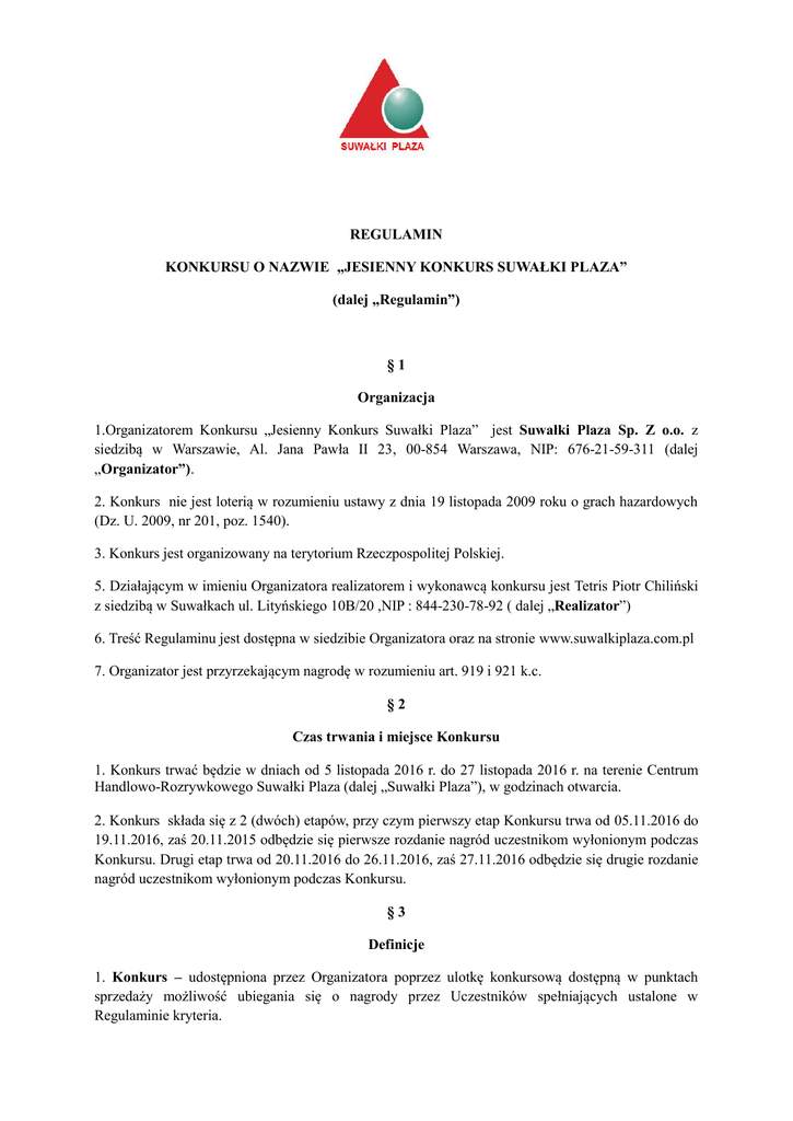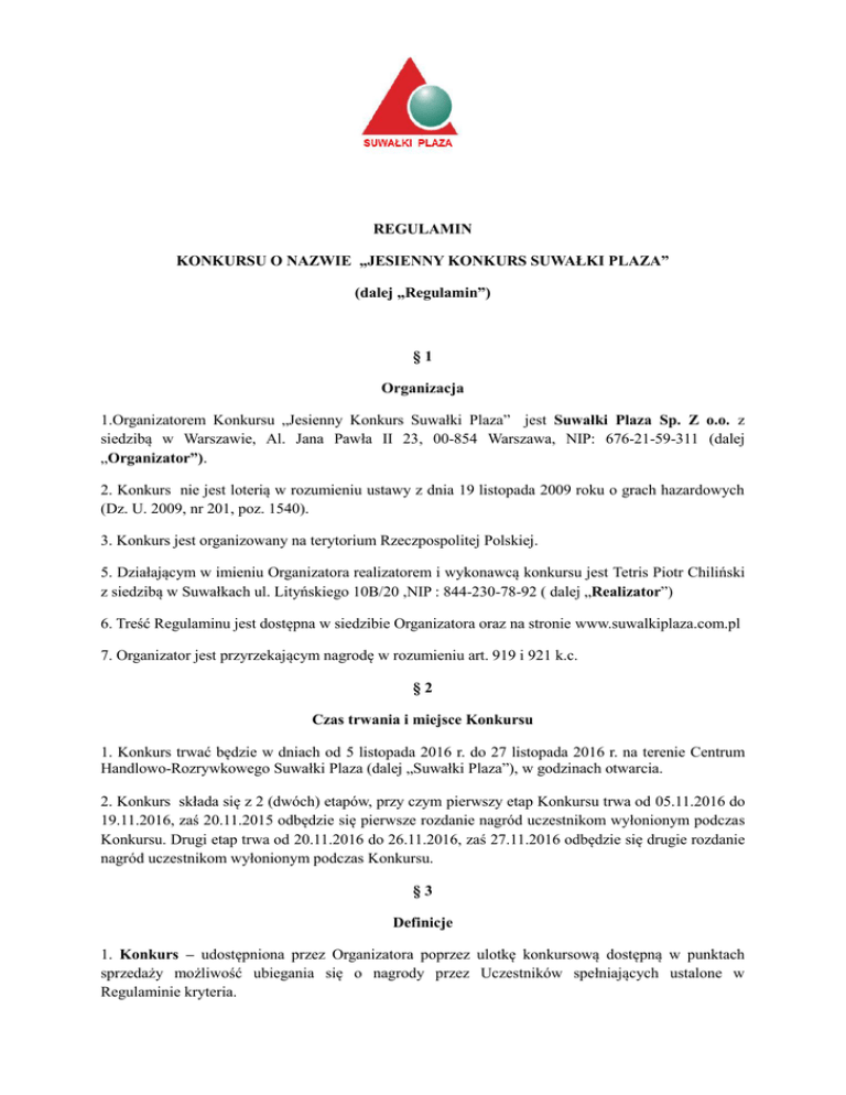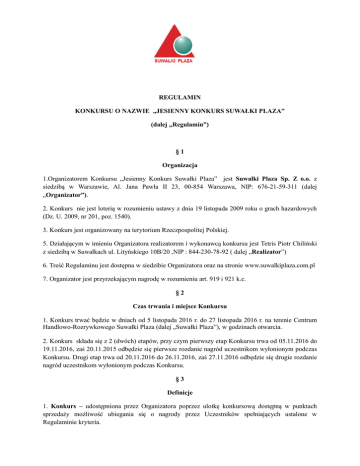 REGULAMIN KONKURSU O NAZWIE „JESIENNY KONKURS SUWAŁKI PLAZA” (dalej „Regulamin”) §1 Organizacja 1.Organizatorem Konkursu „Jesienny Konkurs Suwałki Plaza” jest Suwałki Plaza Sp. Z o.o. z siedzibą w Warszawie, Al. Jana Pawła II 23, 00-854 Warszawa, NIP: 676-21-59-311 (dalej „Organizator”). 2. Konkurs nie jest loterią w rozumieniu ustawy z dnia 19 listopada 2009 roku o grach hazardowych (Dz. U. 2009, nr 201, poz. 1540). 3. Konkurs jest organizowany na terytorium Rzeczpospolitej Polskiej. 5. Działającym w imieniu Organizatora realizatorem i wykonawcą konkursu jest Tetris Piotr Chiliński z siedzibą w Suwałkach ul. Lityńskiego 10B/20 ,NIP : 844-230-78-92 ( dalej „Realizator”) 6. Treść Regulaminu jest dostępna w siedzibie Organizatora oraz na stronie www.suwalkiplaza.com.pl 7. Organizator jest przyrzekającym nagrodę w rozumieniu art. 919 i 921 k.c. §2 Czas trwania i miejsce Konkursu 1. Konkurs trwać będzie w dniach od 5 listopada 2016 r. do 27 listopada 2016 r. na terenie Centrum Handlowo-Rozrywkowego Suwałki Plaza (dalej „Suwałki Plaza”), w godzinach otwarcia. 2. Konkurs składa się z 2 (dwóch) etapów, przy czym pierwszy etap Konkursu trwa od 05.11.2016 do 19.11.2016, zaś 20.11.2015 odbędzie się pierwsze rozdanie nagród uczestnikom wyłonionym podczas Konkursu. Drugi etap trwa od 20.11.2016 do 26.11.2016, zaś 27.11.2016 odbędzie się drugie rozdanie nagród uczestnikom wyłonionym podczas Konkursu. §3 Definicje 1. Konkurs – udostępniona przez Organizatora poprzez ulotkę konkursową dostępną w punktach sprzedaży możliwość ubiegania się o nagrody przez Uczestników spełniających ustalone w Regulaminie kryteria. 2. Uczestnik – osoba spełniająca warunki określone w § 3 Regulaminu. 3. Zgłoszenie Konkursowe – zgłoszenie uczestnictwa w Konkursie poprzez osobiste wrzucenie do urny konkursowej własnoręcznie wypełnionego kuponu konkursowego. Zgłoszenie konkursowe musi spełnić wymogi określone w § 3 i 4 Regulaminu. 4. Komisja Konkursowa – wskazane przez Organizatora osoby odpowiedzialne za wytypowanie spośród Uczestników zwycięzców danej edycji Konkursu. §4 Zasady uczestnictwa i przebieg Konkursu 1. W Konkursie nie mogą brać udziału pracownicy i współpracownicy Organizatora i Realizatora, Najemcy oraz pracownicy Najemców Centrum Handlowo-Rozrywkowego Suwałki Plaza, Członkowie Komisji Konkursowej, a także osoby będące ich: małżonkami, wstępnymi, zstępnymi, rodzeństwem, powinowatymi w linii prostej, jak również osoby pozostające z tymi pracownikami lub współpracownikami we wspólnym pożyciu albo będące z nimi związane węzłem przysposobienia lub kurateli. 2. Uczestnik w dniu rozpoczęcia Konkursu musi mieć ukończone 18 lat, posiadać pełną zdolność do czynności prawnych, miejsce zamieszkania na terytorium Rzeczypospolitej Polskiej. Aby wziąć udział w Konkursie, należy spełnić poniższe warunki: 3. Osoby, które w okresie trwania Konkursu dokonają w sklepach lub innych punktach handlowych znajdujących się na terenie Suwałki Plaza, uczestniczących w Konkursie zakupu towarów lub usług o wartości minimum 100 zł (słownie: stu złotych), są uprawnione do udziału w Konkursie poprzez otrzymanie kuponu konkursowego przy kasie podczas dokonywania zakupu w dniach trwania Konkursu. 4. Wartości zakupów na kwotę minimum 100 zł na jednym paragonie odpowiada wydaniu Uczestnikowi 1 sztuki kuponu konkursowego, wartości zakupów na kwotę minimum 200 zł odpowiada wydanie 2 sztuk kuponu konkursowego itd., jednak nie więcej niż 5 sztuk kuponów za 1 dowód zakupu (paragon fiskalny lub faktura VAT). 5. Uczestnik Konkursu jest zobowiązany do zachowania paragonu lub faktury w celu odbioru nagrody. 6. Kupon konkursowy zawiera następujące dane: a) miejsce na wpisanie danych osobowych klienta chcącego wziąć udział w Konkursie (zwanego dalej „Uczestnikiem”) – imię, nazwisko, nr telefonu, adres e-mail; b) miejsce na wpisanie informacji o dacie i godzinie dokonania zakupu, zgodnych z informacja na paragonie; c) miejsce na podpis Uczestnika Konkursu; d)każdy kupon zawiera informacje gdzie można zapoznać się z pełną treścią Regulaminu Konkursu. 7. Po otrzymaniu kuponu Uczestnik jest zobowiązany do: a) czytelnego wpisania swoich danych osobowych tj. imię i nazwisko, adres zamieszkania, adres email oraz numeru telefonu kontaktowego, odpowiedzi na zadania konkursowe oraz podpisania kuponu, potwierdzając tym samym akceptację warunków Konkursu i niniejszego Regulaminu oraz zgodę na przetwarzanie danych osobowych w celu realizacji celów Konkursu; b) osobistego wrzucenia kuponu do urny konkursowej; c) zachowania paragonu, paragonów fiskalnych (lub faktury VAT) za zakup uprawniający do uczestnictwa w Konkursie oraz okazanie go Organizatorowi podczas uroczystości wyłonienia zwycięzców. Niezachowanie powyższych dowodów dokonania zakupów wyklucza Uczestnika z Konkursu. 8. Kupon konkursowy powinien być wypełniony czytelnie, bez skreśleń lub poprawek. Kupony konkursowe wypełnione nieczytelnie lub niezgodnie z Regulaminem nie będą brały udziału w Konkursie. 9. Rozstrzygnięcie każdego etapu Konkursu odbędzie się publicznie w siedzibie Organizatora. W rozstrzygnięciu poszczególnych etapu Konkursu będą brały udział wyłącznie prawidłowo i czytelnie wypełnione Kupony konkursowe, wrzucone do urny konkursowej w okresie trwania danego etapu Konkursu. 10. Podczas rozstrzygnięcia każdego etapu Konkursu wyłoniony zostanie jeden zwycięzca nagrody głównej i dwóch zwycięzców nagród dodatkowych w następujący sposób: spośród kuponów znajdujących się w urnie wybrane zostaną przez Komisję Konkursową kolejno trzy osoby które umieściły najwięcej kuponów w urnie (trzecie miejsce, drugie miejsce i jako ostatnie – pierwsze miejsce). Osoby wyłonione będą musiały prawidłowo odpowiedzieć na pytanie dotyczące CHR Suwałki Plaza. P