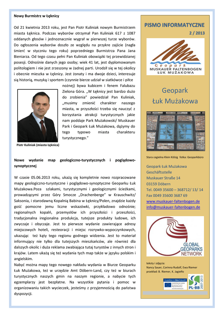 Nowy Burmistrz w Łęknicy Od 21 kwietnia 2013 roku, jest Pan Piotr Kuliniak nowym Burmistrzem miasta Łęknica. Podczas wyborów otrzymał Pan Kuliniak 617 z 1087 oddanych głosów i jednoznacznie wygrał w pierwszej turze wyborów. Do ogłoszenia wyborów doszło ze względu na przykre zajście (nagła śmierć w styczniu tego roku) poprzedniego Burmistrza Pana Jana Bieniarza. Od tego czasu pełni Pan Kuliniak obowiązki tej przewidzianej posesji. Odnośnie danych jego osoby; wiek 41 lat, jest dyplomowanym politologiem i nie jest zrzeszony w żadnej parti. Urodził się w tej okolicy i obecnie mieszka w Łęknicy. Jest żonaty i ma dwoje dzieci, interesuje sią historią, muzyką i sportem (czynnie bierze udział w siatkówce i piłce nożnej) bywa kubicem i fenem Falubazu Zielona Góra. „W Łęknicy jest bardzo dużo do zrobienia” powiedział Pan Kuliniak, „musimy zmienić charakter naszego miasta, w przyszłości trzeba się nauczyć z korzystania atrakcji turystycznych jakie nam poddaje Park Mużakowski/ Muskauer Park i Geopark Łuk Mużakowa, dążymy do tego typowo miasta charakteru turystycznego.” PISMO INFORMATYCZNE 2 / 2013 Geopark Łuk Mużakowa Piotr Kuliniak (miasto Łęknica) Nowe wydanie synoptycznej map geologiczno-turystycznych i poglądowo- W czasie 05.06.2013 roku, ukażą się kompletnie nowo rozpracowane mapy geologiczno-turystyczne i poglądowo-synoptyczne Geoparku Łuk Mużakowa.Poza szlakami, turystycznymi i geologicznymi ścieżkami, prowadzącymi Smocze „Drachenberge”i poglądowow Krauschwitz/ Nowe wydanieprzez mapGóry geologiczno-turystycznych Saksonia, i starodawną Kopalnią Babina w Łęknicy/Polen, znajdzie każdy synoptycznej. gość pomocne jemu liczne wskazówki, przykładowo odnośnie; W czasie 05.06.2013 ukażą sięich kompletnie nowo regionalnych kopalń, roku, przemysłów przyszłości i przeszłości, rozpracowaneiregionalna mapy geologiczno-turystyczne i poglądowotradycjonalna produkcja, tutejsze produkty ludowe, ich synoptyczne Geoparku Łuk Mużakowa.Poza szlakami, zwyczaje i obyczaje. Jest to pierwsze wydanie zawierające adresy turystycznymi i geologicznymi ścieżkami, prowadzącymi przez miejscowych hoteli, resteoracji i miejsc rozrywko-wypoczynkowych, Góry Smocze „Drachenberge” w Krauschwitz/ Saksonia, i ukazując też kąty tego regionu godnego widzenia. Jest to materiał starodawną Kopalnią Babina w Łęknicy/Polen, informujący nie gość tylko pomocne dla tutejszych mieszkańców, ale również dla znajdzie każdy jemu liczne wskazówki, dalszych okolic odnośnie; i duża reklama zwabiającakopalń, tutaj turystów z innych przykładowo regionalnych przemysłów ichstron i krajów. Latem ukażą się też wydania tych map także w języku polskim i przyszłości i przeszłości, tradycjonalna iregionalna produkcja, tutejsze produkty ludowe, ich zwyczaje i obyczaje. angielskim. Jest tomożna pierwsze wydanie zawierające adresy miejscowych Nabyć mapy tego nowego nakładu wydania w Biurze Geoparku hoteli, resteoracji i miejsc rozrywko-wypoczynkowych, Łuk Mużakowa, też w urzędzie Amt Döbern-Land, czy też w biurach ukazując też kąty tegogmin regionu turystycznych naszych na godnego naszym widzenia. regionie, a nabycie tych Jest to materiał informujący nie tylko dla tutejszych i egzemplarzy jest bezpłatne. Na wszystkie pytania i pomoc w angielskim. organizowaniu takich wycieczek, jesteśmy z przyjemnością do państwa dyspozycji. Stara cegielna Klein Kölzig fotka: Geoparkbüro Geopark Łuk Mużakowa Geschäftsstelle Muskauer Straße 14 03159 Döbern Tel. 0049 35600 – 368712/ 13/ 14 Fax 0049 35600 3687 69 www.muskauer-faltenbogen.de [email protected] teksty i zdjęcia: Nancy Sauer, Corinna Rudolf, Ewa Riemer przekład: B. Riemer, K. Jagiełło Imprezy w Geoparku Jak aktywny i jakie sukcesy osiągnął Geopark Łuk Mużakowa, informuje nas Geoparkbüro, w czasie otwarcia sezonu, w dniu 05.04.2013r. Pani Katarzyna Jagiełło, uzupełniła ten raport, przedstawiając polską stronę parku i jego kąty, które są godnością widzenia. Przedstawiono tutaj wartość i wydajność, zasługa do której przyczynił się projekt parku i turystyki, wzbudzając pomiędzy ludźmi ciekawość i zainteresowania, półroczna statystyka osiągnęła trzy tysiące przewijających się tam tutystów, na tym terytorium, do którego należy również dawna kopalnia węgla brunatnego Babina. W roku 2013, przewidziana jest tam wieża widokowa. Również ze strony niemieckiej, przyczyniają się współpracownicy Geoparku Łuk Mużakowado urozmaicenia planów turystyki, ciągłymi nowymi pomysłami. Tak przykładowo rozwija się plan wsi epoki lodowcowej „Eiszeitdorf” w Krauschwitz, współtowarzysząc z rozwojem kulturalnym gór smoczych „Drachenbergerpfad” połanczając się ścieżką trasową z gancarnią i punktem ceramiki, terytorialne połączenie w Krauschwitz. Te trzy punkty, znajdujące się na tym terytorium, są w jednym połączeniu i dają możliwość przez przekroczenie bramy, zwiedzenie tych objektów, dostępne jak dla pieszych tak i dla rowerzystów. Ta pierwsza planowana wycieczka, pedałowanie po Geoparku „Anradeln im Geopark” w dniu 06.04.2013r spełzła na niczym, przyczyną były złe warunki atmosferyczne. Drugi start przapadł na dzień 27.04.2013r, towarzyszył deszcz i temperatura poniżej 10° cel, trasa prowadziła z Friedrichshain do Tschernitz. Tutaj zwolennicy jazdy rowerowej mogli się zapoznać z tradycjami i obyczajami tutejszych stron, gdzie przykładowo o interesujących dziejach, z przyjemnością opowiadał Pan Wernitz. W miejscowości Döbern, można było zerknąć okiem na produkcję artykułów szklarskich, szklarni Cristalica. Zainteresowanie było duże i wzbudziło ciekawość rowerzystów widokiem dużych nowoczesno wyposażonych hal produkcyjnych. Na dużą skalę przygotowuje się tutaj masę stanu surowego, jako półproduktu do produkcji wszelkich artykułów szkl