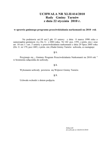 UCHWAŁA NR XLII/414/2010 Rady Gminy Tarnów z dnia 22 stycznia 2010 r. w sprawie gminnego programu przeciwdziałania narkomanii na 2010 rok Na podstawie art.18 ust.2 pkt 15 ustawy z dnia 8 marca 1990 roku o samorządzie gminnym (t.j. Dz. U. z 2001 roku, Nr 142 poz. 1591, z późn. zm.) oraz art. 10 ust.1 i ust. 3 ustawy o przeciwdziałaniu narkomanii z dnia 29 lipca 2005 roku (Dz. U. nr 179, poz.1485, z późn. zm.) Rada Gminy Tarnów uchwala, co następuje: § 1. Przyjmuje się „ Gminny Program Przeciwdziałania Narkomanii na 2010 rok ” w brzmieniu załącznika do uchwały. § 2. Wykonanie uchwały powierza się Wójtowi Gminy Tarnów. § 3. Uchwała wchodzi z dniem podjęcia. Załącznik do uchwały nr XLII/414/2010 Rady Gminy Tarnów z dnia 22 stycznia 2010 r. GMINNY PROGRAM PRZECIWDZIAŁANIA NARKOMANII NA 2010 ROK I. WSTĘP Narkomania jest jednym z najpoważniejszych problemów społecznych w Polsce. Niesie ze sobą poważne ryzyko dla zdrowia publicznego, w szczególności dotyczy to przenoszenia chorób takich jak: HIV, żółtaczka, choroby weneryczne a nawet gruźlica. Narkomania powstaje na skutek zanikania tradycyjnych więzi rodzinnych oraz osłabienia funkcji wychowawczej rodziny i szkoły. Ponadto narkomania jest ściśle związana z problemami społecznymi takimi jak prostytucja, przestępczość, bezrobocie czy bezdomność. Zmiany społeczno-ekonomiczne dokonujące się w naszym kraju, sprzyjają rozpowszechnianiu się mody na używanie środków psychoaktywnych. Wzrasta liczba osób eksperymentujących z narkotykami i już uzależnionych, poszukujących pomocy. Szczególnie niepokojące jest zjawisko wzrostu zagrożenia narkomania wśród młodzieży, głównie z powodu lekceważenia problemu i panującą modę na zażywanie substancji psychoaktywnych, traktowanych jako element zabawy, relaksu, rozrywki, pomocy w nauce, w sporcie, wspomaganiu przeżyć i doznań. Młodzież uważa, że krótkotrwałe lub jednorazowe zażywanie narkotyków nie jest szkodliwe dla zdrowia i nie prowadzi do uzależnienia. Ponadto powszechnie znana jest skala trudności leczenia, jak i efektywność leczenia osoby uzależnionej od narkotyków, która jest bardzo niska. Wynika stąd konieczność podejmowania działań profilaktycznych i edukacyjnych, skierowanych przede wszystkim do młodzieży. Istotną rolę w tym procesie powinni odegrać rodzice, wychowawcy, nauczyciele, pedagodzy, policja, organizacje pozarządowe i służby medyczne. Ważne jest współdziałanie tych wszystkich środowisk na rzecz przeciwdziałania narkomanii. Dlatego też Gminny Program Przeciwdziałania Narkomanii jest kontynuacją dotychczasowych działań w tym zakresie i został opracowany w oparciu o ustawę z dnia 29 lipca 2005 roku o przeciwdziałaniu narkomanii. II. DIAGNOZA Diagnoza lokalna badająca zdanie młodzieży o środkach uzależniających i przemocy, ze szczególnym uwzględnieniem alkoholu została przeprowadzona metodą ankiety rozdawanej wśród uczniów klas II Gimnazjum. Ankiety wypełniane były przez uczniów na terenie gimnazjum. W badaniu wzięło udział 50 uczniów. Z badań wynika, że : 39 – uczniów zna osoby ze swojej grupy wiekowej, które stosują jakieś środki odurzające lub uzależniające, w tym 5 – ro wymieniło narkotyki a pozostali papierosy i alkohol, 41 – uczniów nigdy nie próbowało środków odurzających, natomiast 9 – próbowało alkoholu i papierosów , w tym 2 osoby marihuanę, 41- uczniów uważa, że nie można bezpiecznie dla organizmu palić marihuanę , natomiast 9 – uważa, że można, 42 – uczniów uważa, że picie alkoholu na imprezach szkodzi , 9 – że nie, Kolejna pytanie zawarte w ankiecie brzmiało ; czy zdarzyło Ci się pić alkohol ? 5 – uczniów odpowiedziało, że rzadko 16 że, bardzo rzadko , natomiast 29 - nigdy nie piło alkoholu. Na pytanie czy twoi koledzy piją alkohol ? - tak odpowiedziało38 uczniów, nie – tylko 12, czy zwracałeś im uwagę aby tego nie robili ? - 18 uczniów odpowiedziało, że tak 32 – nie , w tym 10 - ponieważ i tak będą pić a zwracanie uwagi nic nie da, 22 uczniów – to nie moja sprawa. Kolejne pytanie dotyczyło – czy piwo to alkohol ? – 2 uczniów odpowiedziało, że nie, 48 – tak. Czy rodzice pozwalają swoim dzieciom pić alkohol przy okazji imienin czy np. świąt ? - 8 uczniów odpowiedziało, że czasem tak, 42 - uczniom rodzice nigdy nie pozwolili pić alkoholu, Czy kiedykolwiek namawiano Cię, być wypił alkohol ? - 16 uczniów odpowiedziało, że tak i byli to znajomi, koledzy lub koleżanki, Czy wypiłbyś butelkę wina , gdyby obiecano Ci za to bardzo atrakcyjny prezent? - tak odpowiedziało – 9 uczniów, 41- nie. Młodzież miała uzasadnić swoja odpowiedź, i zaskakujące jest to, ze pisząc nie – padła taka oto motywacja: − piję dla siebie, kiedy chcę i ile a nie za prezent, − nie piję taniego wina, ale też były i takie motywacje: − złożyłam przysięgę , że do 18 roku życia nie będę pić i palić i tego się trzymam, − ponieważ by mi to zaszkodziło, − ponieważ zdrowie jest ważniejsze. Czy w twojej rodzinie pije się alkohol ? - odpowiedź - często zaznaczyło 3 uczniów, tylko przy ważnych okazjach – 29, bardzo rzadko – 11 , wcale – 7 uczniów. Czy uważasz , że alkohol powinien być sprzedawany wszystkim, którzy chcą go kupić, bez względu na wiek ? - tak - odpowiedziało 3 osoby motywując to tym, że jak poproszą tych co stoją pod sklepem tzw. „żuli” to im kupią, to zakaz mija się z celem. Na pytanie czy palisz papierosy ? - tak odpowiedziało – 10 uczniów, 40 - nie. Ostatnie pytanie dotyczyło stosowania przemocy i tak: Czy użyłbyś przemocy, gdybyś uważał to za konieczne ? - tak odpowiedział 37 osób , uzasadniając to tym że, - ktoś zrobił mi krzywdę, więc muszę odreagować, − ktoś się ze mnie naśmiewa, − w obronie własnej, − w obronie kolegów. Z analizy przeprowadzonych ankiet 