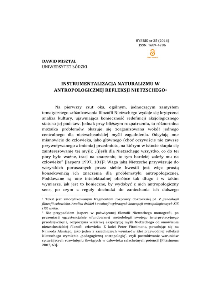 HYBRIS nr 35 (2016) ISSN: 1689-4286 DAWID MISZTAL UNIWERSYTET ŁÓDZKI INSTRUMENTALIZACJA NATURALIZMU W ANTROPOLOGICZNEJ REFLEKSJI NIETZSCHEGO1 Na pierwszy rzut oka, ogólnym, jednoczącym zamysłem tematycznego zróżnicowania filozofii Nietzschego wydaje się krytyczna analiza kultury, ujawniająca konieczność redefinicji aksjologicznego statusu jej podstaw. Jednak przy bliższym rozpatrzeniu, ta różnorodna mozaika problemów okazuje się zorganizowana wokół jednego centralnego dla nietzscheańskiej myśli zagadnienia. Odsyłają one mianowicie do człowieka, jako głównego (choć oczywiście nie zawsze przywoływanego z imienia) przedmiotu, na którym w istocie skupia się zainteresowanie tej myśli: „[j]eśli dla Nietzschego wszystko, co do tej pory było ważne, traci na znaczeniu, to tym bardziej zależy mu na człowieku” [Jaspers 1997, 101]2. Waga jaką Nietzsche przywiązuje do wszystkich poruszanych przez siebie kwestii jest więc prostą konsekwencją ich znaczenia dla problematyki antropologicznej. Poddawane są one intelektualnej obróbce tak długo i w takim wymiarze, jak jest to konieczne, by wydobyć z nich antropologiczny sens, po czym z reguły dochodzi do zaniechania ich dalszego Tekst jest zmodyfikowanym fragmentem rozprawy doktorksiej pt. Z genealogii filozofii człowieka. Analiza źródeł i ewolucji wybranych koncepcji antropologicznych XIX i XX wieku. 2 Nie przypadkiem Jaspers w poświęconej filozofii Nietzschego monografii, po prezentacji egzystencjalnie ufundowanej metodologii swojego interpretacyjnego przedsięwzięcia, rozpoczyna właściwą ekspozycję myśli Nietzschego od omówienia nietzscheańskiej filozofii człowieka. Z kolei Peter Fitzsimons, powołując się na Nimroda Alaniego, jako jeden z zasadniczych wymiarów idei przewodniej refleksji Nietzschego wymienia „pedagogiczną antropologię”, czyli poszukiwanie warunków sprzyjających rozwinięciu tkwiących w człowieku szlachetnych potencji [Fitzsimons 2007, 63]. 1 Dawid Misztal Instrumentalizacja naturalizmu w antropologicznej refleksji Nietzschego rozważania i przesunięcia uwagi ku nowym problemom w nadziei wykrycia w nich podobnych, tj. dotyczących specyficznie ludzkiego istnienia, treści [Schacht 2002, 267]. Rozpatrywana w tym świetle, filozoficzna praktyka Nietzschego wydaje się wspierać na fundamentalnym, hume’owskim przeświadczeniu, zgodnie z którym wszystko, co stanowić może przedmiot ludzkiego poznania oraz przedmiot ludzkich sądów (a zatem wszystko, co składa się na ludzką rzeczywistość), „zależy w pewnej mierze od nauki o człowieku” [Hume 1951, 1, 3]3. „Wszystko [bowiem], co jest dla nas rzeczywiste, co godne miłości i uwielbienia albo co nikczemne, dostępne jest nam ostatecznie jedynie w postaci człowieka i tylko w sposób, w jaki on doświadcza bytu” [Jaspers, 102]. Stąd też rozważanie jakiejkolwiek przynależącej do ludzkiego świata kwestii w oderwaniu od jej podstawowego, antropologicznego podłoża, musi, zdaniem Nietzschego, nieuchronnie rodzić błędy i nieporozumienia [Schacht, 267]. W prezentowanej pracy chciałbym się przyjrzeć sposobom, na jakie manifestuje się to fundamentalne dla filozofii Nietzschego przeświadczenie: jak jest rozumiane, jakie przybiera formy, jakie wyznacza się mu cele, i jakie obiera się dla ich realizacji metody. Aby ukazać te sposoby, wyjdę od tego, jak Nietzsche definiuje antropologiczne zadanie swej myśli. Następnie, podążając w kierunku wyznaczonym przez tę definicję, przyjrzę się funkcjonowaniu w jego refleksji naturalistycznej perspektywy interpretacyjnej, jako że to ona właśnie stanowi istotny element strategii realizacji tegoż zadania. Pozwoli to ujawnić kolejny (obok właśnie naturalizacji filozofii Nie sugeruję, że sam Nietzsche postrzegał obecność tego przeświadczenia w swej myśli jako zadłużenie względem Hume’a, czy też rezultat świadomego nawiązania do myśli Szkota. Główne tezy tej ostatniej poznał Nietzsche najprawdopodobniej jedynie z drugiej ręki [Davey 2007, 153], a jedynym dziełem Hume’a, które posiadał i czytał, były Dialogi o religii naturalnej. „Według niemieckich instynktów oceny” relfeksja Hume’a wydaje się Nietzschemu „zbyt powierzchowna” [Nietzsche 2003b, 36], wpisuje więc jej autora, obok Hobbes’a i Locke’a, w poczet angielskich filozofów (błędnie – wszak Hume był Szkotem), którzy „na ponad stulecie poniżyli pojęcie ‘filozof’ i umniejszyli jego wartość” [Nietzsche 2001, 183]. Mimo to zbieżność ogólnej antropologicznej intencji, która podskórnie funkcjonuje w myśli Nietzschego, z tezami otwierającymi Traktat o naturze ludzkiej wydaje się nie budzić wątpliwości. W kwestii relacji między filozofią Hume’a a myślą Nietzschego por. też przywołany powyżej artykuł Davey’ego oraz pracę M. Warnock Nietzsche Conception of Truth (1978). 3 [24] Dawid Misztal Instrumentalizacja naturalizmu w antropologicznej refleksji Nietzschego człowieka) komponent antropologicznego przedsięwzięcia Nietzschego oraz określić ich wzajemne relacje. Jak mam nadzieję wykazać, Nietzsche instrumentalizuje naturalistyczne kategorie interpretacyjne, 1) wykorzystując je do właściwego określenia przedmiotu dalszych badań antropologicznych, oraz 2) wpisując je w logikę swej krytyki metafizyki. Instrumentalizacja ta nadaje próbie naturalizacji filozofii człowieka status przedsięwziecia wstępnego, przygotowującego grunt pod dalsze rozważania. W tym świetle antropologiczne zadanie filozoficznego projektu Nietzschego ulega redefinicji czy „przewartościowaniu”, zyskując ewidentnie egzystencjalne dookreślenie. Historyczne znaczenie Nietzschego dla dyskursu antropologicznego polega właśnie na próbie zamknięcia naturalistycznej i egzystencjalnej wykładni istoty ludzkiej w ramach jednego antropologicznego przedsięwzięcia. W autointerpretacji Nietzschego sygnalizowana powyżej ogól