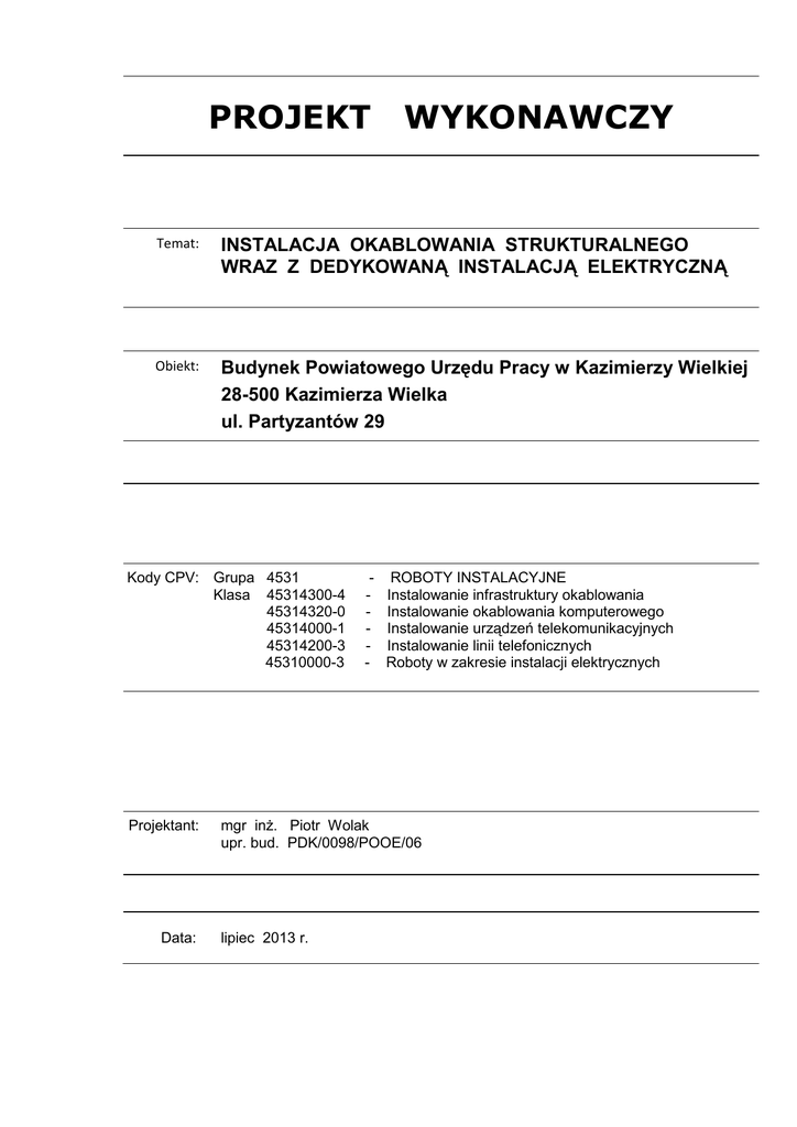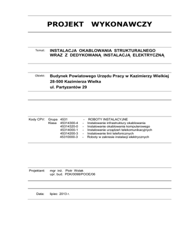 PROJEKT WYKONAWCZY Temat: INSTALACJA OKABLOWANIA STRUKTURALNEGO WRAZ Z DEDYKOWANĄ INSTALACJĄ ELEKTRYCZNĄ Obiekt: Budynek Powiatowego Urzędu Pracy w Kazimierzy Wielkiej 28-500 Kazimierza Wielka ul. Partyzantów 29 Kody CPV: Grupa 4531 Klasa 45314300-4 45314320-0 45314000-1 45314200-3 45310000-3 Projektant: Data: - ROBOTY INSTALACYJNE Instalowanie infrastruktury okablowania Instalowanie okablowania komputerowego Instalowanie urządzeń telekomunikacyjnych Instalowanie linii telefonicznych Roboty w zakresie instalacji elektrycznych mgr inŜ. Piotr Wolak upr. bud. PDK/0098/POOE/06 lipiec 2013 r. ZAWARTOŚĆ OPRACOWANIA I. OKABLOWANIE STRUKTURALNE 1. Zakres projektu Przedmiot opracowania 2. Normy i wytyczne 3. Rozwiązania szczegółowe ZałoŜenia do projektu – wytyczne UŜytkownika 4. Struktura systemu okablowania Okablowanie poziome Medium transmisyjne miedziane Gniazda abonenckie (PEL) 5. Trasy kablowe 6. Wymagania gwarancyjne 7. Odbiór i pomiary sieci 8. Dokumentacja powykonawcza 9. Uwagi końcowe 10. Alternatywne rozwiązania II. DEDYKOWANA INSTALACJA ELEKTRYCZNA 1. Zakres projektu 2. Parametry elektryczne 3. Rozdział energii elektrycznej 4. Zasilanie UPS 5. Zasilanie szafy dystrybucyjnej CPD 6. Instalacja elektryczna dedykowane dla zasilania urządzeń komputerowych 7. Zasilanie klimatyzatora serwerowni 8. Ochrona przeciwprzepięciowa 9. Instalacja ochrony przeciwporaŜeniowej 10. Uwagi końcowe 11. Obliczenia techniczne III. RYSUNKI Schemat instalacji okablowania strukturalnego. Schemat instalacji elektrycznej. Tablica TK. Budowa tablicy TK Plan instalacji. Rzut piętra II rys. 1 rys. 2 rys. 3 rys. 4 I. OKABLOWANIE STRUKTURALNE 1. ZAKRES PROJEKTU Przedmiot opracowania: Przedmiotem opracowania jest projekt systemu okablowania strukturalnego kategorii 6 wraz z dedykowaną instalacją zasilającą w Budynku Powiatowego Urzędu Pracy przy ul. Partyzantów 29 w Kazimierzy Wielkiej. Projekt nie obejmuje dostawy i montaŜu punktu dystrybucyjnego (szafy 19” i jej wyposaŜenia), UPS oraz zewnętrznych połączeń miedzianych i światłowodowych. 2. NORMY I WYTYCZNE Podstawą do opracowania zagadnień związanych z okablowaniem strukturalnym są normy okablowania strukturalnego. Normy europejskie dotyczące wymagań ogólnych i specyficznych dla danego środowiska: • • EN 50173-1:2007 Technika Informatyczna – Systemy okablowania strukturalnego – Część 1: Wymagania ogólne EN 50173-2:2007 Technika Informatyczna – Systemy okablowania strukturalnego – Część 2: Budynki biurowe; Normy europejskie pomocnicze: • PN-EN 50174-1:2002 Technika informatyczna. Instalacja okablowania – Część 1Specyfikacja i zapewnienie jakości; • PN-EN 50174-2:2002 Technika informatyczna. Instalacja okablowania – Część 2 Planowanie i wykonawstwo instalacji wewnątrz budynków; • PN-EN 50346:2002 Technika informatyczna. Instalacja okablowania - Badanie zainstalowanego okablowania • PN-EN 50310:2007 Stosowanie połączeń wyrównawczych i uziemiających w budynkach z zainstalowanym sprzętem informatycznym; System okablowania oraz wydajność komponentów musi pozostać w zgodzie z wymaganiami normy EN 50173-1:2007 lub z adekwatnymi normami międzynarodowymi lub amerykańskimi, tj. ISO/IEC 11801 lub TIA/EIA568B. 3. ROZWIĄZANIA SZCZEGÓŁOWE ZałoŜenia do projektu – wytyczne UŜytkownika: • Lokalizacja, ilość i wielkość stanowisk roboczych wynika z wskazówek UŜytkownika końcowego; • Wszystkie elementy pasywne składające się na okablowanie strukturalne muszą być oznaczone nazwą lub znakiem firmowym, tego samego producenta okablowania i pochodzić z jednolitej oferty reprezentującej kompletny system w takim zakresie, aby zostały spełnione warunki niezbędne do uzyskania bezpłatnego certyfikatu gwarancyjnego w/w producenta; • System okablowania musi posiadać wydajność klasy E potwierdzoną przez niezaleŜne laboratorium • Środowisko, w którym będzie instalowany osprzęt kablowy jest środowiskiem biurowym i zostało ono sklasyfikowane, jako łagodne wg. MICE zgodnie z EN 50173-1:2007; • Okablowanie poziome ma być prowadzone nieekranowanym kablem typu: U/UTP o paśmie przenoszenia 500 MHZ w osłonie LSZH (powłoka wytwarzająca mało dymu, bezhalogenowa) o średnica Ŝyły: 23AWG (0,574mm) i średnicy zewnętrznej: 6,1mm, koloru niebieskiego. • Konfiguracja oraz rozmieszczenie gniazd końcowych przedstawiona została na podkładach architektonicznych i schematach dołączonych do projektu; • Okablowanie ma być zrealizowane w oparciu o nieekranowany moduł gniazda RJ45 kat. 6 UTP • • Zgodnie z wymaganiami norm kaŜdy 4-ro parowy kabel ma być trwale zakończony na nieekranowanym module RJ45 umieszczonym w gnieździe od strony uŜytkownika oraz na panelu krosowym w szafie; Punkt końcowy PEL oparty zostanie na płycie czołowej - adapterze dopasowanym do standardu gniazd elektrycznych wybranych przez inwestora z moŜliwością montaŜu dwóch modułów gniazd RJ45 UTP w puszce podtynkowej. Moduł Keystone powinien charakteryzować się następującymi cechami: - konstrukcja zapewniająca moŜliwość jednoczesnego zaterminowania wszystkich Ŝył (konstrukcja beznarzędziowa, narzędzie terminujące), - separator par na wejściu do modułu krosowniczego, - styki pokryte warstwą złota, - szczęki IDC pokryte warstwą srebra, - przesłona przeciwkurczowa, - kontakt szczęk IDC z Ŝyłą przewodu powinien być ustawiony pod kątem 45 stopni, - wykonane z materiałów niepalnych UL 94V-0, - wyraźne oznaczenie producenta, serii, kategorii, oraz schematu rozszycia w sekwencji T568A/B W celu zagwarantowania jak najwyŜszych marginesów pracy i zapasów parametrów transmisyjnych nie dopuszcza się rozwiązań złoŜonych z elementów róŜnych producentów, (tj. kabla, gniazd, kabli krosowych, itp.). Aby zagwarantować rzeczywiste i powtarzalne parametry Kategorii 6 oraz potwierdzić zgodność proponowanego rozwiązania z najnowszymi edycjami ob