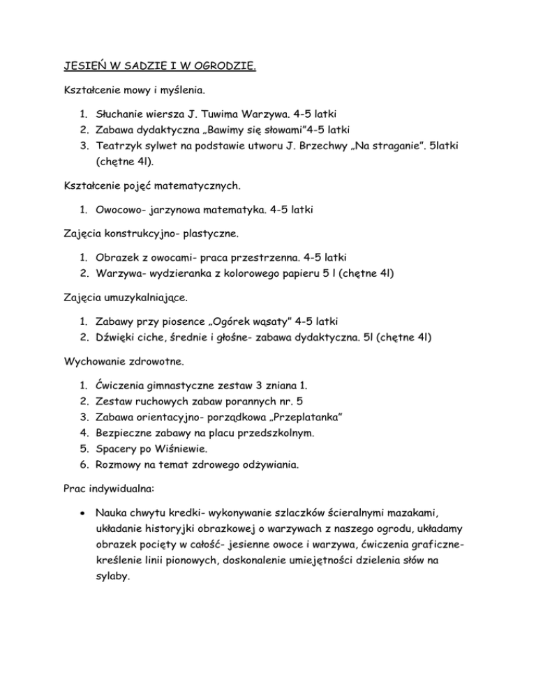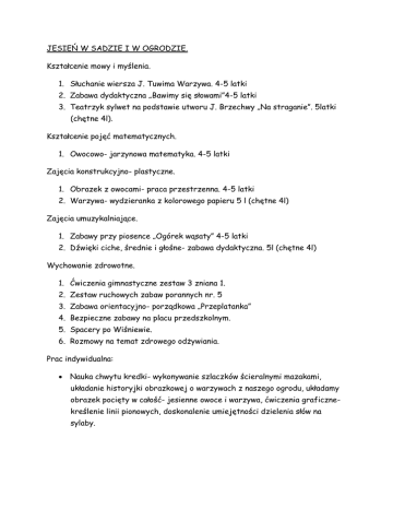 JESIEŃ W SADZIE I W OGRODZIE. Kształcenie mowy i myślenia. 1. Słuchanie wiersza J. Tuwima Warzywa. 4-5 latki 2. Zabawa dydaktyczna „Bawimy się słowami”4-5 latki 3. Teatrzyk sylwet na podstawie utworu J. Brzechwy „Na straganie”. 5latki (chętne 4l). Kształcenie pojęć matematycznych. 1. Owocowo- jarzynowa matematyka. 4-5 latki Zajęcia konstrukcyjno- plastyczne. 1. Obrazek z owocami- praca przestrzenna. 4-5 latki 2. Warzywa- wydzieranka z kolorowego papieru 5 l (chętne 4l) Zajęcia umuzykalniające. 1. Zabawy przy piosence „Ogórek wąsaty” 4-5 latki 2. Dźwięki ciche, średnie i głośne- zabawa dydaktyczna. 5l (chętne 4l) Wychowanie zdrowotne. 1. Ćwiczenia gimnastyczne zestaw 3 zniana 1. 2. Zestaw ruchowych zabaw porannych nr. 5 3. Zabawa orientacyjno- porządkowa „Przeplatanka” 4. Bezpieczne zabawy na placu przedszkolnym. 5. Spacery po Wiśniewie. 6. Rozmowy na temat zdrowego odżywiania. Prac indywidualna: Nauka chwytu kredki- wykonywanie szlaczków ścieralnymi mazakami, układanie historyjki obrazkowej o warzywach z naszego ogrodu, układamy obrazek pocięty w całość- jesienne owoce i warzywa, ćwiczenia graficznekreślenie linii pionowych, doskonalenie umiejętności dzielenia słów na sylaby. CO ROBIĄ ZWIERZĘTA JESIENIĄ? Kształcenie mowy i myślenia. 1. Wycieczka w poszukiwaniu ptaków- przedszkolaki obserwują jak się one zachowują. 4-5 latki 2. Słuchanie opowiadania L. Krzemienieckiej O gościach, co nie przyszli na ucztę. 4-5 latki 3. Zabawa z wiersze4m „ L.J.Kerna „Był sobie niedźwiedź”. 5 latki (chętne 4l) Kształcenie pojęć matematycznych. 1. Zabawa dydaktyczna „Gdzie schowała się wiewiórka”4-5 latki Zajęcia konstrukcyjno- plastyczne. 1. Jeż- praca wykonana z materiału przyrodniczego 4-5 latki 2. Wiewiórka- oklejanie bibułą 5latki (chętne 4l) Zajęcia umuzykalniające. 1. Zabawa przy piosence Wiewióreczka. 4-5 latki 2. Jesienna orkiestra- zabawa rytmiczna z wykorzystaniem prostych instrumentów perkusyjnych. 5 latki (chętne 4l) Wychowanie zdrowotne. 1. Ćwiczenia gimnastyczne zestaw 3 zmiana 2, 3 2. Zestaw ruchowych zabaw porannych nr. 6 3. Zabawa orientacyjno- porządkowa Pokaż, gdzie masz nogi. 4. Zabawy ruchowe na placu przedszkolnym- pamiętamy o zachowaniu bezpieczeństwa. 5. Spacery i wycieczki po najbliższej okolicy: - obserwacja przyrody; - ubieranie w zależności od temperatury; - doskonalenie chodu w parach; - opanowywanie głośnych rozmów; Praca indywidualna: Ćwiczenia narządów artykulacyjnych- Gimnastyka buzi i języka, układanie dowolnych kompozycji z klocków figur geometrycznych, dzielenie wyrazów na sylaby, kolorowanie wybranych obrazków- nazywanie i dopasowywanie kolorów, nawlekanie koralików- ćwiczenia manualne. MOJA RODZINA. Kształcenie mowy i myślenia. 1. Słuchanie wiersza D. Wawiłowa „Nasza rodzina” 4- 5 latki 2. Zabawa dydaktyczna Tworzymy drzewa genologiczne naszych rodzin 4-5 latki. 3. Słuchanie opowiadania T. M. Massalskiej „ O dziewczynce, która zgubiła swoje imię” 5 latki (chętne 4 latki). Kształcenie pojęć matematycznych. 1. Zabawa dydaktyczna Długi czy krótki? Wąski czy szeroki? 4-5 latki. Zajęcia konstrukcyjno- plastyczne. 1. Moja rodzina- malowanie kredkami 5l (chętne 4l). 2. Postacie z naszych snów- zabawy balonem. 4-5 latki Zajęcia umuzykalniające. 1. Zabawy przy piosence Ojciec Wirgiliusz 4-5 latki 2. Zabawa dydaktyczna dźwięki z naszego otoczenia. 5 latki (chętne 4 latki) Wychowanie zdrowotne: 1. Ćwiczenia gimnastyczne zestaw 4, zmiana 1 2. Zestaw ruchowych zabaw porannych nr.7 3. Zabawa orientacyjno- porządkowa „Moja mama i ja”. 4. Zabawy ruchowe na świeżym powietrzu. 5. Rozmowy na temat zachowania bezpieczeństwa na terenie przedszkola i nie tylko. Praca indywidualna: Dzielenie wyrazów na sylaby- członków naszej rodziny, rysowanie na dowolny temat, nawlekanie koralików- ćwiczenia manualne, wierszyk rysowany, budowanie z dowolnych klocków. DOMOWI ULUBIEŃCY. Kształcenie mowy i myślenia. 1. Zabawa z wierszem L. I. Kerna „Powiedz, co robi pies” 4- 5 latki 2. Rozwiązywanie zagadek o zwierzętach hodowlanych w domu. 4-5 latki 3. Słuchanie opowiadania M. Strękowskiej- Zaremby „E jak egoista”. 5 latki (chętne 4 l). Kształcenie pojęć matematycznych. 1. Zabawa dydaktyczna „Gdzie schował się piesek?” 4-5 latki Zajęcia konstrukcyjno- plastyczne. 1. Akwarium- praca przestrzenna 4-5 latki 2. Kot- techniką orgiami 5 latki (chetne 4l) Zajęcia umuzykalniające. 1. Zabawa echo rytmiczne. 4-5 latki 2. Zabawy przy piosence „Zabierz pieska na spacer”(5 latki chętne 4 l) Wychowanie zdrowotne. 1. Ćwiczenia gimnastyczne zestaw 4 zmiana 2,3 2. Zestaw ruchowych zabaw porannych nr.8 3. Zabawa ruchowa z elementami czworakowania „ Myszka, wskocz do domku” 4. Zabawy na placu przedszkolnym- z użyciem piłek, skakanek. Praca indywidualna: Dzielenie nazw urządzeń występujących w domu, ćwiczenia spostrzegawczości- wskazywanie różnic między domami, rysowanie na dowolny temat, układanie domów z płaskich figur, zagadki tematycne. MÓJ DOM. Kształcenie mowy i myślenia. 1. Wycieczka po okolicy- Oglądamy domy. 4-5 latki 2. Słuchanie wiersza Z. Beszczyńskiej „Dom” 3. Wycieczka na cmentarz. Kształcenie pojęć matematycznych. 1. Klasyfikowanie przedmiotów według jednej cechy- kształtu. 4-5 latki Zajęcia konstrukcyjno- plastyczne. 1. Mój wymarzony dom- malowanie pastelami. 4-5 latki Zajęcia umuzykalniające. 1. Zabawy przy piosence Domowe smoki. 4-5 latki 2. Zabawy z instrumentami wg. E. Wagner 5 latki (chętne 4l) Wychowanie zdrowotne. 1. Ćwiczenia gimnastyczne zestaw 5, zmiana 1 2. Zestaw ruchowych zabaw porannych nr. 7 3. Zabawa ruchowa z elementami równowagi Droga do domu. 4. Spacery i wycieczki na świeżym powietrzu. Praca indywidualna: Rysowanie na temat dowolny- wykorzystanie różnorodnych kredek nazywanie ich, ćwiczenia graficzne- rysowanie po śladzie, nauka wypowiadania się p