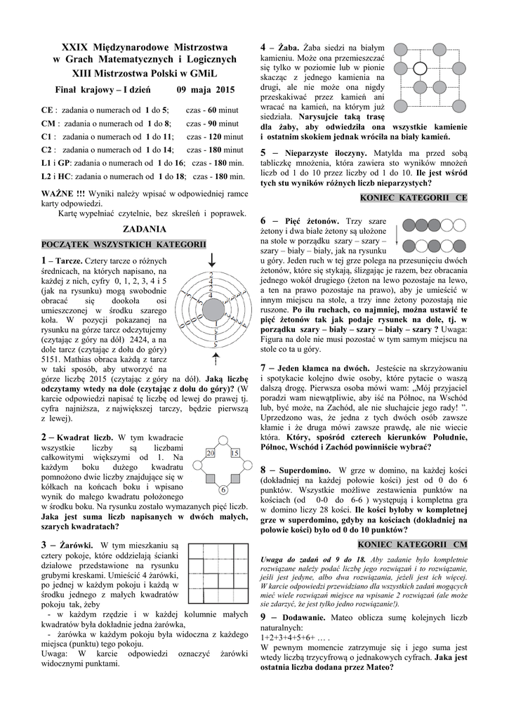 XXIX Międzynarodowe Mistrzostwa w Grach Matematycznych i Logicznych XIII Mistrzostwa Polski w GMiL 4 – Żaba. Żaba siedzi na białym CE : zadania o numerach od 1 do 5; czas - 60 minut CM : zadania o numerach od 1 do 8; czas - 90 minut C1 : zadania o numerach od 1 do 11; czas - 120 minut kamieniu. Może ona przemieszczać się tylko w poziomie lub w pionie skacząc z jednego kamienia na drugi, ale nie może ona nigdy przeskakiwać przez kamień ani wracać na kamień, na którym już siedziała. Narysujcie taką trasę dla żaby, aby odwiedziła ona wszystkie kamienie i ostatnim skokiem jednak wróciła na biały kamień. C2 : zadania o numerach od 1 do 14; czas - 180 minut 5 – Nieparzyste iloczyny. Matylda ma przed sobą L1 i GP: zadania o numerach od 1 do 16; czas - 180 min. tabliczkę mnożenia, która zawiera sto wyników mnożeń liczb od 1 do 10 przez liczby od 1 do 10. Ile jest wśród tych stu wyników różnych liczb nieparzystych? Finał krajowy – I dzień 09 maja 2015 L2 i HC: zadania o numerach od 1 do 18; czas - 180 min. WAŻNE !!! Wyniki należy wpisać w odpowiedniej ramce karty odpowiedzi. Kartę wypełniać czytelnie, bez skreśleń i poprawek. ZADANIA POCZĄTEK WSZYSTKICH KATEGORII 1 – Tarcze. Cztery tarcze o różnych średnicach, na których napisano, na każdej z nich, cyfry 0, 1, 2, 3, 4 i 5 (jak na rysunku) mogą swobodnie obracać się dookoła osi umieszczonej w środku szarego koła. W pozycji pokazanej na rysunku na górze tarcz odczytujemy (czytając z góry na dół) 2424, a na dole tarcz (czytając z dołu do góry) 5151. Mathias obraca każdą z tarcz w taki sposób, aby utworzyć na górze liczbę 2015 (czytając z góry na dół). Jaką liczbę odczytamy wtedy na dole (czytając z dołu do góry)? (W karcie odpowiedzi napisać tę liczbę od lewej do prawej tj. cyfra najniższa, z największej tarczy, będzie pierwszą z lewej). 2 – Kwadrat liczb. W tym kwadracie wszystkie liczby są liczbami całkowitymi większymi od 1. Na każdym boku dużego kwadratu pomnożono dwie liczby znajdujące się w kółkach na końcach boku i wpisano wynik do małego kwadratu położonego w środku boku. Na rysunku zostało wymazanych pięć liczb. Jaka jest suma liczb napisanych w dwóch małych, szarych kwadratach? 3 – Żarówki. W tym mieszkaniu są cztery pokoje, które oddzielają ścianki działowe przedstawione na rysunku grubymi kreskami. Umieścić 4 żarówki, po jednej w każdym pokoju i każdą w środku jednego z małych kwadratów pokoju tak, żeby - w każdym rzędzie i w każdej kolumnie małych kwadratów była dokładnie jedna żarówka, - żarówka w każdym pokoju była widoczna z każdego miejsca (punktu) tego pokoju. Uwaga: W karcie odpowiedzi oznaczyć żarówki widocznymi punktami. KONIEC KATEGORII CE 6 – Pięć żetonów. Trzy szare żetony i dwa białe żetony są ułożone na stole w porządku szary – szary – szary – biały – biały, jak na rysunku u góry. Jeden ruch w tej grze polega na przesunięciu dwóch żetonów, które się stykają, ślizgając je razem, bez obracania jednego wokół drugiego (żeton na lewo pozostaje na lewo, a ten na prawo pozostaje na prawo), aby je umieścić w innym miejscu na stole, a trzy inne żetony pozostają nie ruszone. Po ilu ruchach, co najmniej, można ustawić te pięć żetonów tak jak podaje rysunek na dole, tj. w porządku szary – biały – szary – biały – szary ? Uwaga: Figura na dole nie musi pozostać w tym samym miejscu na stole co ta u góry. 7 – Jeden kłamca na dwóch. Jesteście na skrzyżowaniu i spotykacie kolejno dwie osoby, które pytacie o waszą dalszą drogę. Pierwsza osoba mówi wam: „Mój przyjaciel poradzi wam niewątpliwie, aby iść na Północ, na Wschód lub, być może, na Zachód, ale nie słuchajcie jego rady! ”. Uprzedzono was, że jedna z tych dwóch osób zawsze kłamie i że druga mówi zawsze prawdę, ale nie wiecie która. Który, spośród czterech kierunków Południe, Północ, Wschód i Zachód powinniście wybrać? 8 – Superdomino. W grze w domino, na każdej kości (dokładniej na każdej połowie kości) jest od 0 do 6 punktów. Wszystkie możliwe zestawienia punktów na kościach (od 0-0 do 6-6 ) występują i kompletna gra w domino liczy 28 kości. Ile kości byłoby w kompletnej grze w superdomino, gdyby na kościach (dokładniej na połowie kości) było od 0 do 10 punktów? KONIEC KATEGORII CM Uwaga do zadań od 9 do 18. Aby zadanie bylo kompletnie rozwiązane należy podać liczbę jego rozwiązań i to rozwiązanie, jeśli jest jedyne, albo dwa rozwiązania, jeżeli jest ich więcej. W karcie odpowiedzi przewidziano dla wszystkich zadań mogących mieć wiele rozwiązań miejsce na wpisanie 2 rozwiązań (ale może sie zdarzyć, że jest tylko jedno rozwiązanie!). 9 – Dodawanie. Mateo oblicza sumę kolejnych liczb naturalnych: 1+2+3+4+5+6+ … . W pewnym momencie zatrzymuje się i jego suma jest wtedy liczbą trzycyfrową o jednakowych cyfrach. Jaka jest ostatnia liczba dodana przez Mateo? 10 – Bryła Mathiasa. Mathias ma dwa jednakowe sześciany. Rozcina jeden z nich na sześć jednakowych piramid (ostrosłupów o podstawie kwadratowej mających jako podstawę ścianę sześcianu, a jako wierzchołek środek sześcianu). Następnie nakleja on te sześć piramid na sześciu ścianach drugiego sześcianu sklejając każdą ścianę kwadratową ostrosłupa ze ścianą sześcianu (kwadraty te idealnie pokrywają się). Ile ścian ma otrzymana w ten sposób nowa bryła? 11 - Zabawna siódemka. Jaś napisał dwie kolejne, dodatnie liczby całkowite. Zauważył, że suma cyfr mniejszej z tych dwóch liczb jest podzielna przez 7. Zdziwił się, bo suma cyfr większej liczby także jest podzielna przez 7. Jaka jest mniejsza z tych dwóch liczb, które Jaś napisał jeśli wiadomo, że jest ona mniejsza od miliona? KONIEC KATEGORII C1 12 – Trójkąt i sześciokąt. Trójkąt równoboczny i sześciokąt foremny mają taki