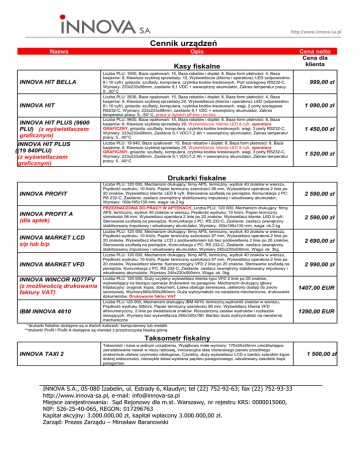 Cennik urządzeń Nazwa Opis Kasy fiskalne INNOVA HIT BELLA INNOVA HIT INNOVA HIT PLUS (9600 PLU) (z wyświetlaczem graficznym) INNOVA HIT PLUS ((19 840PLU) (z wyświetlaczem graficznym) Liczba PLU: 1000, Baza opakowań: 15, Baza rabatów i dopłat: 8, Baza form płatności: 4, Baza kasjerów: 8, Klawisze szybkiej sprzedaży: 10, Wyświetlacze (klienta i operatora): LED (odpowiednio 8 i 10 cyfr), gniazda: szuflady, komputera, czytnika kodów kreskowych, Port szeregowy RS232-C, Wymiary: 233x233x98mm, zasilanie 9,1 VDC + wewnętrzny akumulator, Zakres temperatur pracy: 0...500 C Liczba PLU: 2636, Baza opakowań: 15, Baza rabatów i dopłat: 8, Baza form płatności: 4, Baza kasjerów: 8, Klawisze szybkiej sprzedaży 20, Wyświetlacze (klienta i operatora): LED (odpowiednio 8 i 10 cyfr), gniazda: szuflady, komputera, czytnika kodów kreskowych, wagi, 2 porty szeregowe RS232-C, Wymiary: 233x233x98mm, zasilanie 9,1 VDC + wewnętrzny akumulator, Zakres temperatur pracy: 0...500 C, praca w trybach off-line i on-line Liczba PLU: 9600, Baza opakowań: 15, Baza rabatów i dopłat: 8, Baza form płatności: 8, Baza kasjerów: 8, Klawisze szybkiej sprzedaży 20, Wyświetlacze: klienta LED 8 cyfr, operatora GRAFICZNY, gniazda: szuflady, komputera, czytnika kodów kreskowych, wagi, 3 porty RS232-C, Wymiary: 233x233x98mm, Zasilanie 9,1 VDC/1,2 Ah + wewnętrzny akumulator, Zakres temperatur pracy: 5...400 C Liczba PLU: 19 840, Baza opakowań: 15, Baza rabatów i dopłat: 8, Baza form płatności: 8, Baza kasjerów: 8, Klawisze szybkiej sprzedaży 20, Wyświetlacze: klienta LED 8 cyfr, operatora GRAFICZNY, gniazda: szuflady, komputera, czytnika kodów kreskowych, wagi, 3 porty RS232-C, Wymiary: 233x233x98mm, Zasilanie 9,1 VDC/1,2 Ah + wewnętrzny akumulator, Zakres temperatur pracy: 5...400 C Cena netto Cena dla klienta 999,00 zł 1 090,00 zł 1 450,00 zł 1 520,00 zł Drukarki fiskalne Liczba PLU: 120 000, Mechanizm drukujący: firmy APS, termiczny, wydruk 40 znaków w wierszu, Prędkość wydruku: 10 linii/s, Papier termiczny szerokości 56 mm, Wyświetlacz operatora 2 linie po 20 znaków, Wyświetlacz klienta: LED 8 cyfr, Sterowanie szufladą na pieniądze, Komunikacja z PC: INNOVA PROFIT RS 232-C, Zasilanie: zasilacz zewnętrzny stabilizowany impulsowy i wbudowany akumulator, Wymiary: 160x195x130 mm, waga: ok.2 kg PRZEZNACZONA DO PRACY W APTEKACH, Liczba PLU: 120 000, Mechanizm drukujący: firmy APS, termiczny, wydruk 40 znaków w wierszu, Prędkość wydruku: 10 linii/s, Papier termiczny INNOVA PROFIT A szerokości 56 mm, Wyświetlacz operatora 2 linie po 20 znaków, Wyświetlacz klienta: LED 8 cyfr, (dla aptek) Sterowanie szufladą na pieniądze, Komunikacja z PC: RS 232-C, Zasilanie: zasilacz zewnętrzny stabilizowany impulsowy i wbudowany akumulator, Wymiary: 160x195x130 mm, waga: ok.2 kg Liczba PLU: 120 000, Mechanizm drukujący: firmy APS, termiczny, wydruk 40 znaków w wierszu, Prędkość wydruku: 10 linii/s, Papier termiczny szerokości 57 mm, Wyświetlacz operatora 2 linie po INNOVA MARKET LCD 20 znaków, Wyświetlacz klienta: LCD z podświetleniem lub bez podświetlenia 2 linie po 20 znaków, z/p lub b/p Sterowanie szufladą na pieniądze, Komunikacja z PC: RS 232-C, Zasilanie: zasilacz zewnętrzny stabilizowany impulsowy i wbudowany akumulator, Wymiary 245x230x500mm, Waga: ok. 3kg Liczba PLU: 120 000, Mechanizm drukujący: firmy APS, termiczny, wydruk 40 znaków w wierszu, Prędkość wydruku: 10 linii/s, Papier termiczny szerokości 57 mm, Wyświetlacz operatora 2 linie po 20 znaków, Wyświetlacz klienta: fluorescencyjny VFD 2 linie po 20 znaków, Sterowanie szufladą na INNOVA MARKET VFD pieniądze, Komunikacja z PC: RS 232-C, Zasilanie: zasilacz zewnętrzny stabilizowany impulsowy i wbudowany akumulator, Wymiary 245x230x500mm, Waga: ok. 3kg INNOVA WINCOR ND77FV Liczba PLU: 120 000, Duży czytelny wyświetlacz klienta typu VFD 2 linie po 20 znaków, wyświetlający na bieżąco operacje drukowane na paragonie. Mechanizm drukujący igłowy (z możliwością drukowania trójstacyjny: oryginał, kopia, dokument, Łatwa obsługa serwisowa, ułatwiony dostęp do zwory serwisowej. Wymiary560x300x280mm. Duża wytrzymałość na narażenia mechaniczne, drukowanie faktury VAT) dokumentów, Drukowanie faktur VAT Liczba PLU 120 000, Mechanizm drukujący IBM 4610, termiczny,wydruk40 znaków w wierszu, Prędkość wydruku 50lini/s. Papier termiczny szerokości 80 mm. Wyświetlacz klienta VFD alfanumeryczny, 2 linie po dwadzieścia znaków. Rozszerzony zestaw wydruków i rozkazów IBM INNOVA 4610 sterujących. Wymiary bez wyświetlacza 260x320x190. Bardzo duża wytrzymałość na narażenia mechaniczne *drukarki fiskalne dostępne są w dwóch kolorach: komputerowy lub metalik **drukarki Profit i Profit A dostępne są również z przeźroczystą klapką górną 2 590,00 zł 2 590,00 zł 2 690,00 zł 2 990,00 zł 1407,00 EUR 1290,00 EUR Taksometr fiskalny INNOVA TAXI 2 Taksometr i kasa w jednym urządzeniu, Wyjątkowo małe wymiary: 170x55x55mm umożliwiające zainstalowanie nawet w niszy radiowej, innowacyjna idea otwieranego panelu przedniego znakomicie ułatwia czynności obsługowe, Czytelny, duży wyświetlacz LCD o bardzo szerokim kącie dobrej widoczności, niezwykle łatwa wymiana papieru paragonowego, wbudowany zasobnik kopii paragonów. INNOVA S.A., 05-080 Izabelin, ul. Estrady 6, Klaudyn; tel (22) 752-92-63; fax (22) 752-93-33 http://www.innova-sa.pl, e-mail: [email protected] Miejsce zarejestrowania: Sąd Rejonowy dla m.st. Warszawy, nr rejestru KRS: 0000015060, NIP: 526-25-40-065, REGON: 017296763 Kapitał akcyjny: 3.000.000,00 zł, kapitał wpłacony 3.000.000,00 zł. Zarząd: Prezes Zarządu – Mirosław Baranowski 1 500,00 zł