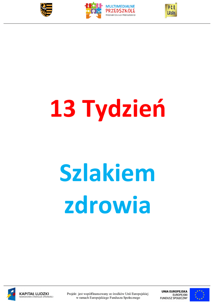 13 Tydzień Szlakiem zdrowia Projekt jest współfinansowany ze środków Unii Europejskiej w ramach Europejskiego Funduszu Społecznego XIII. TEMAT TYGODNIA: SZLAKIEM ZDROWIA Dzień tygodnia: 1 Temat: Co kryje szafa przezornego włóczykija? Co to za para czeka w domu w kłębek zwinięta żebyś ją wreszcie wyjął z kieszeni i nosił na rękach? (rękawiczki) Małe, średnie i duże lubią piesze podróże dobrze służy im szczotka, bardzo szkodzą kałuże? (buty) Kiedy wietrzyk wieje, kiedy śnieżek prószy nosisz ją na głowie, by nie marzły uszy? (czapka) Kolorowy długi na szyi wiązany, nosisz go na sobie ale nie w upale Gdy nadchodzą chłody wyglądasz w nim doskonale. (szalik) Opowiadanie I. Salach Przeziębienie Krzysia. -Co się dzieje z Krzysiem? – zaniepokoiła się pani Hania. –Od kilku dni nie przychodzi do przedszkola! -Przeziębił się i musi leżeć w łóżku – odpowiada Basia – Jest bardzo chory. – odwiedzasz go Basiu? – zapytała pani. -Tak – kiwnęła głową dziewczynka –opowiadam mu codziennie o tym, co się wydarzyło w przedszkolu – dodała zadowolona. -W takim razie opowiedz nam co słychać u Krzysia? –powiedziała pani. -Jest bardzo smutny –Basia opuściła nisko głowę –bo rozchorował się z własnej winy. -Z własnej winy? –zdziwiła się pani. -Tak –Basia znowu kiwnęła głową –gdy wychodził na dwór nie założył czapki ani szala. Dlatego teraz cierpi z tego powodu. –Basia zamyśliła się. Rzeczywiście -zgodziła się pani –to bardzo smutne. Nie słuchał mamy i przeziębił się. -I musi jeść gorzkie lekarstwa –skrzywił się Piotruś –Brr! -Takie gorzkie to one nie są –uśmiechnęła się Basia. –Musi pić dużo Herbaty z lipy. I jego mama zrobiła mu syrop z cebuli. -Syrop z cebuli? –zdziwiły się dzieci –A co to takiego? -No cóż... –powiedziała pani Chorobę leczy się nie tylko lekarstwami z apteki. Przeziębienie można wyleczyć domowymi sposobami, pijąc herbaty ziołowe, syrop z cebuli i cukru albo syrop z czerwonego buraczka. Nawet największy kaszel można wyleczyć takimi syropami. -A czy te syropy są dobre? –zapytały dzieci. -Możemy spróbować –roześmiała się pani –przyniosę cebulę i buraczki, i zrobimy z nich syropy. -Ale jak? –nie dawały spokoju dzieci. -Oj, to bardzo proste –powiedziała pani. Cebulę trzeba pokroić w plasterki, położyć na talerzyku, posypać cukrem i postawić tam gdzie jest ciepło. Po kilku godzinach wypłynie z niej słodki sok. -A buraczek, buraczek? –niecierpliwił się Piotruś -Z buraczkiem jest tak –ciągnęła pani –trzeba go umyć i wydrążyć dużą dziurę w środku. Do tej dziury nasypać cukru.... i czekać aż wypłynie czerwony sok. -To ja powiem o tym mamie Krzysia –powiedziała Basia z wypiekami na policzkach. Projekt jest współfinansowany ze środków Unii Europejskiej w ramach Europejskiego Funduszu Społecznego -Świetnie –odpowiedziała jej pani –na pewno mu nie zaszkodzi. A jeżeli pomoże, to trochę dzięki nam Krzysio prędzej wyzdrowieje. Dzieci były bardzo zadowolone. Zagadki słowne - Od tego zależy dobre zdrowie twe, Wypij, połknij prędko czy jest dobre czy złe. ( lekarstwo) - Gdy masz gorączkę wkładasz go pod rączkę. (termometr) - Kiedy kaszlesz lub masz chrypkę pijesz coś słodkiego to coś ulgę ci przyniesie mój mały kolego. (syrop) - Do tego sklepiku czasami chodzimy po krople , syropki no i witaminy. (apteka) Dzień tygodnia: 2 Temat: Mydło i woda zdrowia Ci doda. Słuchanie wiersza R. Piskorskiego Tak czy nie. Kiedy ktoś ma brudne ręce i rękami tymi je, czy powiecie, że to zdrowo? Bo ja - nie. Kiedy ktoś nie myje zębów, szczotki, proszku ani tknie. Potem zęby go za bolą. Czy wam żal go? Bo mnie – nie. Gdy ktoś przed grzebieniem zmyka, płacząc, ze mu włosy rwie. czy go za to pochwalicie? Bo ja - nie. Komu woda, mydło, szczotka niepotrzebne i nie smak, czy nazwiecie go brudasem? Bo ja - tak. Zagadki związane ze zdrowiem Kiedy masz brudne ręce zaraz je umyje. Umyje też brudne uszy, nogi oraz szyję. Mydło Dodajesz go do wody podczas ciepłej kąpieli. On przyjemnie pachnie i mocno się pieni. Płyn do kąpieli Projekt jest współfinansowany ze środków Unii Europejskiej w ramach Europejskiego Funduszu Społecznego Wycierasz się nim dokładnie, aż będziesz całkiem suchy. Po kąpieli go używają dorośli i maluchy. Ręcznik Bywa w ramach lub bez ramy, często w nim się przeglądamy. Ono zawsze powie szczerze, Czy wyglądasz jak należy. Lustro Wiersza B. Lewandowskiej Na zdrowie. Doktor rybka niech nam powie Jak należy dbać o zdrowie! Kto chce prosty być jak trzcina, Gimnastyką dzień zaczyna! Całe ciało myje co dzień Pod prysznicem, w czystej wodzie. Wie, że zęby białe czyste Lubią szczotkę i dentystę! Pije mleko, wie, że zdrowo Chrupać marchew na surowo. Kiedy kicha czysta chustka Dobrze mu zasłania usta. Chcesz, to zobacz, jak jeść jabłka Na obrazku bez zarazków. Rób tak samo, bo chcesz chyba Tak zdrowy być jak ryba. Dzień tygodnia: 3 Temat: Każdy piechur i turysta dobrym zdrowiem tryska Teatrzyk kukiełkowy pt. Co się stało Kasi? – Dzień dobry dzieci! / pacynka czeka na odpowiedź/ Jestem u mojego dziadka i babci na wsi. Dzisiaj mam wspaniały dzień. Rano zjadłam pyszne śniadanie: chleb z miodem i mleko. Czy Wy lubicie miód i mleko? / odpowiedzi dzieci / Radzę Wam żebyście jadły miód i piły mleko. Dziadek mówi, że po takim śniadaniu będę duża i zdrowa. Potem byłam z dziadkiem na spacerze. Huśtałam się na huśtawce i bawiłam się w piaskownicy. Teraz babcia szykuje obiad, bo po południu pójdziemy na grzyby. O jej! Jestem bardzo głodna. Dziadku, dziadku jestem bardzo głodny! /wchodzi dziadek Staś/ Dziadek Staś : - O, dzień dobry dzieci! Kasiu, babcia jeszcze nie przygotowała obiadu. Jeżeli jesteś głodna, to zjedz Jabłuszko. Tylko nie zapomnij go umyć przed jedzeniem! A czy m