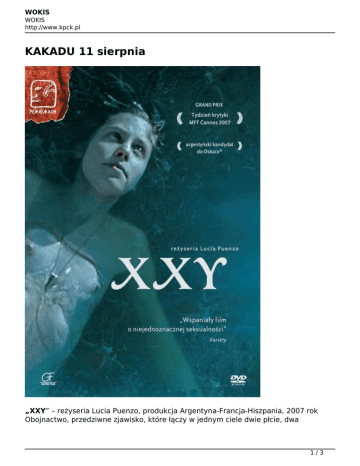 WOKIS WOKIS http://www.kpck.pl KAKADU 11 sierpnia „XXY” – reżyseria Lucia Puenzo, produkcja Argentyna-Francja-Hiszpania, 2007 rok Obojnactwo, przedziwne zjawisko, które łączy w jednym ciele dwie płcie, dwa 1/3 WOKIS WOKIS http://www.kpck.pl przeciwstawne bieguny, które choć tak różne dopełniają się wzajemnie. Film ukazuje życie 15letnej Alex, która jest hermafrodytą. Jednak trudność sprawia określenie Alex jako kobiety lub mężczyzny. Na myśli przychodzi nagrodzona Hugo i Nebulą książka „Lewa ręka ciemności” autorstwa Ursuli K. Le Guin. Film trudny, opowiadający o poszukiwaniu własnego „Ja” w tak trudnym okresie życia jakim jest dojrzewanie. Pytanie brzmi: dojrzewaniem do czego? Do męskości czy do kobiecości? Zapraszamy na film! Wybrane nagrody: • Grand Prix Międzynarodowego Tygodnia Krytyki MFF Cannes 2007 • Złota Atena za najlepszy film MFF Ateny 2007 • 6 nagród Argentyńskiej Akademii Filmowej: najlepszy film, reżyseria, aktor drugoplanowy, debiut reżyserski, scenariusz adoptowany i odkrycie aktorskie • Nagroda dla najlepszego nowego reżysera MFF Edynburg 2007 • Nagroda publiczności na 3. festiwalu FILMY ŚWIATA ALE KINO! „Czy znasz ten symbol? – spytałem. Przyglądał mu się dłuższą chwilę z dziwnym wyrazem twarzy. – Nie – powiedział. – Spotyka się go na Ziemi, na Hain i na Cziffewar. To Yin i Yang. „Światło jest lewą ręką ciemności…”, jak to szło? Światło i ciemność. Strach i odwaga. Zimno i ciepło. Żeńskie i męskie. To jesteś ty, Therem. Oba w jednym. Cień na śniegu”. Lewa ręka ciemności, Ursula K. Le Guin, 1969. Natalia Dybowska & Julian Waszak Plakat pobrano ze strony filmweb.pl 2/3 WOKIS WOKIS http://www.kpck.pl 3/3 Powered by TCPDF (www.tcpdf.org)