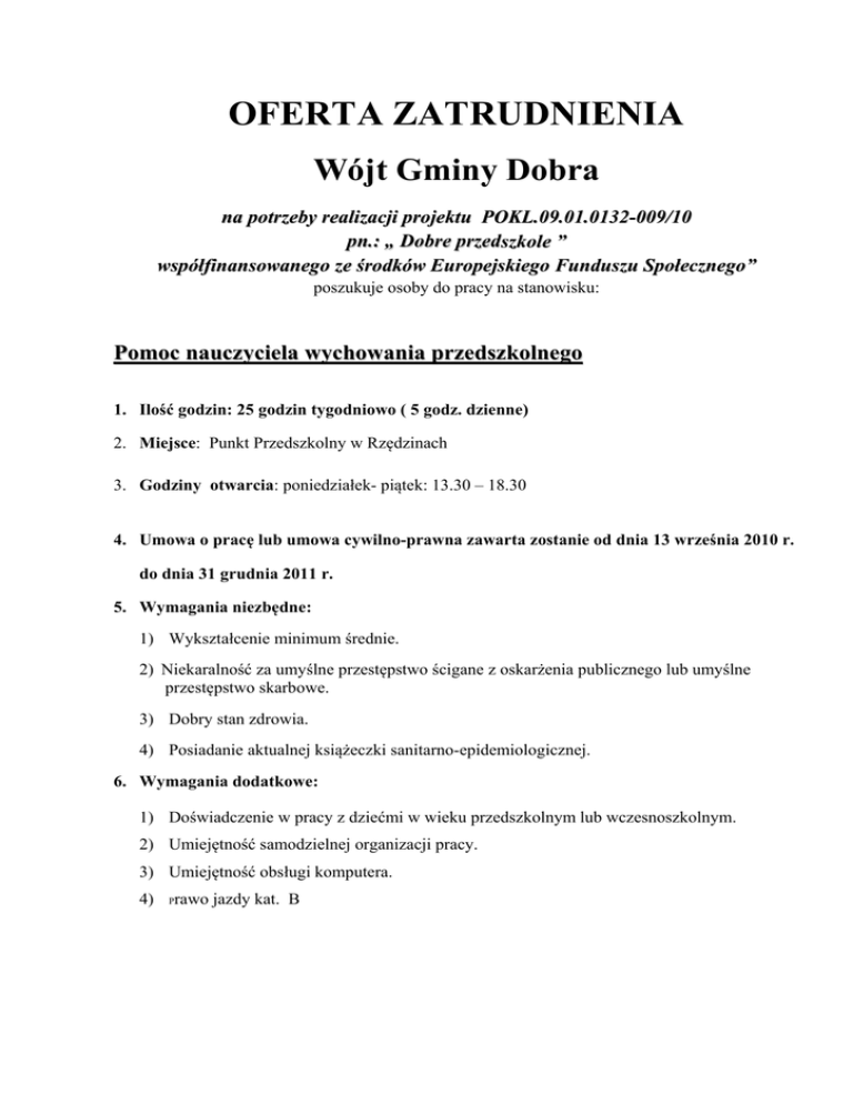OFERTA ZATRUDNIENIA Wójt Gminy Dobra na potrzeby realizacji projektu POKL.09.01.0132-009/10 pn.: „ Dobre przedszkole ” współfinansowanego ze środków Europejskiego Funduszu Społecznego” poszukuje osoby do pracy na stanowisku: Pomoc nauczyciela wychowania przedszkolnego 1. Ilość godzin: 25 godzin tygodniowo ( 5 godz. dzienne) 2. Miejsce: Punkt Przedszkolny w Rzędzinach 3. Godziny otwarcia: poniedziałek- piątek: 13.30 – 18.30 4. Umowa o pracę lub umowa cywilno-prawna zawarta zostanie od dnia 13 września 2010 r. do dnia 31 grudnia 2011 r. 5. Wymagania niezbędne: 1) Wykształcenie minimum średnie. 2) Niekaralność za umyślne przestępstwo ścigane z oskarżenia publicznego lub umyślne przestępstwo skarbowe. 3) Dobry stan zdrowia. 4) Posiadanie aktualnej książeczki sanitarno-epidemiologicznej. 6. Wymagania dodatkowe: 1) Doświadczenie w pracy z dziećmi w wieku przedszkolnym lub wczesnoszkolnym. 2) Umiejętność samodzielnej organizacji pracy. 3) Umiejętność obsługi komputera. 4) rawo jazdy kat. B P 7. Zakres zadań do wykonania: 1) Współpraca z nauczycielem wychowania przedszkolnego, z terapeutami i instruktorami. 2) Pomoc dzieciom w czynnościach codziennych ( pomoc przy ubieraniu, przy sprzątaniu i innych czynnościach ). 3) Pomoc przy posiłkach ( rozdawanie posiłków i pomoc dzieciom ). 4) Pomoc w zachowaniu bezpieczeństwa w trakcie wycieczek i spacerów. 5) Pomoc w pilnowaniu dzieci w trakcie zabaw w pomieszczeniach i w ogródku przedszkolnym. 6) Realizowanie innych zadań zleconych przez nauczyciela lub koordynatora projektu, a wynikających z bieżącej działalności placówki. 7) Przygotowywanie pomocy dydaktycznych i materiałów potrzebnych do pracy. 8) Informowanie niezwłocznie pracodawcy o nieobecności w pracy z powodu choroby lub innej przyczyny, w celu przygotowania zastępstw w prowadzonym przez niego oddziale. 9) Dbanie o estetykę i kulturę w miejscu pracy. 10) Otwieranie i zamykanie obiektu. 11) Informowanie na bieżąco rodziców/opiekunów prawnych dziecka w przypadkach zaobserwowania u dzieci objawów choroby. Oferta powinna zawierać następujące dokumenty: 1. Życiorys z opisem dotychczasowej działalności zawodowej (CV). 2. List motywacyjny. 3. Kwestionariusz osobowy. <<-Pobierz 4. Kopie dyplomów oraz innych dokumentów potwierdzających posiadane wykształcenie i kwalifikacje. 5. Kopie świadectw pracy. 6. Kserokopia aktualnej książeczki sanitarno-epidemiologicznej. 7. Oświadczenie, że kandydat nie był karany za umyślne przestępstwo ścigane z oskarżenia publicznego lub umyślne przestępstwo skarbowe. 8. Oświadczenie kandydata o dobrym stanie zdrowia pozwalającym na zatrudnienie na stanowisku pomocy nauczyciela wychowania przedszkolnego. Wymagane dokumenty należy składać w terminie do dnia 3.09.2010 r. do godziny 15.00 pod adresem: Urząd Gminy, ul. Szczecińska 16a, 72-003 Dobra w zamkniętych kopertach z dopiskiem: „Pomoc nauczyciela wychowania przedszkolnego” Wymagane dokumenty aplikacyjne: list motywacyjny, szczegółowe CV (z uwzględnieniem dokładnego przebiegu kariery zawodowej), powinny być podpisane i opatrzone klauzulą: „Wyrażam zgodę na przetwarzanie moich danych osobowych zawartych w ofercie dla potrzeb niezbędnych do realizacji procesu rekrutacji zgodnie z Ustawą z dnia 29.08.1997 r. o ochronie danych osobowych (Dz. U. z 2002 r. Nr 101, poz. 926 z późniejszymi zmianami.”. Bliższe informacje można uzyskać pod nr telefonu: 91 311 36 18 – Koordynator projektu Małgorzata Redak. Informacja o dokonaniu wyboru złożonej oferty zostanie zamieszczona na stronie internetowej pod adresem: www.bip.dobraszczecinska.pl ..................................................... (podpis Kierownika jednostki)
