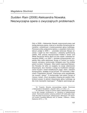 Magdalena Stochniol Sudden Rain (2008) Aleksandra Nowaka. Niezwyczajna opera o zwyczajnych problemach Gdy w 2008 r. Aleksander Nowak rozpoczynał pracę nad swoją pierwszą operą, miał już w dorobku kompozycje kameralne i orkiestrowe z towarzyszeniem głosu ludzkiego. Pierwsze próby połączenia śpiewu z zespołem instrumentalnym podjął w 2005 r. – powstała wówczas Wyspa wichrów i mgieł na chór mieszany i orkiestrę symfoniczną (2005). Rok później skomponował Fiddler’s Green and White Savannas Never More na chór męski i orkiestrę kameralną (2006), a w 2007 r. dorobek kompozytorski uzupełniły dwa cykle pieśniowe Songs of Caress na mezzosopran, skrzypce, wiolonczelę i fortepian oraz Trzy krótkie pieśni na tenor i fortepian. Głos ludzki inspirował Aleksandra Nowaka nie tylko ze względu na swoje właściwości ekspresyjne, lecz również z uwagi na możliwość wzbogacenia muzyki o świat dodatkowych pojęć, które, zdaniem kompozytora, działają na jej korzyść. W rozmowie z Marcinem Trzęsiokiem wyznał: „Fascynuje mnie współdziałanie muzyki i słowa”1. A komponując cykl pieśni Songs of Caress, mówił: „Choć nie jestem znawcą ani wielkim miłośnikiem poezji, to jakości ekspresyjne głosu ludzkiego są dla mnie niezwykle inspirujące”2. Podjęcie operowego ga- 1 M. Trzęsiok, Muzyka rzeczywistego świata. Rozmowa z Aleksandrem Nowakiem, „Kwarta” 2011, nr 1(16), s. 4. 2 M. Stochniol, Songs of Caress (2007) Aleksandra Nowaka na tle idei nowego romantyzmu, w: Literatura w kalejdoskopie sztuki. Twórczość poetów i pisarzy polskich XX wieku jako inspiracja dla dzieł muzycznych, plastycznych i filmowych. W 100-lecie urodzin Czesława Miłosza, red. G. Darłak, I. Melson, I. Mida, Katowice 2013, s. 119. 137 Res Facta Nova 14(23).indd 137 2014-02-26 11:40:47 tunku było zatem dla kompozytora naturalnym krokiem na drodze poszukiwań twórczych. Skomponowana w 2008 r. opera kameralna Aleksandra Nowaka Sudden Rain na sopran, baryton, chór mieszany i orkiestrę kameralną to pierwsza i jak dotąd jedyna w dorobku tego kompozytora próba zmierzenia się z dziełem sceniczno-dramatycznym. Prawykonanie kompozycji odbyło się w 2010 r. w ramach cyklu Terytoria organizowanego przez Teatr Wielki – Operę Narodową3. Głównym tematem opery jest brak porozumienia między dwojgiem bliskich sobie ludzi. Aktualność problematyki niesionej przez Sudden Rain wzbudziła zainteresowanie krytyków i słuchaczy, a debiut operowy Nowaka był jednym z niecierpliwiej oczekiwanych. W prasie codziennej pojawiły się liczne notki anonsujące przedstawienie, wywiady z reżyserką przedstawienia Mają Kleczewską4, a także artykuły podejmujące pytanie, jaka powinna być opera XXI w.5 Bezpośrednie reakcje na pojawienie się Sudden rain były, jak się zazwyczaj zdarza, podzielone. W stronę utworu kierowano przede wszystkim dwa zarzuty: nie dość zwarte i nieco banalne libretto oraz zbyt silne zakorzenienie warstwy muzycznej w tradycji. Jako pole inspiracji wskazywano przede wszystkim muzykę pierwszej połowy XX w. Krytycy podkreślali świetny kunszt Nowaka, jednak, ich zdaniem, muzyce brakowało świeżości. Według Ewy Szczecińskiej muzyka opery ubrana w piękne, pastelowe kolory oscyluje stylistycznie między impresjonizmem Debussy’ego a kolorystyczną wyrazistością i ekspresją późnego Messiaena. Nie ma w niej miejsca na eksperymentowanie. Nowak wykorzystuje dawno sprawdzone harmonie, faktury i instrumentacyjne chwyty – bezwstydnie sięga po techniki sprzed wielu lat i w prosty, naturalny sposób wykorzystuje do własnych ekspresyjno-teatralnych celów6. Choć wpływ Messiaena i Debussy’ego na brzmienie kompozycji wydaje się zdecydowanie przeceniony, to, zdaniem Szczecińskiej, położenie akcentu na sprawdzone środki muzyczne spowodowało, iż muzyka Sudden Rain stała się wtórna i przewidywalna. Z kolei w „Ruchu Muzycznym” Dorota Kozińska stwierdziła: „Aleksander Nowak dysponuje znakomitym warsztatem, świetnie pisze na głos ludzki (to u nas prawdziwa rzadkość), tka jednak swą tkaninę z nitek wyprutych z innych, nie swoich całości”7. Równie sceptycznie o operze wypowiadał się Michał Mendyk, dla którego problemem okazała się konstrukcja kompozycji. Autor pisał: „Nowak stworzył niemal klasyczną partyturę dramatyczną, opartą na sprawdzonych chwytach impresjonistycznych i ekspresjonistycznych”8. W nieco dalszym fragmencie sam sobie zaprzecza, raz od- 3 Wykonawcami byli Chór i Orkiestra Opery Narodowej pod dyr. Marka Mosia. Obsada: Ona – Ingrida Gapova, On – Tomasz Piluchowski. Spektakl reżyserowała Maja Kleczewska. Oprócz utworu Nowaka tego samego wieczoru zaprezentowana została opera Between Agaty Zubel. 4 M. Fuzowski, Takt goni sceny. Rozmowa z Mają Kleczewską, „Newsweek Polska” 18/10, 7 maja 2010; A.S. Dębowska, Nowe terytoria opery, „Gazeta Wyborcza Stołeczna”, 13 maja 2010. 5 Mowa o tekście M. Mendyka Moniuszko XXI wieku, „Dziennik Gazeta Prawna”, 8 maja 2010. 6 E. Szczecińska, Polska opera współczesna, „Dwutygodnik. Strona kultury”, www.dwutygodnik.com/artykul/939-polska-opera-wspolczesna.html [dostęp: 29.11.2013]. 7 D. Kozińska, Dziwny przypadek dwojga nocną porą, „Ruch Muzyczny” 2010, nr 13, www. ruchmuzyczny.pl/PelnyArtykul.php?Id=1423 [dostęp: 29.11.2013]. 8 M. Mendyk, Triumf wyobraźni, „Dziennik Gazeta Prawna”, 29 maja 2010. 138 Res Facta Nova 14(23).indd 138 2014-02-26 11:40:47 notowując względem tekstu opery: „sprawnie napisany, a momentami nawet błyskotliwy”9, innym razem konstatując: „wątły literacko”, libretto pełne „mielizn”. Lakonicznie o utworze wyraża się Jacek Marczyński, który stwierdza, że muzyka nie podąża za tekstem, lecz jedynie „tworzy klimat”10. Najprzychylniej o Sudden Rain pisał Bronisław Tumiłowicz, dla którego ekspresja muzyczna utworu współgrała z dialogiem głównych postaci. Według T