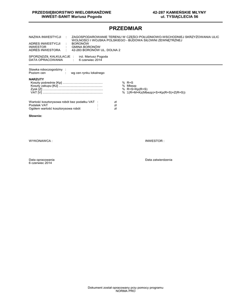 PRZEDSIĘBIORSTWO WIELOBRANŻOWE INWEST-SANIT Mariusz Pogoda 42-287 KAMIEŃSKIE MŁYNY ul. TYSIĄCLECIA 56 PRZEDMIAR NAZWA INWESTYCJI : ADRES INWESTYCJI INWESTOR ADRES INWESTORA : : : ZAGOSPODAROWANIE TERENU W CZĘŚCI POŁUDNIOWO-WSCHODNIEJ SKRZYŻOWANIA ULIC WOLNOŚCI I WOJSKA POLSKIEGO - BUDOWA SIŁOWNI ZEWNĘTRZNEJ BORONÓW GMINA BORONÓW 42-283 BORONÓW UL. DOLNA 2 SPORZĄDZIŁ KALKULACJE : DATA OPRACOWANIA : Stawka roboczogodziny : Poziom cen : inż. Mariusz Pogoda 6 czerwiec 2014 wg cen rynku lokalnego NARZUTY Koszty pośrednie [Kp] ............................................ Koszty zakupu [Kz] ................................................ Zysk [Z] .................................................................. VAT [V] .................................................................. Wartość kosztorysowa robót bez podatku VAT : Podatek VAT : Ogółem wartość kosztorysowa robót : % % % % R+S Mbezp R+S+Kp(R+S) Σ(R+M+Kz(Mbezp)+S+Kp(R+S)+Z(R+S)) zł zł zł Słownie: WYKONAWCA : INWESTOR : Data opracowania 6 czerwiec 2014 Data zatwierdzenia Dokument został opracowany przy pomocy programu NORMA PRO OGÓLNA CHARAKTERYSTYKA OBIEKTU Opracowanie obejmuje kosztorys inwestorski na wykonanie: "ZAGOSPODAROWANIA TERENU W CZĘŚCI POŁUDNIOWO-WSCHODNIEJ SKRZYŻOWANIA ULIC WOLNOŚCI I WOJSKA POLSKIEGO W BORONOWIE - BUDOWA SIŁOWNI ZEWNĘTRZNEJ" Lokalizacja inwestycji: BORONÓW (działka nr 4107/654 , 4106/654) Zakres opracowania obejmuje budowę zewnętrznej siłowni plenerowej składającej się z urządzeń do ćwiczeń w ilości 10szt. Wokoł stanowisk do ćwiczeń zostanie wykonana nawierzchnia tłuczniowa odseperowana od nawierzchni zielonej obrzeżami chodnikowymi. W widocznym miejscu zostanie zabudowana tablica z regulaminem siłowni zewnętrznej. Siłownię zewnętrzną będą charakteryzować następujące parametry: 1/ powierzchnia nawierzchni tłuczniowej - 70,00m2 2/ ilość urządzeń do ćwiczeń - 10kpl 3/ tablica z regulaminem - 1kpl Opracowano na podstawie projektu budowlano-wykonawczego opracowanego przez Przedsiębiorstwo Wielobranżowe INWEST-SANIT Mariusz Pogoda z siedzibą w Kamieńskich Młynach przy ul. Tysiąclecia 56. W kosztorysie ujęto: 1/ roboty pomiarowe 2/ usunięcie humusu w miejscach zabudowy urządzeń 3/ wykopy pod planowane stopy fundamentowe 4/ wykonanie stóp fundamentowych 5/ zabudowa kotew metalowych w stopach 6/ wykonanie rowków pod zabudowę obrzeży 7/ wykonanie ławy oporowej obrzeży 8/ zabudowę obrzeży chodnikowych 9/ wykonanie podbudowy tłuczniowej granitowej 10/ montaż urządzeń do ćwiczeń 11/ montaż tablicy z regulaminem 12/ humusowanie i obsianie terenu przy obrzeżach 13/ inwestaryzację geodezyjną powykonawczą Założenia wyjściowe do kosztorysowania: 1/ grunt kategorii III i IV 2/ roboty ziemne wykonane ręcznie 3/ stopy betonowe 4/ kotwy metalowe M18 5/ urządzenia do ćwiczeń w ilości 10szt 6/ tablica z regulaminem - 1szt 7/ podbudowa tłuczniowa gr 15cm 8/ obrzeża betonowe o wymiarach 6x20x100 na ławie betonowej 9/ wywóz materiałów z wykopów do 1km 10/ humusowanie i obsianie trawą miejsc przy zabudowanych obrzeżach Podstawa wyceny: KNR 2-02, KNR 2-01, KNR W 2-01, KNR 2-31, KNR 4-01, KNR 2-21, Kalkulacje własne Kosztorys sporządzono na podstawie Rozporządzenia Ministra Infrastruktury z dnia 18 maja 2004r. Dz.U.04.130.1389 wraz z późniejszymi zmianami -2- Norma PRO Wersja 4.42 Nr seryjny: 30835 siłownia zewnętrzna Boronów przedmiar Lp. Podstawa 1 1 KNR-W 2-01 d.1 0114-02 analogia 2 KNR 2-01 d.1 0125-04 3 KNR 2-01 d.1 0310-03 PRZEDMIAR Opis i wyliczenia j.m. Roboty ziemne Roboty pomiarowe przy powierzchniowych robotach ziemnych - koryta pod na- ha wierzchnie placów postojowych - korytka pod chodnik, stanowiska do ćwiczeń i nawierzchnię 70/10000 ha Ręczne usunięcie warstwy ziemi urodzajnej (humusu) o grubości do 15 cm z darnią z przewozem taczkami 3.5*2*10 m2 Ręczne wykopy ciągłe lub jamiste ze skarpami o szer.dna do 1.5 m i głębok.do m3 1.5m ze złożeniem urobku na odkład (kat.gr.IV) 0.6*0.6*0.6*10 m3 m3 5 Zabudowa kotew stalowych M18 z końcówkami gwintowanymi w stopach fund.1 kalk. własna damentowych - do montażu urządzeń siłowni zewnętrznej 10 szt 6 KNR 2-31 d.1 0401-02 analogia Rowki pod obrzeża chodnikowe o wymiarach 20x20cm w gruncie kat.III-IV m (3.5+2+2)*poz.5 m 7 KNR 4-01 d.1 0108-07 2 8 KNR 2-31 d.2 0402-03 analogia 9 KNR 2-31 d.2 0407-02 10 KNR 2-31 d.2 0103-02 11 KNR 2-31 d.2 0114-07 analogia m3 szt Wywóz nadmiaru gruntu samochodami samowyładowczymi na odległość do 1 m3 km grunt kat. IV poz.2*0.15+poz.3+poz.6*0.2*0.2 m3 Budowa stanowisk do ćwiczeń Ława pod krawężniki betonowa zwykła - ława pod obrzeże m3 0.04*poz.6 m3 Obrzeża betonowe o wymiarach 20x6 cm na podsypce piaskowej z wypełnieniem spoin piaskiem poz.6 m Profilowanie i zagęszczenie podłoża pod warstwy konstrukcyjne nawierzchni. Wykonywanie ręcznie w gruncie kat. III-IV poz.2 m2 0.00700 RAZEM 0.00700 70.000 RAZEM 70.000 2.160 RAZEM 2.160 2.160 RAZEM 2.160 10.000 RAZEM 10.000 75.000 RAZEM 75.000 15.660 RAZEM 15.660 3.00000 RAZEM 3.00000 m 75.000 RAZEM 75.000 m2 70.000 RAZEM 70.000 70.000 RAZEM 70.000 70.000 RAZEM 70.000 1.000 RAZEM 1.000 1.000 RAZEM 1.000 1.000 RAZEM 1.000 1.000 RAZEM 1.000 Podbudowa z kruszyw naturalnych lub łamanych. Z kruszywa łamanego grani- m2 towego frakcji 0-8mm - warstwa górna grubości 8cm, po zagęszczeniu m2 poz.10 12 KNR 2-31 d.2 0114-08 analogia Razem m2 Stopy fundamentowe betonowe, o objętości do 0,5 m3 - ręczne układanie betonu poz.3 4 KNR 2-02 d.1 0203-01 Poszcz Podbudowa z kruszyw naturalnych lub łamanych. Z kruszywa łamanego grani- m2 towego frakcji 0-8mm - warstwa górna; dodatek za każdy dalszy 1cm grubości podbudowy Krotność = 7 poz.11 m2 3 Montaż urządzeń do ćwiczeń 13 Dostawa i montaż urządzenia do ćwiczeń - wyciąg górny dwustanowiskowy d.3 kalk. własna 1 szt. szt. 14 Dostawa i montaż urządzenia do ćwiczeń - biegacz jedn