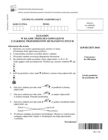Centralna Komisja Egzaminacyjna Układ graficzny © CKE 2010 Arkusz zawiera informacje prawnie chronione do momentu rozpoczęcia egzaminu. UZUPEŁNIA ZESPÓŁ NADZORUJĄCY KOD UCZNIA miejsce na naklejkę z kodem PESEL EGZAMIN W KLASIE TRZECIEJ GIMNAZJUM Z ZAKRESU PRZEDMIOTÓW HUMANISTYCZNYCH Informacje dla ucznia 1. Sprawdź, czy zestaw egzaminacyjny zawiera 13 stron. Ewentualny brak zgłoś nauczycielowi. 2. Czytaj bardzo uważnie wszystkie teksty i zadania. 3. Wszystkie zadania rozwiązuj długopisem lub piórem. 4. Do niektórych zadań są podane cztery odpowiedzi: A, B, C, D. Tylko jedna z nich jest poprawna. Wybierz ją i zaznacz znakiem , np.: A. B. C. D. 5. Jeśli się pomylisz, otocz znak kółkiem i zaznacz inną odpowiedź, np.: A. B. C. D. 6. Gdy przy zadaniu jest taki znak odpowiedź. , to podkreśl wybraną 7. Gdy przy zadaniu jest taki znak w miejscu kropek. Pomyłki przekreślaj. , to napisz odpowiedź 8. Gdy przy zadaniu jest taki znak odpowiedzi, np.: , to połącz strzałkami dobre Kasia uczeń Tomek uczennica KWIECIEŃ 2010 Czas pracy: do 180 minut Liczba punktów do uzyskania: 50 9. W arkuszu znajduje się miejsce na brudnopis. Możesz je wykorzystać, redagując odpowiedź. Zapisy w brudnopisie nie będą sprawdzane i oceniane. Powodzenia! GH-7-102 Od człowieka pierwotnego do ... kosmonauty Przeczytaj uważnie tekst. Tekst I [1] Człowiek zajmuje wśród innych mieszkańców Ziemi miejsce szczególne. Dzięki rozwiniętemu mózgowi, a przede wszystkim dzięki umiejętności mówienia i pisania, jest on w stanie wymieniać myśli i doświadczenia z innymi ludźmi. Potrafi budować wieżowce, konstruować statki kosmiczne, tworzyć dzieła sztuki. Zanim to jednak nastąpiło, człowiek ewoluował, czyli rozwijał się na przestrzeni wielu milionów lat. [2] Najstarszą znaną nam dzisiaj formą człowieka jest australopitek1, który pojawił się na Ziemi około 4 mln lat temu. Jego czaszkę znaleziono w roku 1924 w miejscowości Taung w Afryce Południowej. Potem na Ziemi pojawił się człowiek zręczny (homo habilis), który potrafił wytwarzać2 proste narzędzia, a po nim człowiek wyprostowany (homo erectus). Ślady ich życia pochodzą sprzed blisko 2 mln lat, także z obszarów Czarnego Lądu3. [3] Człowiek wyprostowany miał średniej wielkości mózg. Potrafił posługiwać się ogniem, wytwarzał prymitywne narzędzia kamienne, budował szałasy, polował na duże zwierzęta. To pierwszy gatunek człowieka, który opuścił Afrykę i dotarł do Europy i Azji. Dał też początek neandertalczykowi4 i żyjącemu współcześnie (od około 100 tys. lat) człowiekowi rozumnemu (homo sapiens). [4] Neandertalczyk był myśliwym. Polował na niedźwiedzie, mamuty, konie i renifery. Żył w gromadzie. Zamieszkiwał jaskinie. Jako pierwszy w dziejach ludzkości chował swoich zmarłych, wyposażał ich w przedmioty i pożywienie potrzebne w życiu pozagrobowym. [5] Wraz z rozwojem biologicznym człowieka zmieniały się jego zachowania społeczne, wierzenia i kultura. Na podstawie: Seiler S., Köthe R., Człowiek, Wrocław 1997. Ponaratt R., Człowiek, kultura, cywilizacja, Poznań 2001. Słowniczek: 1 australopitek – dosłownie „południowa małpa”; australopiteki to istoty człowiekowate należące do najstarszych na kuli ziemskiej 2 wytwarzać – wykonywać 3 Czarny Ląd – Afryka 4 neandertalczyk – żył na terenach Europy, Bliskiego Wschodu i Azji około 125 tys. – 35 tys. lat temu, jego szczątki znaleziono w 1856 r. w niemieckiej dolinie Neandertal Na podstawie tekstu I rozwiąż zadania: 1, 2, 3, 4, 5, 6, 7, 8 i 9. Zadanie 1. Zaznacz poprawną odpowiedź. Człowiek zajmuje szczególne miejsce na Ziemi dzięki umiejętności A. B. C. D. poruszania się. zdobywania pożywienia. polowania na duże zwierzęta. komunikowania się za pomocą mowy i pisma. Strona 2 z 13 Zadanie 2. Zaznacz poprawną odpowiedź. Gdzie znaleziono czaszkę najstarszego przodka człowieka? A. B. C. D. W Azji. W Afryce. W Europie. W Australii. Zadanie 3. Uzupełnij schemat odpowiednimi informacjami z ramki. Wpisz w miejscu kropek czas i nazwę przodka człowieka. Skorzystaj także z informacji podanych w słowniczku. neandertalczyk australopitek człowiek wyprostowany ok. 2 mln lat temu ok. 125 tys. – 35 tys. lat temu człowiek rozumny Czas (w latach) Przodkowie człowieka ok. 100 tys. lat ……………………………………………………………… ………………… … ……………………………………………………………… ………………… … człowiek zręczny, …………………………………………... ok. 4 mln lat temu ……………………………………………………………… Strona 3 z 13 Zadanie 4. Napisz obok zdania TAK – gdy zdanie jest prawdziwe, NIE – gdy zdanie jest fałszywe (nieprawdziwe). TAK/ NIE Rozwój człowieka trwał wiele milionów lat. ………… Najstarszą znaną formą człowieka jest australopitek. ………… Pierwszym człowiekiem, który pojawił się w Europie, był człowiek zręczny. ………… Neandertalczyk wierzył w życie pozagrobowe. ………… Zadanie 5. Zaznacz poprawną odpowiedź. Najwięcej informacji na temat współczesnego człowieka znajduje się w akapicie A. B. C. D. pierwszym. drugim. trzecim. czwartym. Zadanie 6. Wypisz z tekstu I trzy informacje na temat człowieka wyprostowanego. ………………………………………………………………………………………………… ………………………………………………………………………………………………… ………………………………………………………………………………………………… ………………………………………………………………………………………………… ………………………………………………………………………………………………… ……………