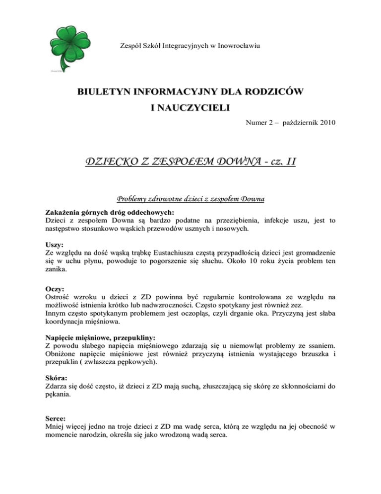 Zespół Szkół Integracyjnych w Inowrocławiu BIULETYN INFORMACYJNY DLA RODZICÓW I NAUCZYCIELI Numer 2 – październik 2010 DZIECKO Z ZESPOŁEM DOWNA - cz. II Problemy zdrowotne dzieci z zespołem Downa Zakażenia górnych dróg oddechowych: Dzieci z zespo łem Downa są bardzo podatne na przeziębienia, infekcje uszu, jest to następstwo stosunkowo wąskich przewodów usznych i nosowych. Uszy: Ze względu na dość wąską trąbkę Eustachiusza częstą przypadłością dzieci jest gromadzenie się w uchu płynu, powoduje to pogorszenie się słuchu. Około 10 roku życia problem ten zanika. Oczy: Ostrość wzroku u dzieci z ZD powinna być regularnie kontrolowana ze względu na możliwość istnienia krótko lub nadwzroczności. Często spotykany jest również zez. Innym często spotykanym problemem jest oczopląs, czyli drganie oka. Przyczyną jest słaba koordynacja mięśniowa. Napięcie mięśniowe, przepukliny: Z powodu słabego napięcia mięśniowego zdarzają się u niemowląt problemy ze ssaniem. Obniżone napięcie mięśniowe jest również przyczyną ist nienia wystającego brzuszka i przepuklin ( zwłaszcza pępkowych). Skóra: Zdarza się dość często, iż dzieci z ZD mają suchą, złuszczającą się skórę ze skło nnościami do pękania. Serce: Mniej więcej jedno na troje dzieci z ZD ma wadę serca, którą ze względu na jej obecność w mo mencie narodzin, określa się jako wrodzoną wadą serca. Rodzaje wrodzonych wad serca: Wspó lny kanał przedsio nkowo-komorowy(AVC) Jest to jedna z najczęstszych wad serca, polega na istnieniu otworu łączącego cztery jamy serca. Występuje u 1 na 6 dzieci z ZD. Wymaga leczenia operacyjnego. Ubytek międzyko morowy (VSD) Występuje u 1 na 10 dzieci z ZD i stanowi dziurę między dwiema komorami. Przetrwały przewód tętniczy (PDA) Spotykany jest u 1 na 50 dzieci z ZD. Wada ta polega na dopływie do płuc nadmiernej ilości krwi na skutek niezamkniętego przewodu tętniczego. Leczenie wiąże się z zabiegie m chirurgicznym. Tetralogia Fallota Co setne dziecko z ZD ma to połączenie czterech wad serca, w t ym duży otwór międz y komorami i zwężenie naczyń prowadzących krew do serca. Leczenie polega na wykonaniu skomplikowanej operacji na otwartym sercu. Metody wspierające rozwój dzieci wykorzystywane w pracy z dziećmi zespołem Downa: Metoda Peto: Istotę metody stanowi po łączenie usprawniania leczniczego, psychopedagogicznego oraz różnych form adaptacji społecznej. Metoda Domana: Są to różnego rodzaju zajęcia o charakterze poznawczym, ruchowym, edukacyjnym angażujące wzrok, słuch, czucie, ruch, mowę oraz sprawność rąk. Metoda Knilla: Istotą programu są ustruktualizowane zajęcia, których ryt m i bieg określa warstwa rytmiczno-muzyczna oraz propozycje terapeuty. Metoda Weroniki Sherborne: Celem metody jest wspo maganie rozwoju dziecka i korekcja jego zaburzeń, szczegó lne miejsce zajmuje w niej wielozmysło wa st ymulacja psycho motoryczna i spo łeczna. Ruch rozwija świado mość własnego ciała, usprawnia przemieszczanie się, poprawia świado mość przestrzeni i ułatwia nawiązywanie kontaktów. Metoda Vojt y: Założeniem tej metody jest pobudzanie odpowiednich pó l koordynacyjnych w układzie nerwowym poprzez stymulowanie określonych punktów ciała. Metoda Dobrego Startu: W tej metodzie zasadniczą rolę odgrywa Słuch( piosenka, wiersz), wzrok( wzór graficzny) i motoryka(wykonywanie ruchów w trakcie odtwarzania wzorów graficznych, sharmonizowanych z ryt mem piosenki) Bibliografia Gdy urodziło Wam się dziecko z zespołem Downa – Instytut wyd. „Świadectwo”; Bydgoszcz 1998 D.Markstein: Jak być matką dziecka z zespołem Downa. Toruń 2002 Opracowały: U. Kubiak M.Pałasz-Kminikowska J. Tuchorska