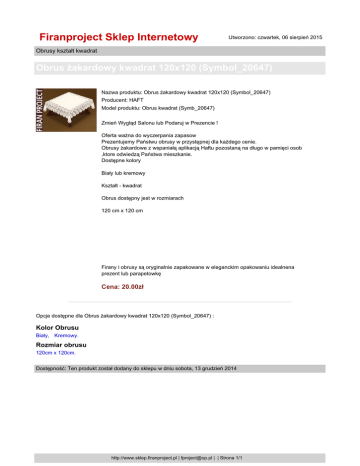 Firanproject Sklep Internetowy Utworzono: czwartek, 06 sierpień 2015 Obrusy kształt kwadrat Obrus żakardowy kwadrat 120x120 (Symbol_20647) Nazwa produktu: Obrus żakardowy kwadrat 120x120 (Symbol_20647) Producent: HAFT Model produktu: Obrus kwadrat (Symb_20647) Zmień Wygląd Salonu lub Podaruj w Prezencie ! Oferta ważna do wyczerpania zapasow Prezentujemy Państwu obrusy w przystępnej dla każdego cenie. Obrusy żakardowe z wspaniałą aplikacją Haftu pozostaną na długo w pamięci osob ,ktore odwiedzą Państwa mieszkanie. Dostępne kolory Biały lub kremowy Kształt - kwadrat Obrus dostępny jest w rozmiarach 120 cm x 120 cm Firany i obrusy są oryginalnie zapakowane w eleganckim opakowaniu idealnena prezent lub parapetowkę Cena: 20.00zł Opcje dostępne dla Obrus żakardowy kwadrat 120x120 (Symbol_20647) : Kolor Obrusu Biały, Kremowy. Rozmiar obrusu 120cm x 120cm. Dostępność: Ten produkt został dodany do sklepu w dniu sobota, 13 grudzień 2014 http://www.sklep.firanproject.pl | [email protected] | | Strona 1/1