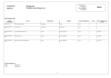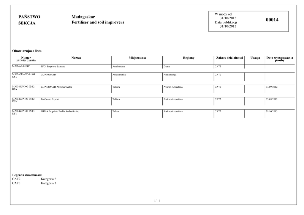 PAŃSTWO SEKCJA W mocy od 31/10/2013 Data publikacji 31/10/2013 Madagaskar Fertiliser and soil improvers 00014 Obowiazujaca lista Numer zatwierdzenia Nazwa Miejscowosc Regiony Zakres dzialalnosci Uwaga Data wystosowania prosby MAD-AA 01 SV PFOI Propriete Lamatra Antsiranana Diana CAT3 MAD–GUANO 01/09 DSV GUANOMAD Antananarivo Analamanga CAT2 MAD-GUANO 03/12 DSV GUANOMAD Akilimarovatse Toliara Atsimo-Andrefana CAT2 03/09/2012 MAD-GUANO 04/12 DSV BatGuano Export Toliara Atsimo-Andrefana CAT2 03/09/2012 MAD-GUANO 05/13 DSV MIMA Propriete Berlin Ambohitsabo Tulear Atsimo-Andrefana CAT2 31/10/2013 Legenda dzialalnosci: CAT2 Kategoria 2 CAT3 Kategoria 3 1/ 1