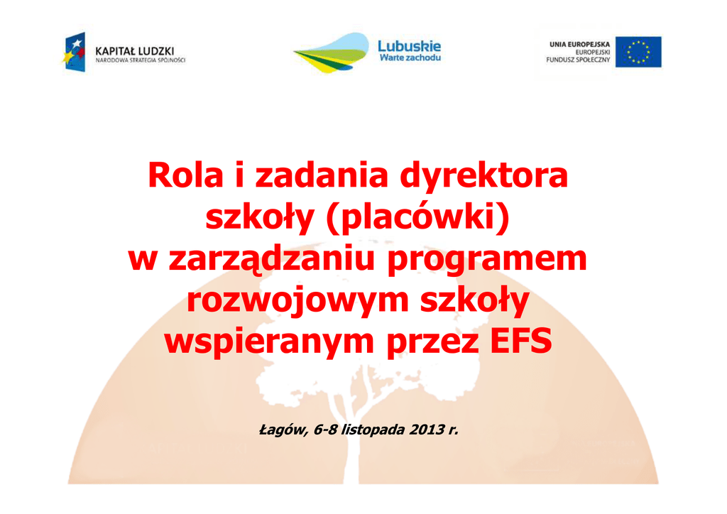 Rola i zadania dyrektora szkoły (placówki) w zarządzaniu programem rozwojowym szkoły wspieranym przez EFS Łagów, 6-8 listopada 2013 r. Elementy szczególnie ważne przy planowaniu programów rozwojowych szkół •Planować działania wzmacniające aspiracje edukacyjne uczniów •Rozbudzające ich ciekawość i aktywność poznawczą •Umożliwianie kontaktu z dobrymi szkołami i uczelniami Elementy szczególnie ważne przy planowaniu programów rozwojowych szkół •Poznawanie ciekawych miejsc pracy •Efektywne wykorzystanie zmodernizowanej bazy dydaktycznej rozwijającej kompetencje kluczowe, szczególnie dotyczące ICT Elementy szczególnie ważne przy planowaniu programów rozwojowych szkół •Zapewnienie możliwości skorzystania z zajęć programowych uczniom, którzy mają utrudniony dostęp do edukacji •Zróżnicowanie oferty edukacyjnej, dopasowanie jej do potrzeb, talentów uczniów, indywidualizację procesu kształcenia Elementy szczególnie ważne przy planowaniu programów rozwojowych szkół •Zapewnienie od poziomu gimnazjum fachowego doradztwa zawodowego obejmującego współpracę z poradnią psychol.-pedag., PUP i pracodawcami •Uwzględnianie w planowaniu programu badań PISA, raportów OKE i CKE oraz wiedzy o edukacyjnej wartości dodanej (EWD) •Wdrażanie uczniów do działań wzbogacających bazę dydaktyczną szkoły (np. prezentacje multimedialne, strony internetowe, filmy, itd.) Elementy szczególnie ważne przy planowaniu programów rozwojowych szkół •Zadbanie o formy doskonalenia nauczycieli uzupełniające wiedzę i umiejętności z zakresu ICT i powodujące wzrost umiejętności dydaktycznych w tym zakresie •Zatrudnienie nowej kadry wzmacniającej zespół projektowy Elementy szczególnie ważne przy planowaniu programów rozwojowych szkół •Uwzględnienie w programie rozwojowym przedsięwzięć wspomagających efektywną realizację programu wychowawczego szkoły •Warto zapewnić prawidłową opiekę pedagogiczno-psychologiczną i logopedyczną Elementy szczególnie ważne przy planowaniu programów rozwojowych szkół •Wdrażanie w klasach I-III innowacyjnych form nauczania (np. z zakresu technik pamięciowych, szybkiego czytania czy wykorzystania tablic interaktywnych) Elementy innowacyjne procesu zarządzania podczas realizacji programów rozwojowych szkół •Planowanie strategiczne, będące w ścisłym związku z polityką edukacyjną państwa i regionu •Umiejętność konstruowania budżetu zadaniowego Elementy innowacyjne procesu zarządzania podczas realizacji programów rozwojowych szkół •Stosowanie myślenia i działania projektowego w rozwiązywaniu problemów szkoły •Wspieranie metody projektu jako sposobu pracy z uczniami Elementy innowacyjne procesu zarządzania podczas realizacji programów rozwojowych szkół •Polityka kadrowa-zatrudnianie i awans nauczycieli, wykazujących się inicjatywą, kreatywnością i pasją •Ocena i premiowanie pracowników mających istotny wpływ na mierzalne i efektywne zmiany w szkole Elementy innowacyjne procesu zarządzania podczas realizacji programów rozwojowych szkół •Budowanie skutecznej komunikacji wewnętrznej i zewnętrznej •Zarządzanie wiedzą Rola i zadania dyrektora w trakcie planowania i realizacji programu rozwojowego szkoły •Właściwa analiza potrzeb szkoły, wynikających z warunków społecznych i demograficznych oraz przyjętej polityki edukacyjnej właściwego organu samorządu (zastosować analizę SWOT) •Właściwy podział zadań i obowiązków w zespole projektowym Rola i zadania dyrektora w trakcie planowania i realizacji programu rozwojowego szkoły •Bieżące czuwanie nad realizacją umowy o dofinansowanie •Zapewnienie osiągnięcia celów i rezultatów zapisanych w projekcie •Właściwe wypełnianie dokumentacji merytorycznej i finansowej oraz gromadzenie odpowiedniej dokumentacji projektowej Rola i zadania dyrektora w przebiegu monitoringu i ewaluacji wewnętrznej programu rozwojowego szkoły Monitoring: •Zatwierdzić i kontrolować realizację programów zajęć dodatkowych dla uczniów •Zatwierdzić i sprawdzać częstotliwość stosowania opracowanych narzędzi diagnozujących postępy uczniów w opanowywaniu kompetencji kluczowych Rola i zadania dyrektora w przebiegu monitoringu i ewaluacji wewnętrznej programu rozwojowego szkoły Monitoring: •Ustalić i kontrolować zasady współpracy nauczycieli wchodzących w skład zespołu projektowego •Określić i kontrolować przebieg procesu dydaktycznego pod kątem efektywnego wykorzystania ICT, aktywizujących metod nauczania, pracy metodą projektu Rola i zadania dyrektora w przebiegu monitoringu i ewaluacji wewnętrznej programu rozwojowego szkoły Ewaluacja: •Ocenić to co zostało osiągnięte i wyjaśnić jak do tego doszło-odpowiedź na pytania: Jakie były nasze oczekiwania? Czy się spełniły? Co zyskaliśmy? •Zidentyfikować mocne i słabe strony programu rozwojowego i w efekcie wykorzystać zdobyte doświadczenie do planowanie kolejnych programów rozwojowych Rola i zadania dyrektora w przebiegu monitoringu i ewaluacji wewnętrznej programu rozwojowego szkoły Ewaluacja: Wskazać nowe możliwości działania i ulepszać program rozwojowy, aby jego realizacja stała się jeszcze bardziej efektywna i dopasowana do oczekiwań uczniów, nauczycieli, rodziców i środowiska lokalnego •Wykorzystać zebrane informacje do podnoszenia profesjonalizmu zespołu projektowego •Propagować i upowszechniać dobre praktyki Zarządzanie finansami programu rozwojowego szkoły wspieranego przez Europejski Fundusz Społeczny Rola i zadania dyrektora w zarządzaniu finansami programu rozwojowego szkoły Zasady kosztów kwalifikowalnych: 1. Zajęcia są uwzględnione w programie rozwojowym szkoły. 2. Ze środków projektu można finansować wynagrodzenie nauczycieli/opiekunów jedynie za pracę wykonywaną poza godzinami wynikającymi ze stosunku pracy nauczyciel