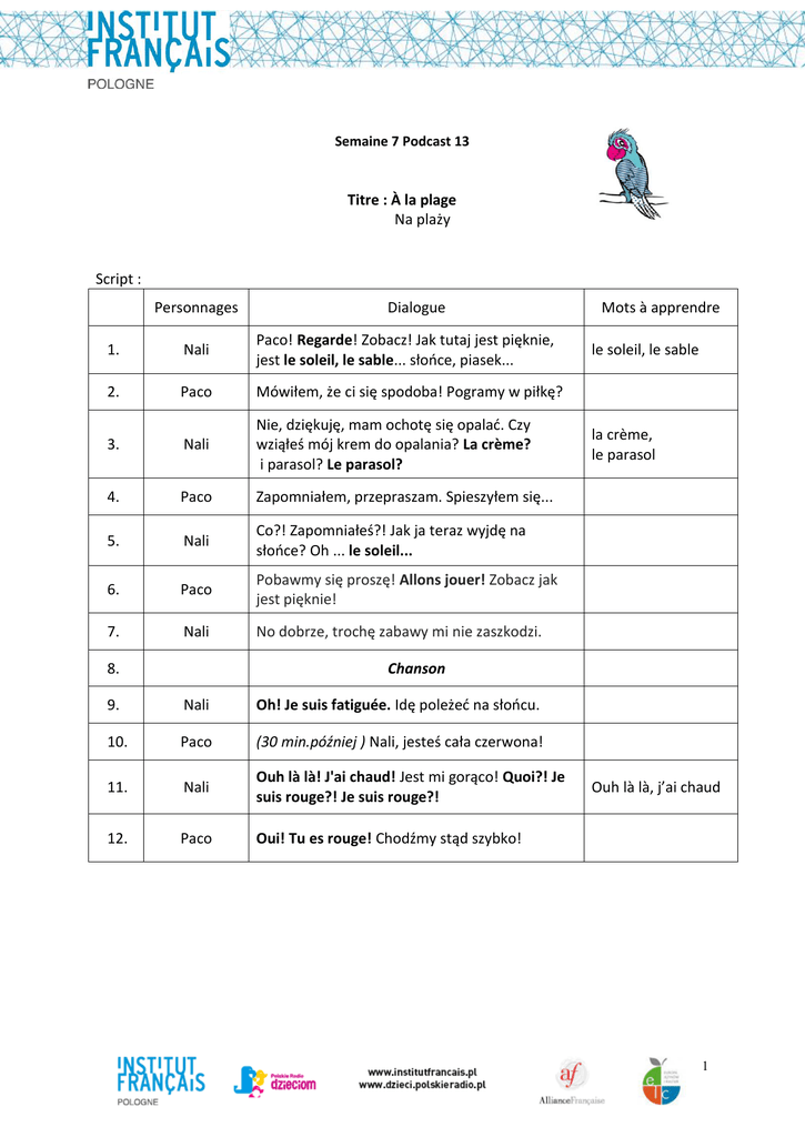 [Texte] Semaine 7 Podcast 13 Titre : À la plage Na plaży Script : Personnages Dialogue 1. Nali Paco! Regarde! Zobacz! Jak tutaj jest pięknie, jest le soleil, le sable... słońce, piasek... 2. Paco Mówiłem, że ci się spodoba! Pogramy w piłkę? 3. Nali Nie, dziękuję, mam ochotę się opalać. Czy wziąłeś mój krem do opalania? La crème? i parasol? Le parasol? 4. Paco Zapomniałem, przepraszam. Spieszyłem się... 5. Nali Co?! Zapomniałeś?! Jak ja teraz wyjdę na słońce? Oh ... le soleil... 6. Paco Pobawmy się proszę! Allons jouer! Zobacz jak jest pięknie! 7. Nali No dobrze, trochę zabawy mi nie zaszkodzi. 8. Mots à apprendre le soleil, le sable la crème, le parasol Chanson 9. Nali Oh! Je suis fatiguée. Idę poleżeć na słońcu. 10. Paco (30 min.później ) Nali, jesteś cała czerwona! 11. Nali Ouh là là! J'ai chaud! Jest mi gorąco! Quoi?! Je suis rouge?! Je suis rouge?! 12. Paco Oui! Tu es rouge! Chodźmy stąd szybko! Ouh là là, j’ai chaud 1 [Texte] Activités : Compréhension globale : Faire écouter l'enregistrement intégralement jusqu’à la chanson. Déballage oral sur la compréhension globale dans le but de répondre aux questions suivantes: - Où se déroule l’action de ce dialogue? - Combien y a-t-il de personnages? - Quel temps fait-il? - Que demande Nali? - Qu'est-ce qu'ils font? On demandera aux élèves de justifier leurs assertions en indiquant ce qu'il convient d'écouter et en attirant l'attention sur le contexte de l'enregistrement (ambiance sonore, voix, mots transparents ...). Une seconde écoute est proposée pour valider les hypothèses. Exploitation didactique : Mettre en place une nouvelle écoute en ciblant particulièrement certains éléments : Par exemple : lever le bras ou se lever lorsqu'on entend les mots : le soleil, le sable, la crème, le parasol, et l'expression « j'ai chaud ». Questionner les élèves : « Qu'est-ce que tu fais à la plage? » Chanson : « Voici les vacances d’été, nous allons nous amuser Du soleil, des châteaux de sable : Ce sera très agréable J’ai pris mon maillot, mes lunettes, et mes sandalettes mon épuisette et ma serviette : Je suis enfin prête Papa, maman, allons tous à la plage ! Cherchons, cherchons, cherchons les crabes, les coquillages Voici les vacances d’été, nous allons nous amuser Du soleil, des châteaux de sable : Ce sera très agréable » Comme cette chanson est difficile, on ne l’apprendra pas par cœur mais on pourra l’utiliser pour des activités de discrimination, on demandera par exemple aux enfants de lever la main lorsqu’ils entendent les mots suivants : le soleil, le sable, le maillot, les lunettes, le papa, la maman, la plage. Les élèves sont encouragés à reprendre les mots de la chanson (Du soleil, des châteaux de sable, mon maillot, mes lunettes, Papa, maman, allons tous à la plage ! ). Expliquer les mots de la chanson. Les acquis de la séance : - L'élève est capable de repérer les mots du texte : le soleil, le sable, la crème, le parasol - Il sait également répondre à la question : qu’est-ce que tu fais à la plage? Je joue dans l'eau, je cherche, je nage, je fais des châteaux de sable - Il peut reprendre certains mots et expressions de la chanson. 2