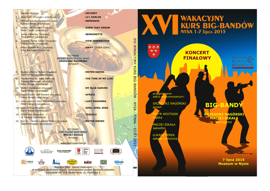 Sammy Nestico - ODYSSEY 2. Neal Hefti (muzyka i aranżacja) - LI’L DARLIN 3. Michael Lloyd i Le Disc (muzyka) Łukasz Perek (aranżacja) - MERENGUE 4. James van Heusen (muzyka) Mark Taylor (aranżacja) - DARN THAT DREAM 5. Julian Adderley (muzyka) Fred Nelson (aranżacja) - SERMONETTE 6. Antonio Carlos Jobim (muzyka) Glenn Osser (aranżacja) - HOW INSENSITIVE 7. Pablo Beltran Ruiz (muzyka) Fred Barovick (aranżacja) - SWAY (QUIEN SERA) BIG-BAND MICKEY WITH FRIEND BAND GRZEGORZ NAGÓRSKI dyrygent 8. Buster i Benny Moten (muzyka) Sammy Nestico (aranżacja) - MOTEN SWING 9. Franke Previte, John DeNicola Donald Markowitz (muzyka) Dave Wolpe (aranżacja) - THE TIME OF MY LIVE 10. Walter Donaldson (muzyka) Dave Wolpe (aranżacja) - MY BLUE HAEVEN 11. David Paich i Jeff Porcaro (muzyka) Steve Wright (aranżacja) - AFRICA 12. John Lennon i Paul McCartney (muzyka) Mike Tomario (aranżacja) - LADY MADONNA 13. Louis Prima (muzyka) Dave Wolpe (aranżacja) - SING, SING, SING 14. Chuck Rio (muzyka) Al Yankee (aranżacja) - TEQUILA 15. (bis) 8. Buster i Benny Moten (muzyka) Sammy Nestico (aranżacja) - MOTEN SWING BIG-BAND EINE KLEINE JAZZ MUSIK MACIEJ SIKAŁA dyrygent www.psm.nysa.com.pl XVI WAKACYJNY KURS BIG-BANDÓW - NYSA - FINAŁ - 07.07.2015 1. KONCERT FINAŁOWY przygotowanie sekcji instrumentalnych: GRZEGORZ NAGÓRSKI puzon PIOTR WOJTASIK trąbka MACIEJ SIKAŁA saksofon BIG-BANDY GRZEGORZ NAGÓRSKI MACIEJ SIKAŁA dyrygenci ŁUKASZ PEREK sekcja rytmiczna 7 lipca 2015 Muzeum w Nysie Nagranie DVD: Janusz Dąbrowski W projekcie graficznym okładki wykorzystane zostały elementy plakatów autorstwa VECTOR Studio Nysa, ul. Prudnicka 3
