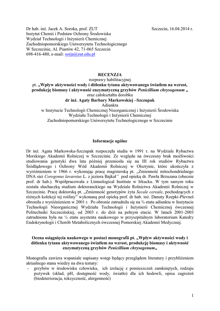 Dr hab. inż. Jacek A. Soroka, prof. ZUT Instytut Chemii i Podstaw Ochrony Środowiska Wydział Technologii i Inżynierii Chemicznej Zachodniopomorskiego Uniwersytetu Technologicznego W Szczecinie, Al. Piastów 42, 71-065 Szczecin 698-416-480, e-mail: [email protected] Szczecin, 16.04.2014 r. RECENZJA rozprawy habilitacyjnej pt. „Wpływ aktywności wody i ditlenku tytanu aktywowanego światłem na wzrost, produkcję biomasy i aktywność enzymatyczną grzybów Penicillium chrysogenum „ oraz całokształtu dorobku dr inż. Agaty Barbary Markowskiej –Szczupak Adiunkta w Instytucie Technologii Chemicznej Nieorganicznej i Inżynierii Środowiska Wydziału Technologii i Inżynierii Chemicznej Zachodniopomorskiego Uniwersytetu Technologicznego w Szczecinie Informacje ogólne Dr inż. Agata Markowska-Szczupak rozpoczęła studia w 1991 r. na Wydziale Rybactwa Morskiego Akademii Rolniczej w Szczecinie. Ze względu na ówczesny brak możliwości studiowania genetyki dwa lata później przeniosła się na III rok studiów Rybactwa Śródlądowego i Ochrony Wód Akademii Rolniczej w Olsztynie, które ukończyła z wyróżnieniem w 1966 r. wykonując pracę magisterską pt. „Zmienność mitochondrialnego DNA siei Coregonus lavaretus L. z jeziora Bajkał” pod opieką dr. Pawła Brzuzana (obecnie prof. dr hab.). Współpracowała z Limnological Institute w Irkucku. W tym samym roku została słuchaczką studium doktoranckiego na Wydziale Rolnictwa Akademii Rolniczej w Szczecinie. Pracę doktorską pt. „Zmienność genotypów żyta Secale cereale, pochodzących z różnych kolekcji tej rośliny” wykonaną pod opieką prof. dr hab. inż. Danuty Rzepki-Plevneš obroniła z wyróżnieniem w 2001 r. Po obronie zatrudniła się na ¾ etatu adiunkta w Instytucie Technologii Nieorganicznej Wydziału Technologii i Inżynierii Chemicznej ówczesnej Politechniki Szczecińskiej, od 2003 r. do dziś na pełnym etacie. W latach 2001-2003 zatrudniona była na ¼ etatu asystenta naukowego w przyszpitalnym laboratorium Katedry Endokrynologii i Chorób Metabolicznych ówczesnej Pomorskiej Akademii Medycznej. Ocena osiągnięcia naukowego w postaci monografii pt. „Wpływ aktywności wody i ditlenku tytanu aktywowanego światłem na wzrost, produkcję biomasy i aktywność enzymatyczną grzybów Penicillium chrysogenum„ Monografia zawiera wspaniale napisany wstęp będący przeglądem literatury i przybliżeniem aktualnego stanu wiedzy na dwa tematy: - grzybów w środowisku człowieka, ich izolację z pomieszczeń zamkniętych, rodzaju pożywek (skład, pH, dostępność wody, światło) dla ich hodowli, opisu zagrożeń (biodeterioracja, toksyczność, alergenność) 1 - roli metali i ich związków, a zwłaszcza ditlenku tytanu(IV), jako czynników antydrobnoustrojowych. Wstęp napisany jest jasno i przystępnie, dzięki czemu ma także niepodważalne walory dydaktyczne. W dalszej części Autorka sformułowała cel badań i konsekwentnie omówiła uzyskane wyniki. Zawarte w tej części pracy informacje budzą mój niepokój, biorąc pod uwagę logikę planowanych eksperymentów, ich prowadzenie a także bezstronność dyskusji uzyskanych wyników. Wszelkie badania doświadczalne prowadzą do wyników obarczonych błędami systematycznymi i przypadkowymi. Jest sprawą niezwykle ważną uwzględnienie ich przy dyskusji. W wielu miejscach Autorka wskazała zmiany istotne statystycznie, co świadczy o bezstronności badawczej, w innych jednak tego nie zrobiła (rysunki 6 i 7 ze stron 39 i 40 nie wykazują obecności miedzi na poziome większym od szumu). Nie wiem, w jakim celu mapowano pierwiastki w pożywce, w tych badaniach nie ma przemian jądrowych, zatem raz wprowadzone pierwiastki pozostają do końca. Mam zastrzeżenia co do regulacji dostępności wody przy pomocy chlorku sodu. Dodany bezpośrednio do pożywki będzie zakłócał II-rzędową i wyższą strukturę białek. Innym efektem, jednakże branym częściowo pod uwagę przez Autorkę jest osmoza, zmieniająca stężenia składników cytoplazmy. Przy tak dużym spektrum potencjalnych zmian dyskusja wpływu dostępności wody na rozwój grzybni jest nieprecyzyjna. Przypuszczam, że zastosowanie innej metody ograniczenia dostępności wody (hodowla w atmosferze o regulowanej wilgotności, np. w szalkach umieszczonych w pojemniku, w którym także znajdują się osobne szalki z solanką o określonym składzie, zastosowanie sacharozy zamiast chlorku sodu itp.) mogłyby doprowadzić do diametralnie różnych wniosków. Niepokój mój budzą także eksperymenty ze światłem, a zwłaszcza z określeniem jego energii wprowadzanej do hodowli. Wyniki wydają się zawyżone, wziąwszy pod uwagę fakt, że w lampie żarowej (ale nie w źródłach LED), w tym halogenowej, światłem widzialnym staje się mniej niż 20% dostarczonej energii – 80% to podczerwień (ciepło). Jaki sens ma jednostka W/(cm2 ∙ nm)? [rys. 13 i 15]. Ponadto, typowe szkło absorbuje UV poniżej 300 nm, zatem szalka Petriego nie powinna absorbować promieniowania AV-A (315-400 nm) We wszystkich eksperymentach najaktywniejszym okazał się TiO2/ ZCh, zawierający dużą część bezpostaciowego TiO2. Jak można sobie zatem wyobrazić sorpcję na fazie bezpostaciowej? To mógłby być koprecypitat, ale nie chodzi tu o słownictwo. Autorka nie podała wszystkich cech tego produktu, np. pH wody, w której go zawieszono? Przypuszczam, że może zawierać on sporo kwasu siarkowego, zatem zmiana odczynu pożywki mogłaby być główną przyczyną obserwowanych zmian. Czytając uważnie monografię habilitacyjną Autorki czuje się wyraźną chęć interpretacji zmian w rozwoju grzybni spowodowaną wyłącznie oddziaływaniem TiO2 na strzępki grzyba. Przeprowadzone doświadczenia zdają się jednak przeczyć takiej interpretacji; jeżeli aktywacji światłem poddawano grzyb razem z pożywką, to fotozmiany dotyczyć mogą jedynie pożywki z dwu powodów: -obszary, na które ma r