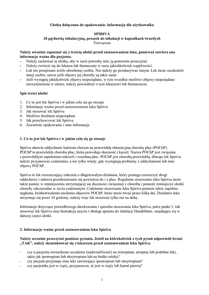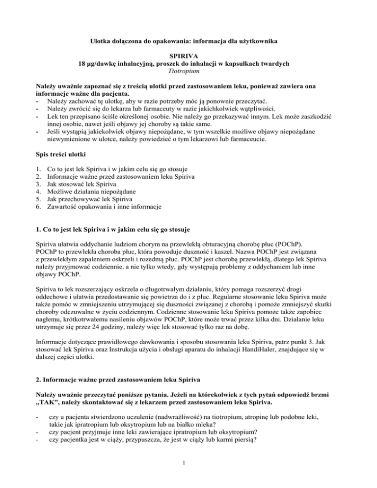 Ulotka dołączona do opakowania: informacja dla użytkownika SPIRIVA 18 μg/dawkę inhalacyjną, proszek do inhalacji w kapsułkach twardych Tiotropium Należy uważnie zapoznać się z treścią ulotki przed zastosowaniem leku, ponieważ zawiera ona informacje ważne dla pacjenta. - Należy zachować tę ulotkę, aby w razie potrzeby móc ją ponownie przeczytać. - Należy zwrócić się do lekarza lub farmaceuty w razie jakichkolwiek wątpliwości. - Lek ten przepisano ściśle określonej osobie. Nie należy go przekazywać innym. Lek może zaszkodzić innej osobie, nawet jeśli objawy jej choroby są takie same. - Jeśli wystąpią jakiekolwiek objawy niepożądane, w tym wszelkie możliwe objawy niepożądane niewymienione w ulotce, należy powiedzieć o tym lekarzowi lub farmaceucie. Spis treści ulotki 1. 2. 3. 4. 5. 6. Co to jest lek Spiriva i w jakim celu się go stosuje Informacje ważne przed zastosowaniem leku Spiriva Jak stosować lek Spiriva Możliwe działania niepożądane Jak przechowywać lek Spiriva Zawartość opakowania i inne informacje 1. Co to jest lek Spiriva i w jakim celu się go stosuje Spiriva ułatwia oddychanie ludziom chorym na przewlekłą obturacyjną chorobę płuc (POChP). POChP to przewlekła choroba płuc, która powoduje duszność i kaszel. Nazwa POChP jest związana z przewlekłym zapaleniem oskrzeli i rozedmą płuc. POChP jest chorobą przewlekłą, dlatego lek Spiriva należy przyjmować codziennie, a nie tylko wtedy, gdy występują problemy z oddychaniem lub inne objawy POChP. Spiriva to lek rozszerzający oskrzela o długotrwałym działaniu, który pomaga rozszerzyć drogi oddechowe i ułatwia przedostawanie się powietrza do i z płuc. Regularne stosowanie leku Spiriva może także pomóc w zmniejszeniu utrzymującej się duszności związanej z chorobą i pomoże zmniejszyć skutki choroby odczuwalne w życiu codziennym. Codzienne stosowanie leku Spiriva pomoże także zapobiec nagłemu, krótkotrwałemu nasileniu objawów POChP, które może trwać przez kilka dni. Działanie leku utrzymuje się przez 24 godziny, należy więc lek stosować tylko raz na dobę. Informacje dotyczące prawidłowego dawkowania i sposobu stosowania leku Spiriva, patrz punkt 3. Jak stosować lek Spiriva oraz Instrukcja użycia i obsługi aparatu do inhalacji HandiHaler, znajdujące się w dalszej części ulotki. 2. Informacje ważne przed zastosowaniem leku Spiriva Należy uważnie przeczytać poniższe pytania. Jeżeli na którekolwiek z tych pytań odpowiedź brzmi „TAK”, należy skontaktować się z lekarzem przed zastosowaniem leku Spiriva. - czy u pacjenta stwierdzono uczulenie (nadwrażliwość) na tiotropium, atropinę lub podobne leki, takie jak ipratropium lub oksytropium lub na białko mleka? czy pacjent przyjmuje inne leki zawierające ipratropium lub oksytropium? czy pacjentka jest w ciąży, przypuszcza, że jest w ciąży lub karmi piersią? 1 - czy u pacjenta występuje jaskra z wąskim kątem przesączania, problemy z prostatą lub trudności w oddawaniu moczu? czy u pacjenta występują jakiekolwiek problemy związane z nerkami? Kiedy nie stosować leku Spiriva - Jeśli pacjent ma uczulenie (nadwrażliwość) na tiotropium, substancję czynną leku lub laktozę jednowodną, która zawiera białko mleka. Jeśli pacjent ma uczulenie (nadwrażliwość) na atropinę lub jej pochodne, takie jak np. ipratropium lub oksytropium. Jeśli pacjent ma mniej niż 18 lat. Ostrzeżenia i środki ostrożności • • • • • • • • Pacjent powinien skontaktować się z lekarzem, jeśli u pacjenta występuje podwyższone ciśnienie wewnątrzgałkowe (jaskra z wąskim kątem przesączania), problemy z prostatą lub trudności w oddawaniu moczu. Pacjent powinien skontaktować się z lekarzem, jeśli u pacjenta występują zaburzenia czynności nerek. Lek Spiriva 18 mikrogramów jest wskazany do leczenia przewlekłej obturacyjnej choroby płuc. Nie należy go stosować do leczenia nagłych napadów duszności lub świszczacego oddechu. Podczas stosowania leku Spiriva mogą wystąpić natychmiastowe reakcje nadwrażliwości, takie jak wysypka, obrzęk, świąd, świszczący oddech i duszność. W takich przypadkach należy natychmiast skontaktować się z lekarzem. Podobnie jak w przypadku innych leków stosowanych wziewnie, bezpośrednio po zastosowaniu leku Spiriva u niektórych pacjentów może wystąpić uczucie ucisku w klatce piersiowej, kaszel, świszczący oddech lub duszność. W takim przypadku należy natychmiast skontaktować się z lekarzem. Nie wolno dopuścić, aby podczas inhalacji bromek tiotropiowy dostał się do oczu, ponieważ może to spowodować wystąpienie lub zaostrzenie objawów jaskry z wąskim kątem przesączania, która jest chorobą oczu. Ból oka lub dyskomfort, niewyraźne widzenie, widzenie tęczowej obwódki wokół źródła światła lub zmienione widzenie kolorów, jednocześnie z zaczerwienieniem oczu mogą być oznaką wystąpienia ostrej jaskry z wąskim kątem przesączania. Zaburzeniom dotyczącym oczu mogą towarzyszyć: ból głowy, nudności i wymioty. Jeżeli wystąpią objawy jaskry z wąskim kątem przesączania należy przerwać stosowanie bromku tiotropiowego i natychmiast skontaktować się z lekarzem, najlepiej okulistą. Suchość błony śluzowej jamy ustnej występująca w czasie stosowania leku, związana z jego przeciwcholinergicznym działaniem, może po dłuższym czasie powodować próchnicę zębów, dlatego należy pamiętać o utrzymaniu higieny jamy ustnej. Leku Spiriva nie należy stosować częściej niż raz na dobę. Dzieci i młodzież Lek Spiriva nie jest zalecany dla dzieci i młodzieży w wieku poniżej 18 lat. Inne leki i Spiriva Należy powiedzieć lekarzowi lub farmaceucie o wszystkich lekach przyjmowanych obecnie lub ostatnio, a także o lekach, które wydawane są bez recepty. W szczególności należy poinformować lekarza lub farmaceutę o innych lekach stosowanych w 